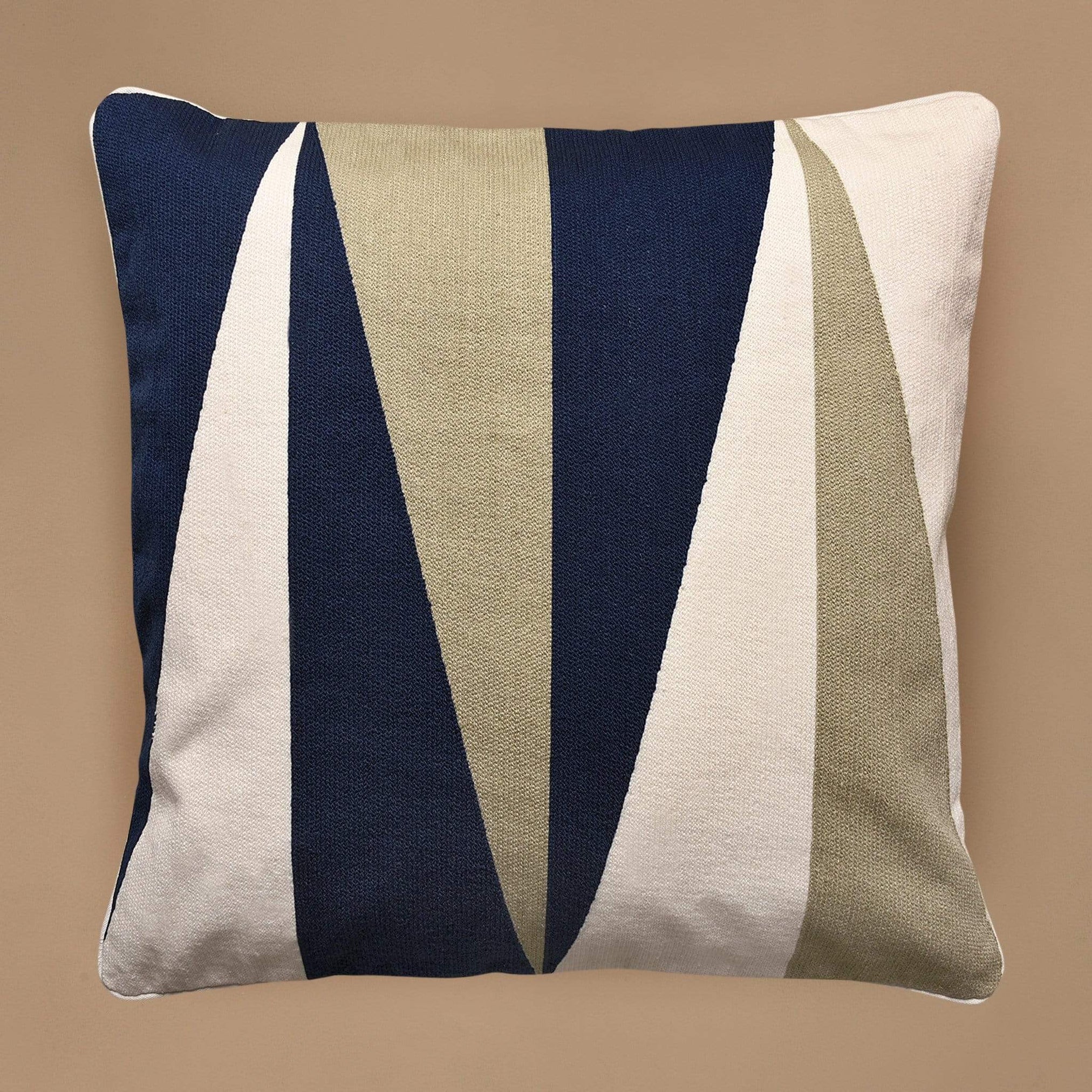 أضف لمسة لذيذة مختلفة إلى أي منطقة جلوس مع هذه الوسادة المربعة المميزة. نمطها الهندسي الكحلي والبيج والكريمي،والسحاب المغطى القوي، والملمس الناعم يجعلها إضافة مثالية إلى ركنتك.