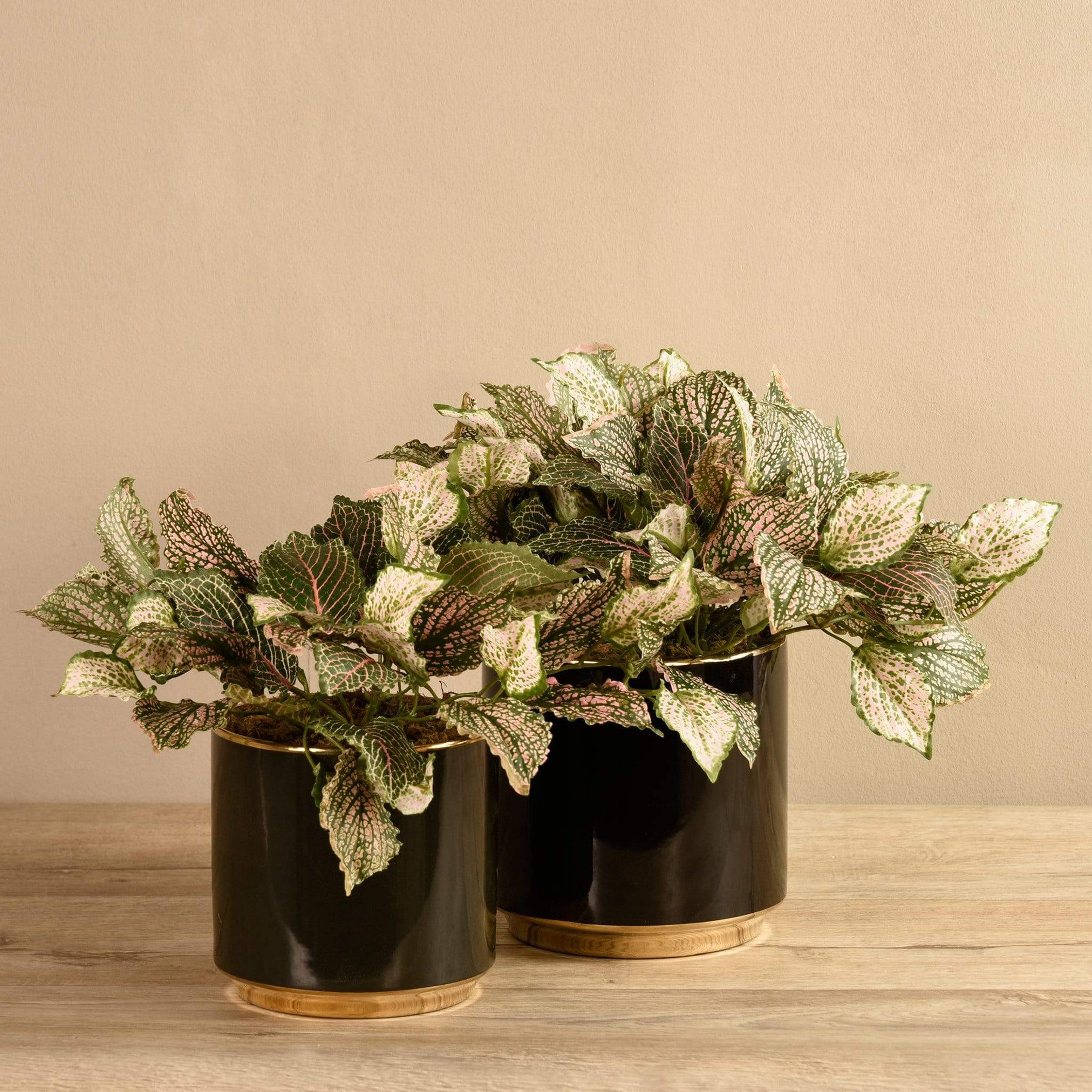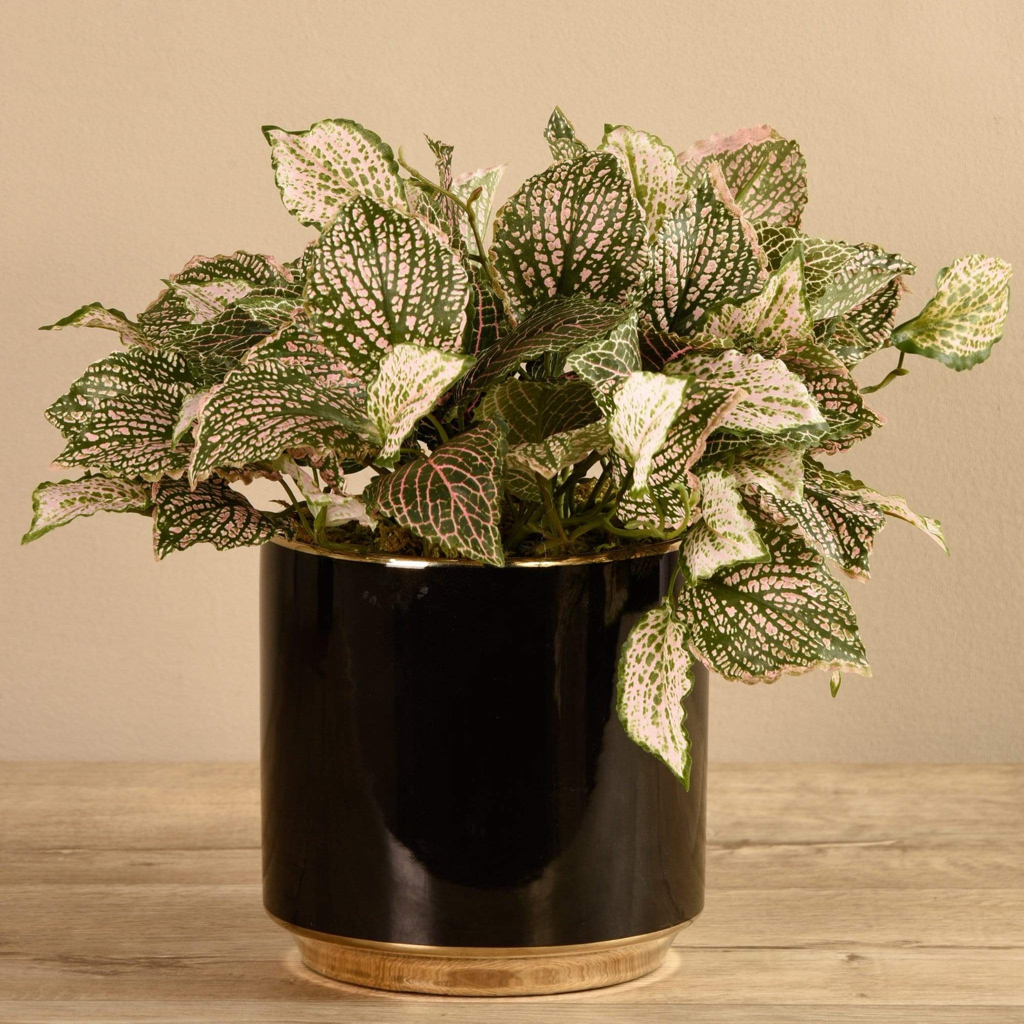 نبتة فيتونييا تضفي لمسة براقة على أي رف أو طاولة في منزلك، رغم بساطتها. تتميز النبتة بمظهر طبيعي تمامًا، لكنها توفر لك أيضًا مزايا النباتات الصناعية مثل عدم الحاجة للعناية المستمرة واحتفاظها بجمالها لسنين طويلة. كما أنها تأتيك في أصيص أسود رقيق ومزين بحواف ذهبية ليبرز جمال أوراقها المميزة باللونين الأبيض والأخضر.
