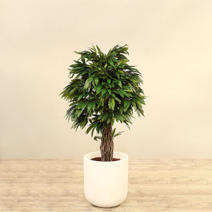 Enjoy this stunning artificial Mango Tree in your home. Mango Trees have a rich history and are symbols of enlightenment and wealth among other things. Freshen up your space with our beautiful faux Mango Tree designed to look and feel just like the real thing. This tall tree arrives fully assembled – simply arrange the branches, place it in a pot of your choosing, and decorate your room.