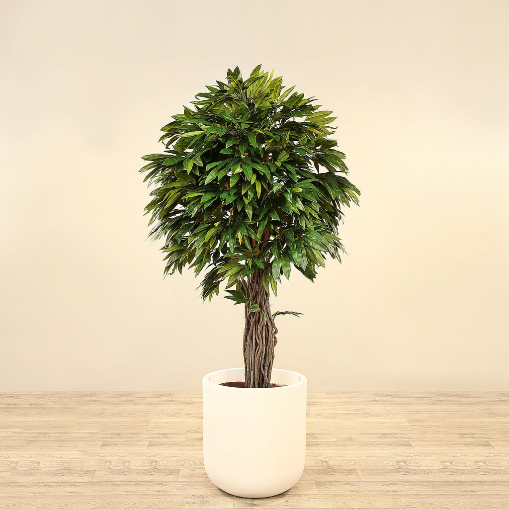 Enjoy this stunning artificial Mango Tree in your home. Mango Trees have a rich history and are symbols of enlightenment and wealth among other things. Freshen up your space with our beautiful faux Mango Tree designed to look and feel just like the real thing. This tall tree arrives fully assembled – simply arrange the branches, place it in a pot of your choosing, and decorate your room.
