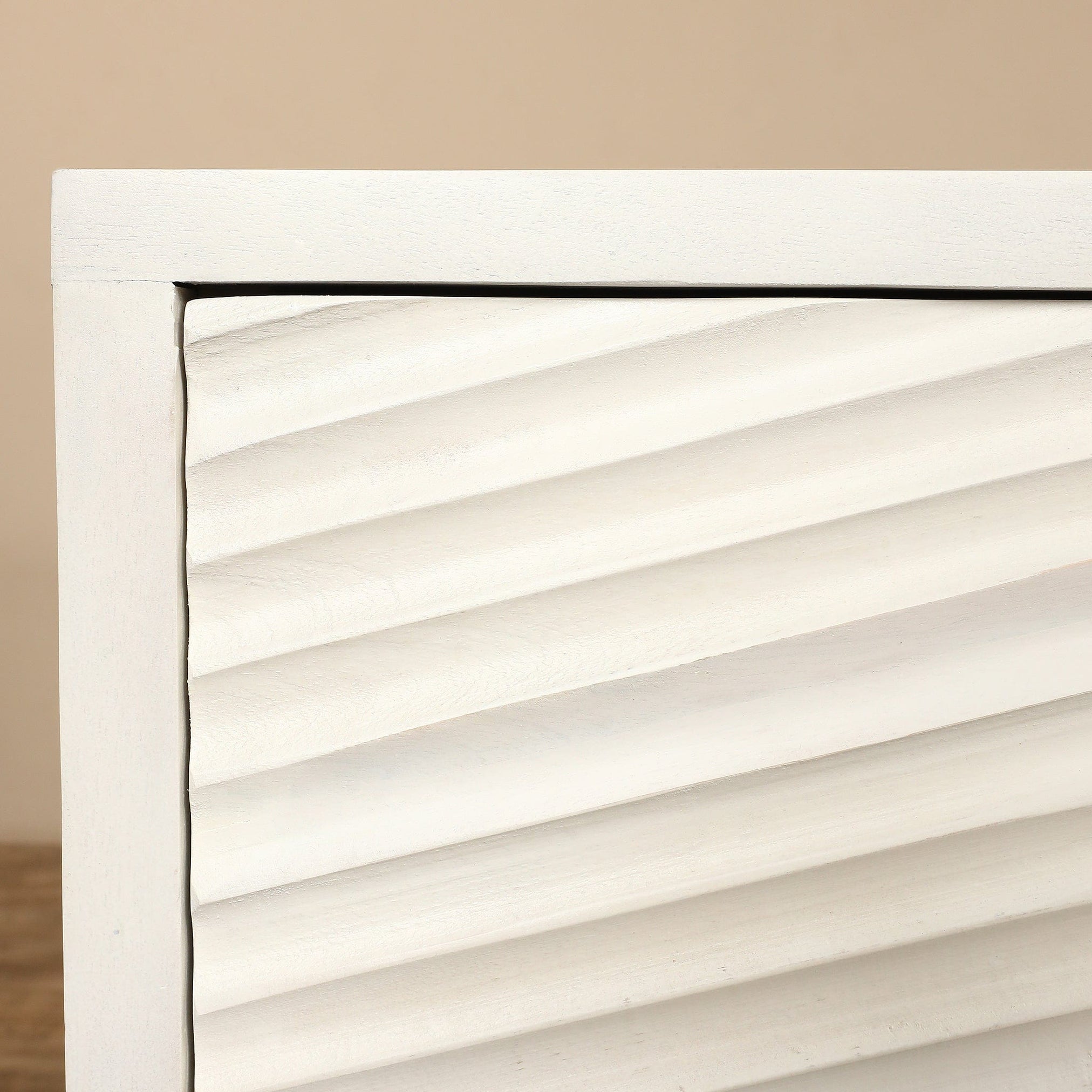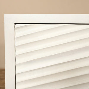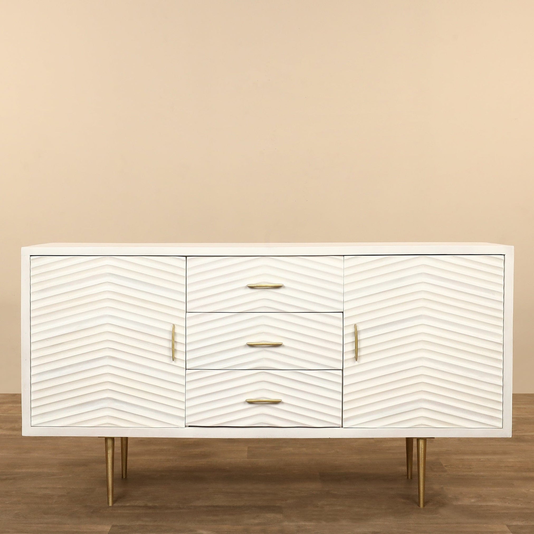 A dramatic carved facade creates a bold statement on this Wooden Sideboard. This Sideboard features generous interior storage in the form of two cabinets and three drawers. The versatile finish is complemented perfectly by shining metal legs and handles to produce a chic look overall.