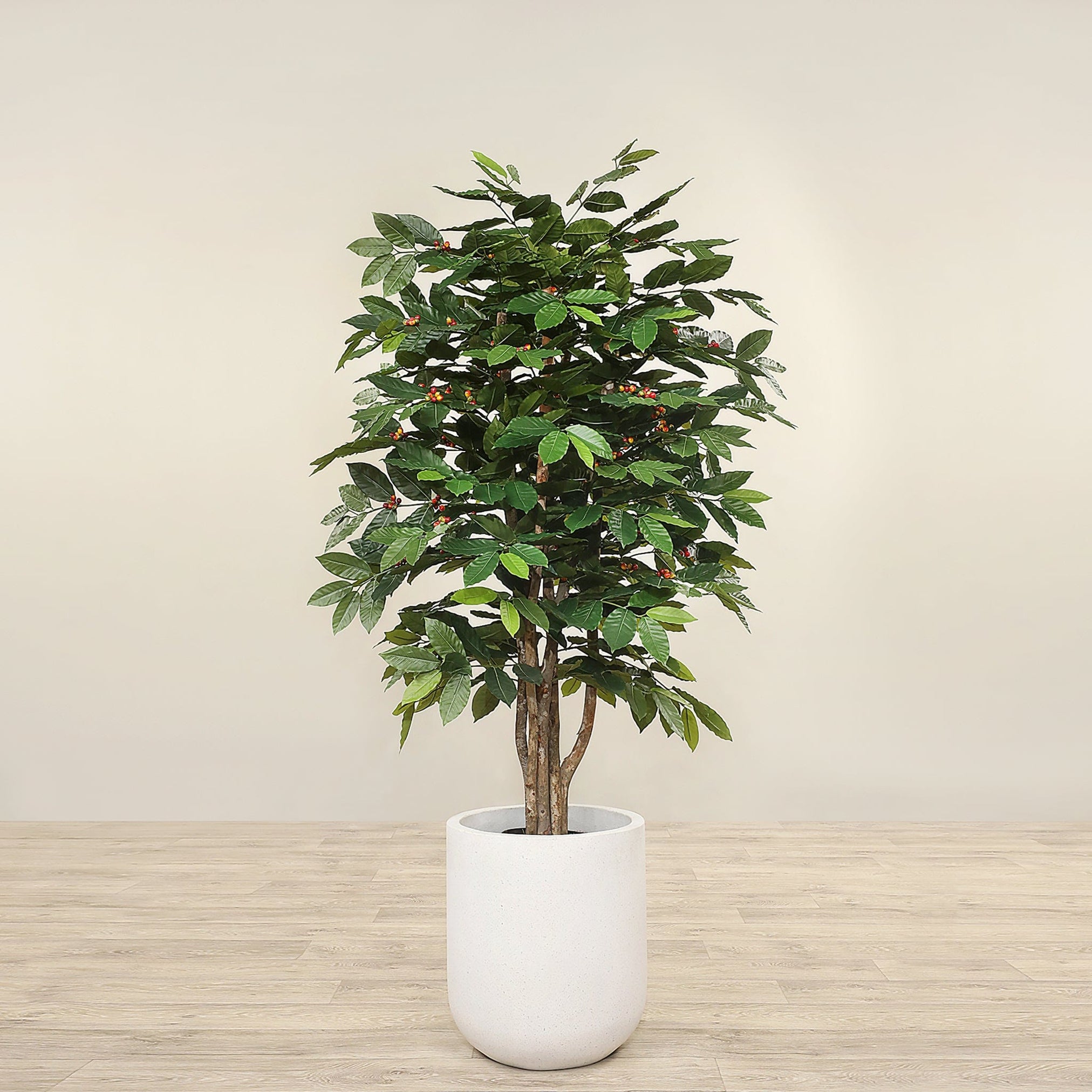 Infuse a space with a summery look with our Artificial Coffee Tree. This beautiful faux plant has lush green leaves and ripening coffee berries perfect for an exotic look in any decor. No more watering, pruning, or repotting! This tree comes fully assembled – simply bend out the branches and place them in a pot of your choice to complete the look.