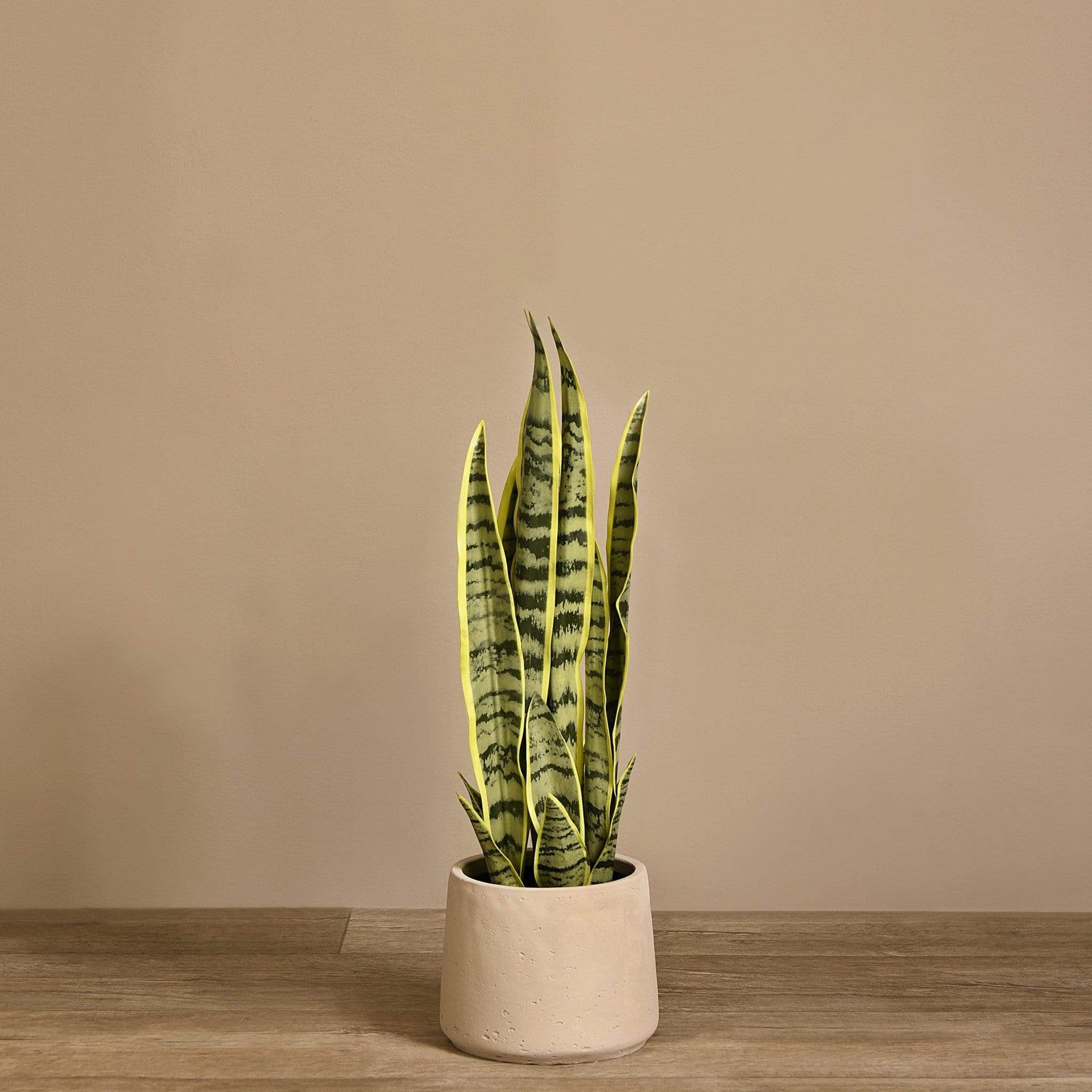 This lifelike sansevieria plant adds color and texture to any interior with its vibrant green and yellow leaves. Place it in a neutral pot of your choice to complete the look.
