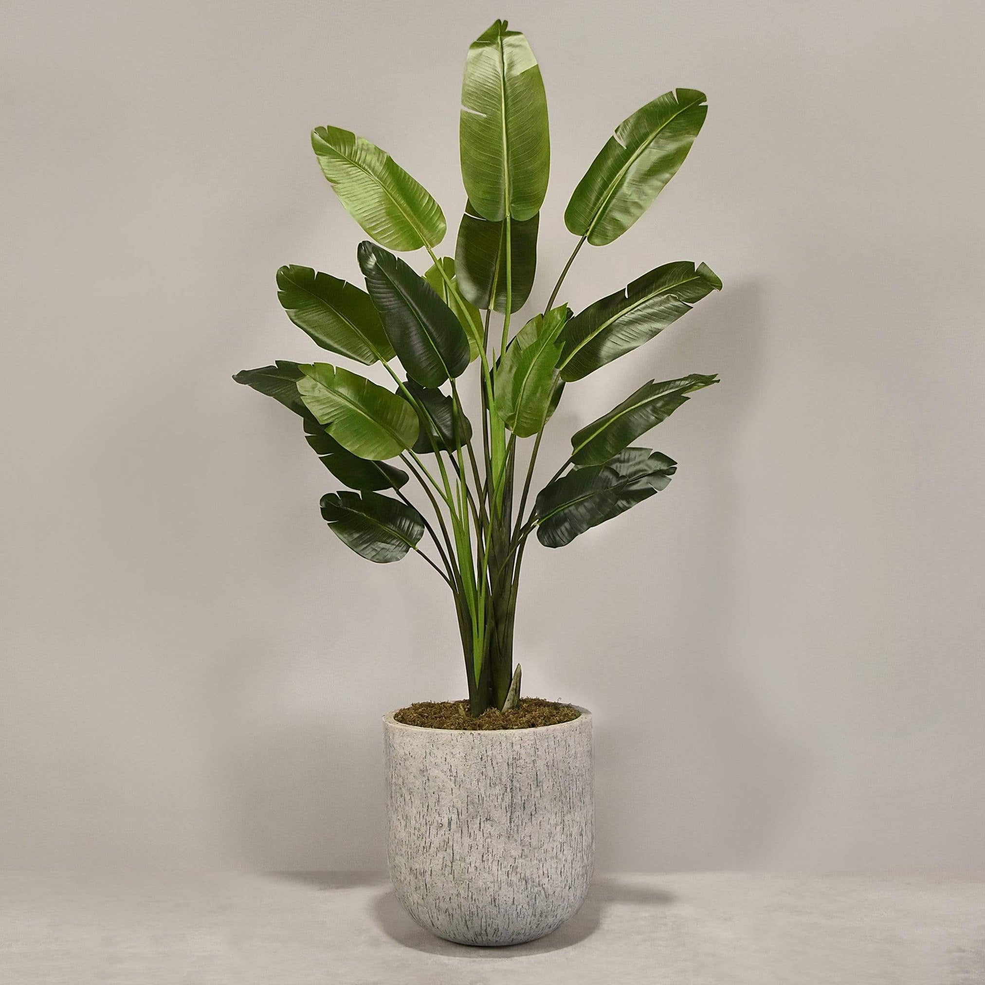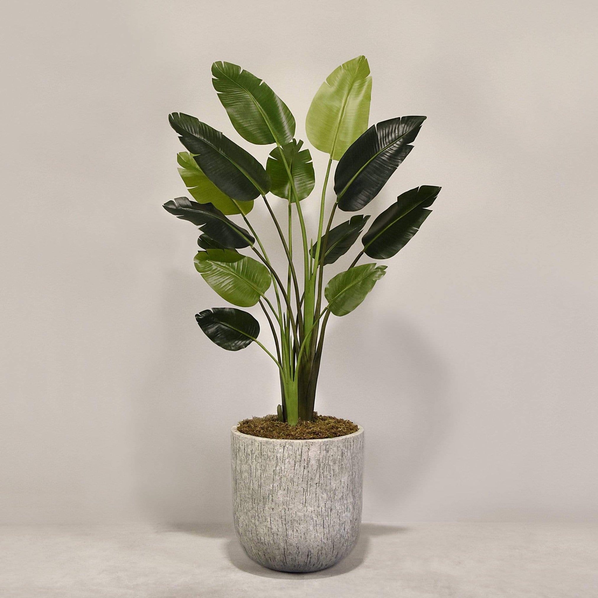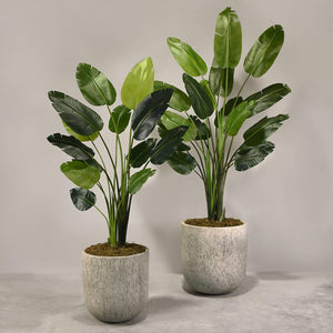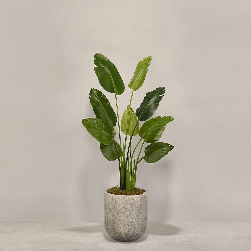 Introduce a distinctive touch to your living space with this artificial Traveler's Palm Tree boasting large, smooth-edged leaves standing at different heights and facing upwards. The lush thicket of stems and foliage created by multiple rising stems adds to its allure. This tree comes fully assembled – simply bend out the branches and decorate your room.