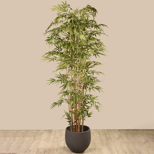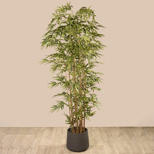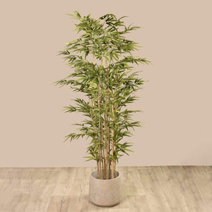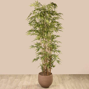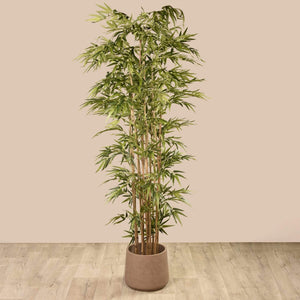 This Artificial Bamboo Tree will bring a warm, tropical air to your home. It seamlessly fills open space without dominating an entire room. So bring out some chilled coconut water, prop up your feet, and enjoy the view of this gorgeous faux tree. This bamboo tree comes fully assembled – just bend out the branches and place in a concrete pot to complete the look.