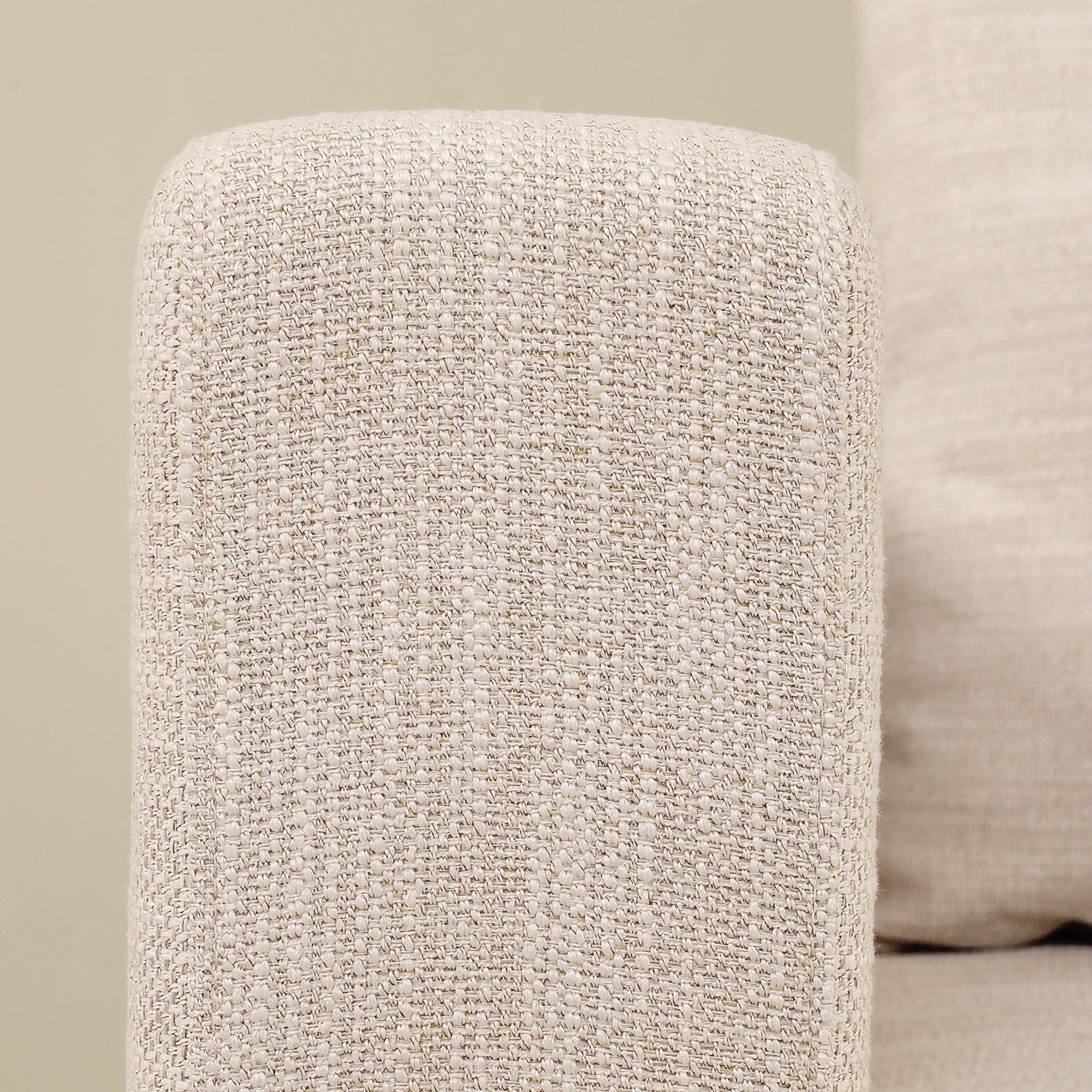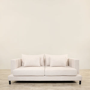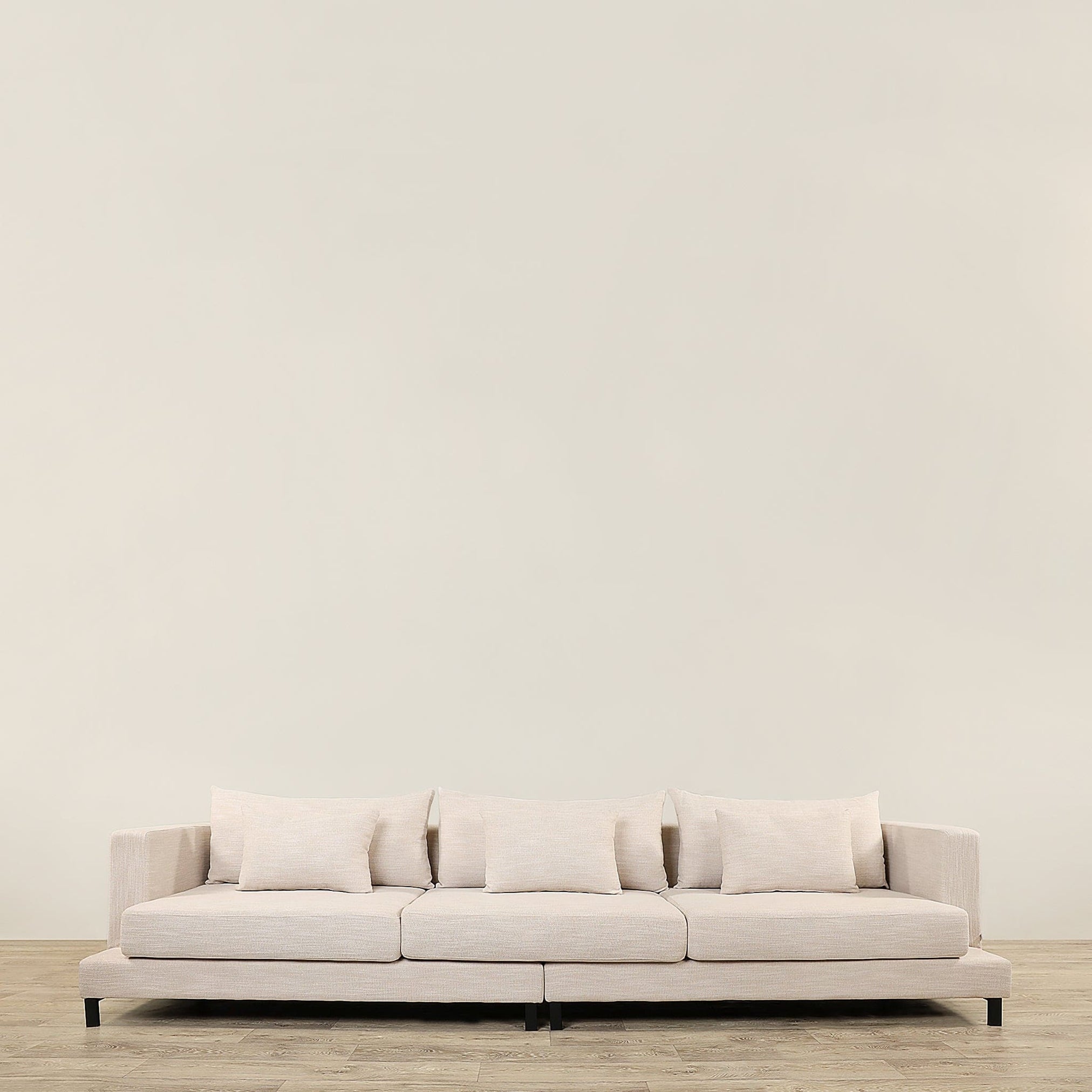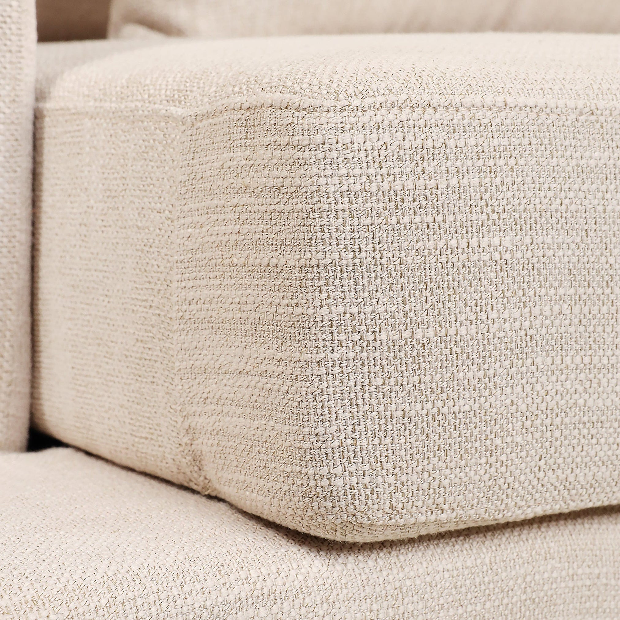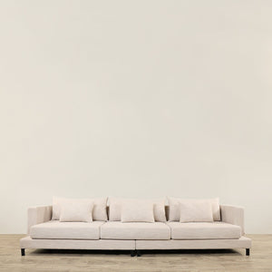The Bilbao Sofa exudes a harmonious balance with its slender track arms elegantly complemented by coordinating throw pillows. Adding a captivating touch, the contrasting metal legs extend up the low deck, serving as a noteworthy design element in themselves. This sectional is perfectly equipped for maximal comfort and frequent usage.