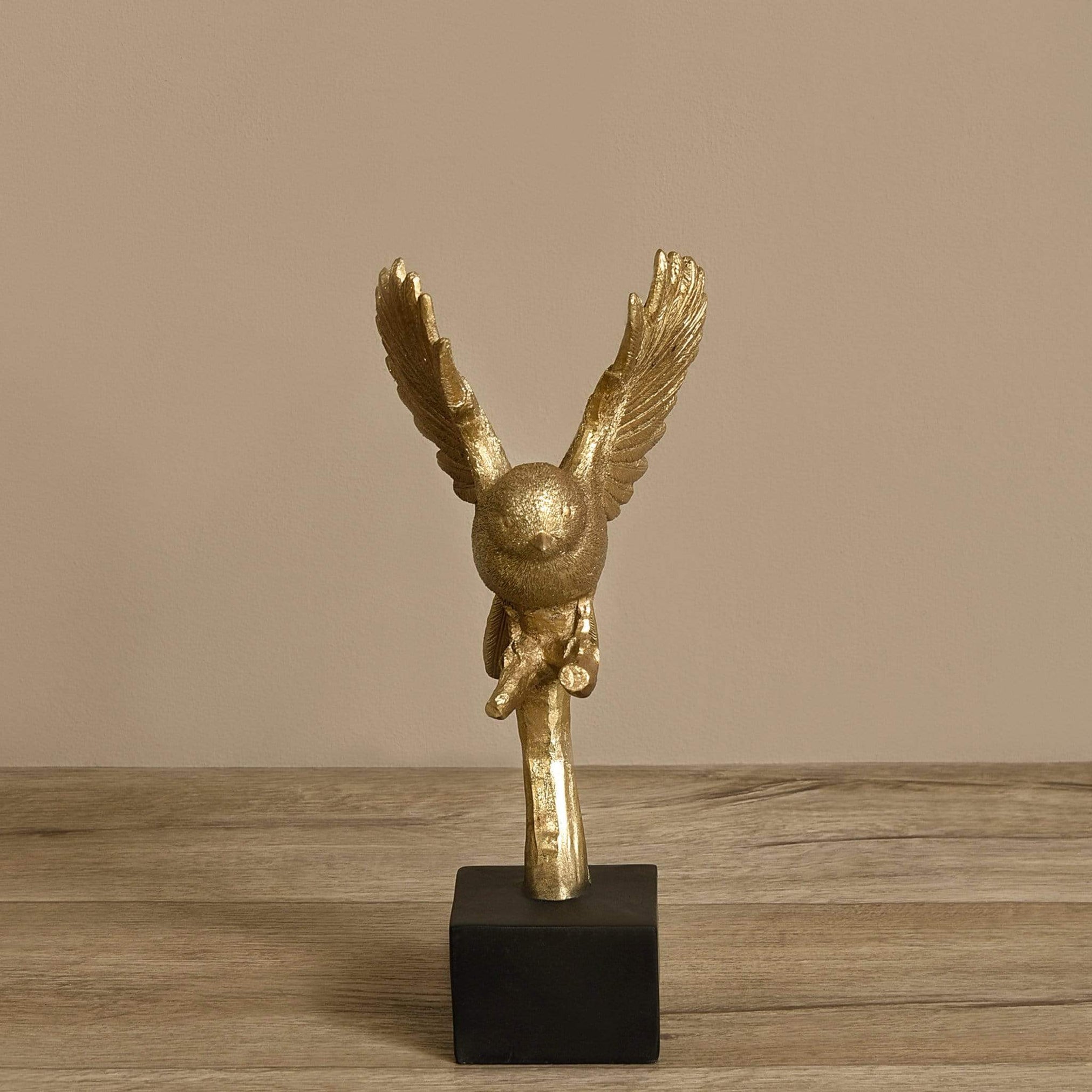 Strong, elegant, and charming. This bird figurine features intricate feather carvings, a metallic gold finish, and a contrasting black base for ease of display. Place it on your office shelf for a stylish accent.