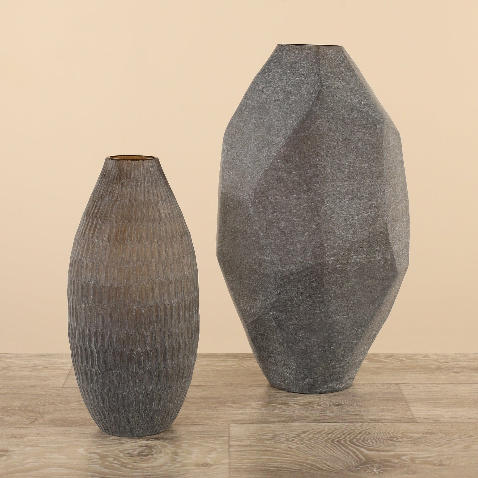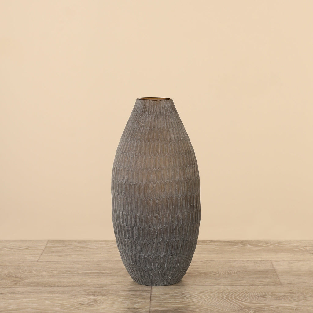 Ideal for showcasing a single stem or branch, this bottle vase doubles as a striking stand-alone piece. With a versatile smoke grey finish, it boasts a captivating textural finish that adds intrigue and contrast to any setting. Whether used as a standalone centerpiece or adorned with a beautiful flower, this elegant vase effortlessly complements and elevates your decor.