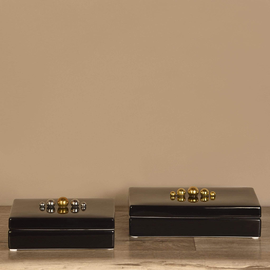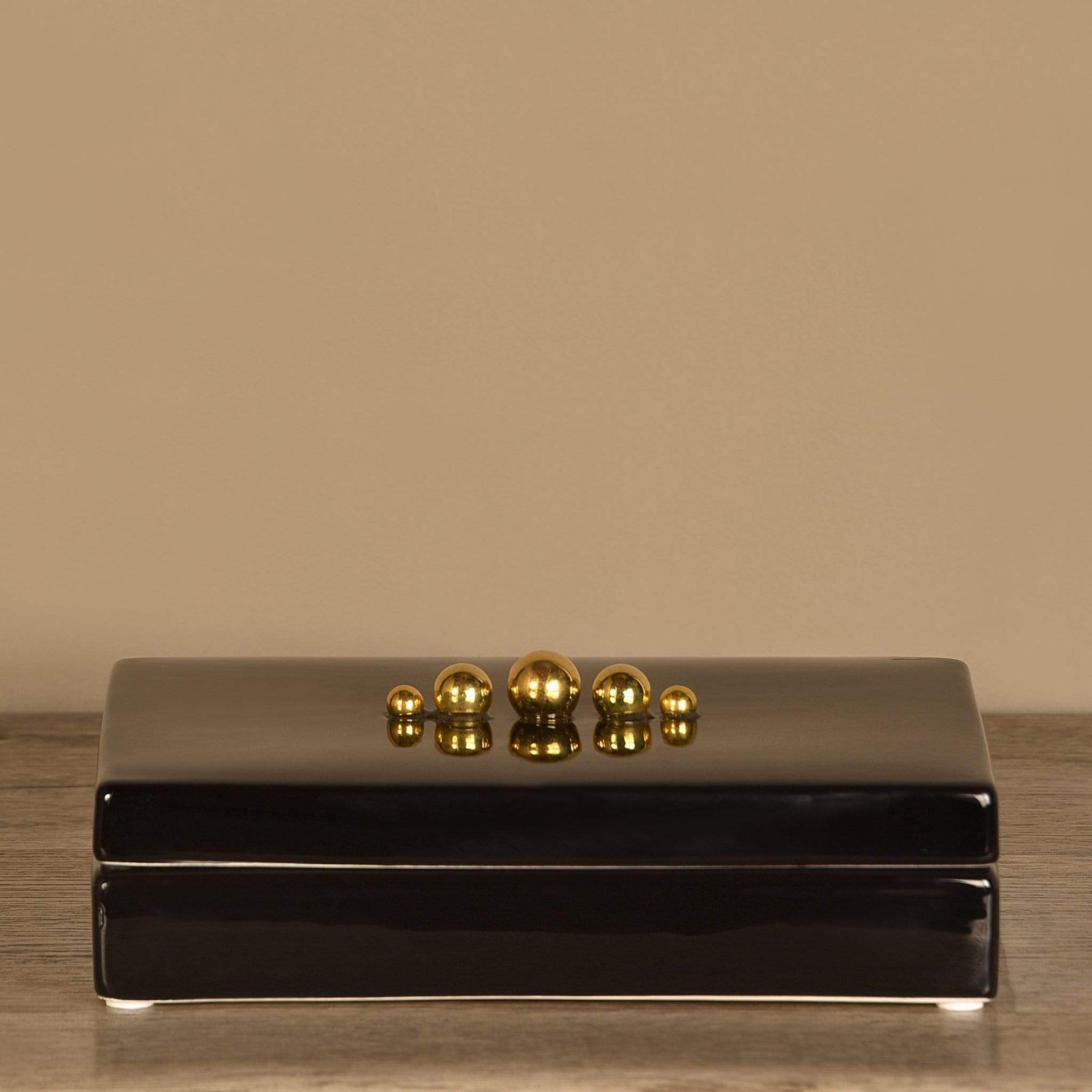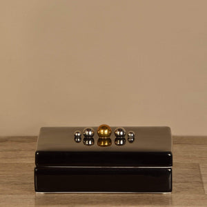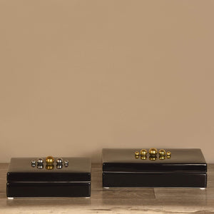 Enhance the aesthetic of your living space with this elegant Black Jewel Box, a perfect addition to your coffee table, dresser, or shelf. Its sleek and shiny finish exudes sophistication, while the delicate gold embellishments add a touch of luxury to its overall design.