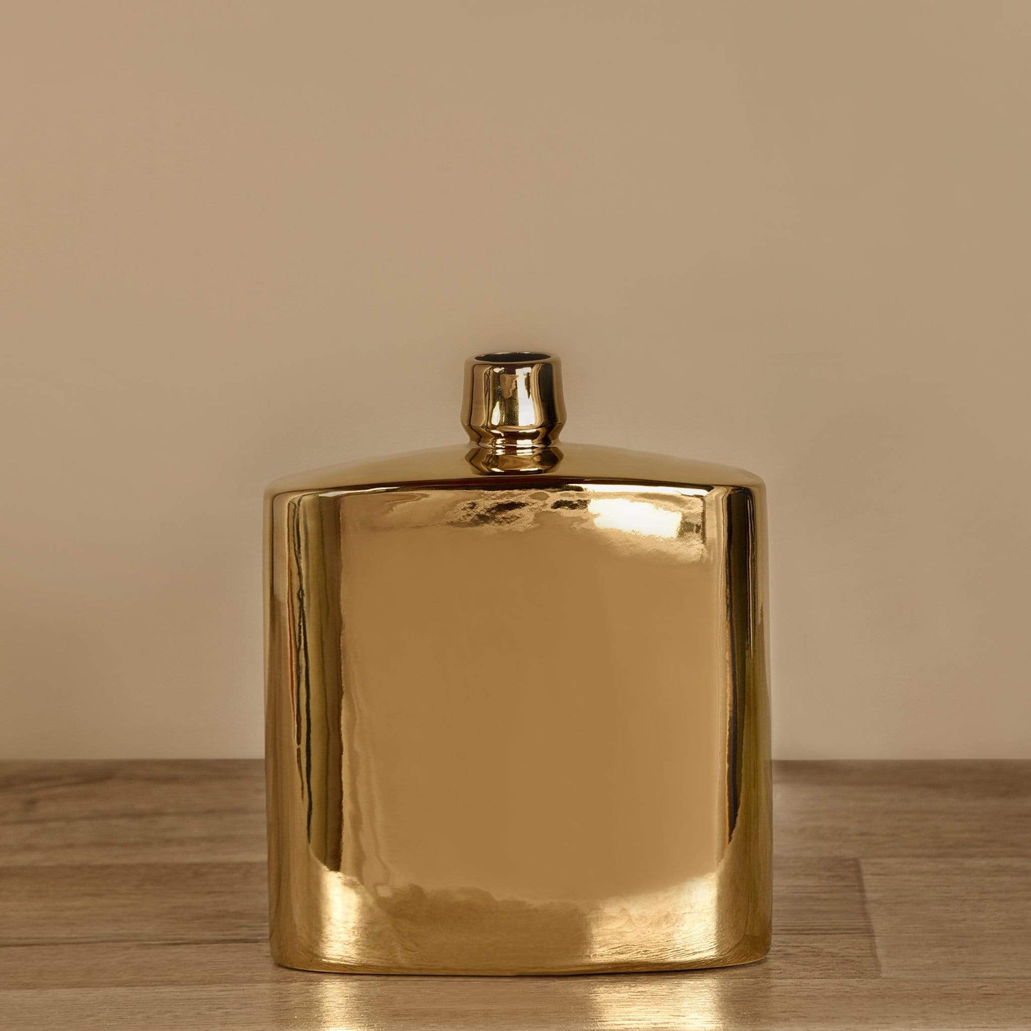 The sleek shape of this gold vase adds a touch of refinement to its form. The golden surface, whether polished to a brilliant shine or softly textured, reflects light in a captivating manner, casting a warm and radiant glow in its surroundings. Its captivating presence draws the eye and elevates the ambiance of any room, making a lasting impression as a decorative masterpiece that seamlessly integrates into various interior design themes.