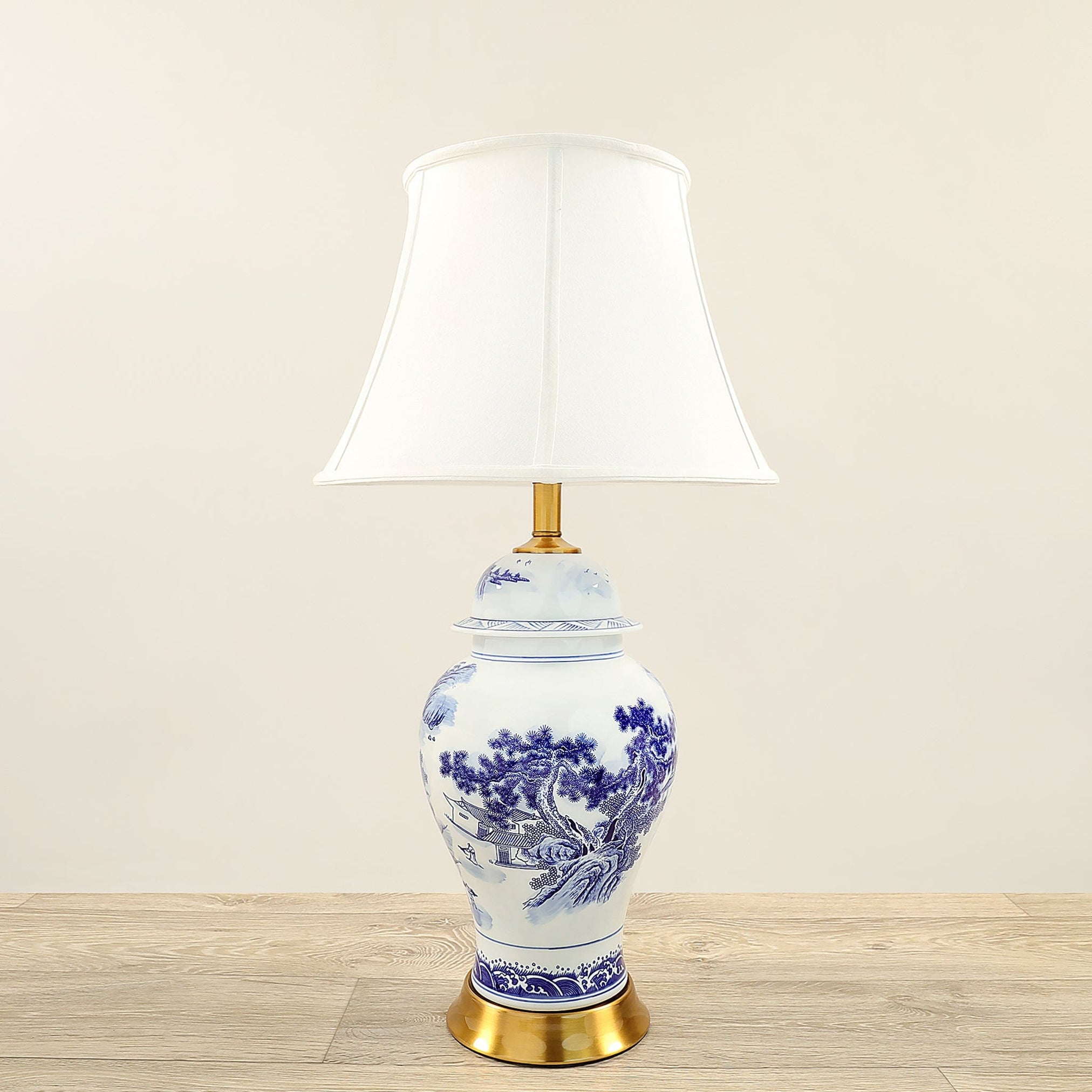 Marrying practicality with exquisite aesthetics, this ceramic lamp presents a ribbed design accented with brass flawlessly fusing timeless and contemporary features. Topped with a stylish shade, this blue and white lamp emits a luminosity that harmonizes with any indoor design. Whether placed beside the living room couch or positioned by a beloved armchair, this refined lamp will infuse your surroundings with a hospitable glow.