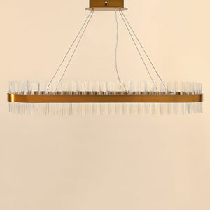 When you want to make a bold statement look no further than this contemporary chandelier. Crafted with clear glass rods and trimmed in gleaming gold this elegant fixture is just right for use over a dining table or in a living area for wonderful luminescence.