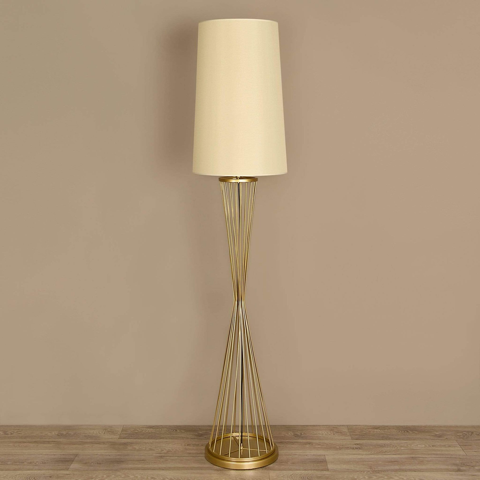 A lovely hourglass shape defines this modern floor lamp. Crafted with metal rods finished in gleaming gold this elegant floor lamp is topped with a white lampshade for the perfect finishing touch.