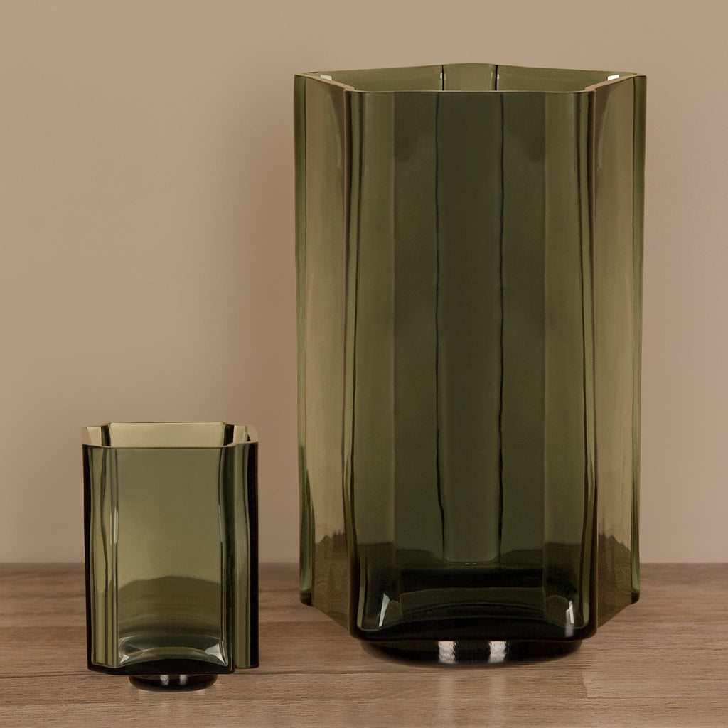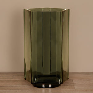 Artistically designed to coordinate beautifully with many decors this glass vase has geometric lines for a crisp, modern look. It is crafted in glass with a lovely sky-blue tint to stand out in any space.