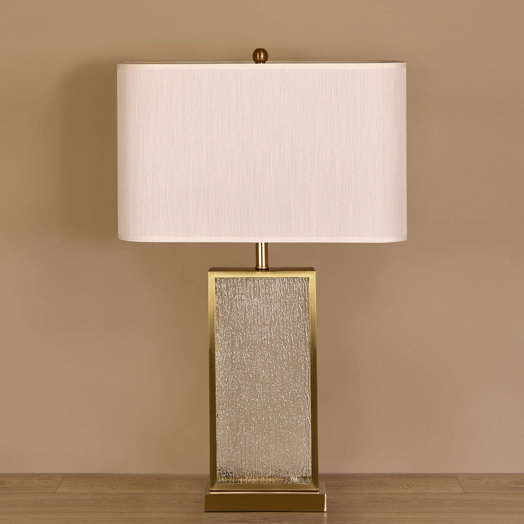 The contemporary look of this crackle Glass Table Lamp is softened with elegant gold trim. Topped with a rectangle fabric shade this Glass Lamp is an ideal fit for a living area, bedroom, or entryway to greet visitors.