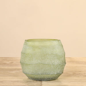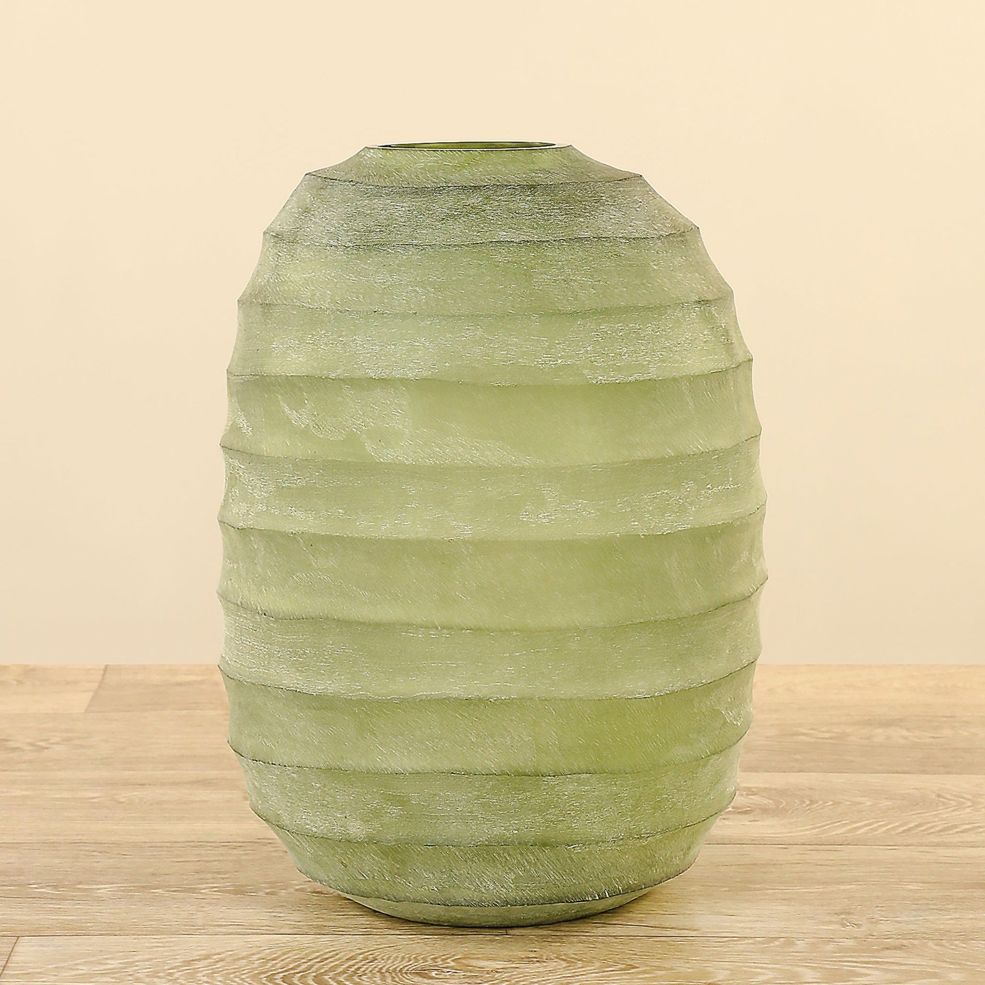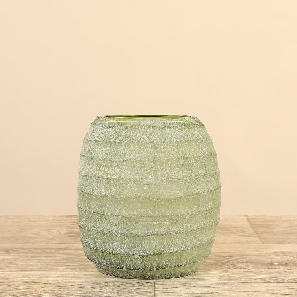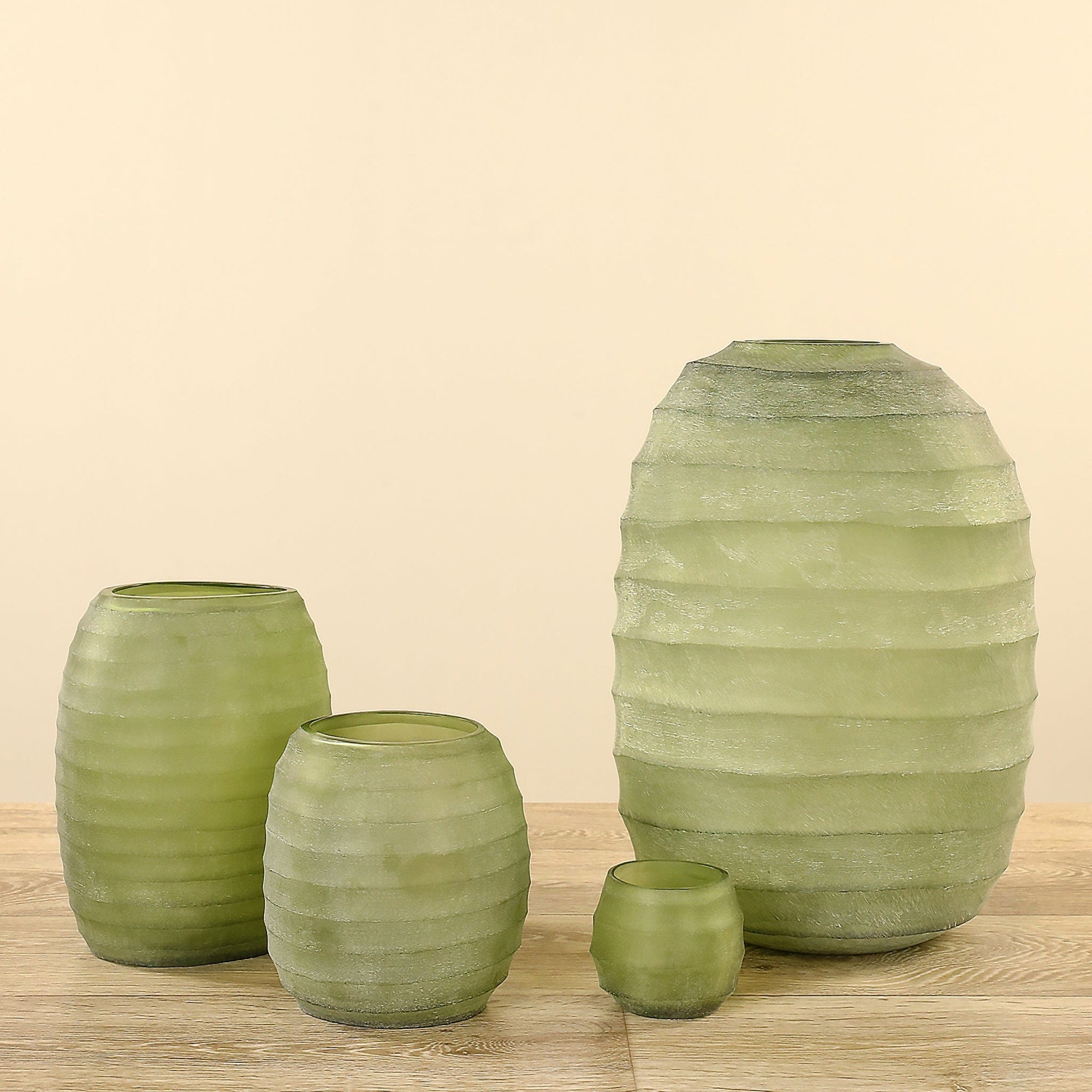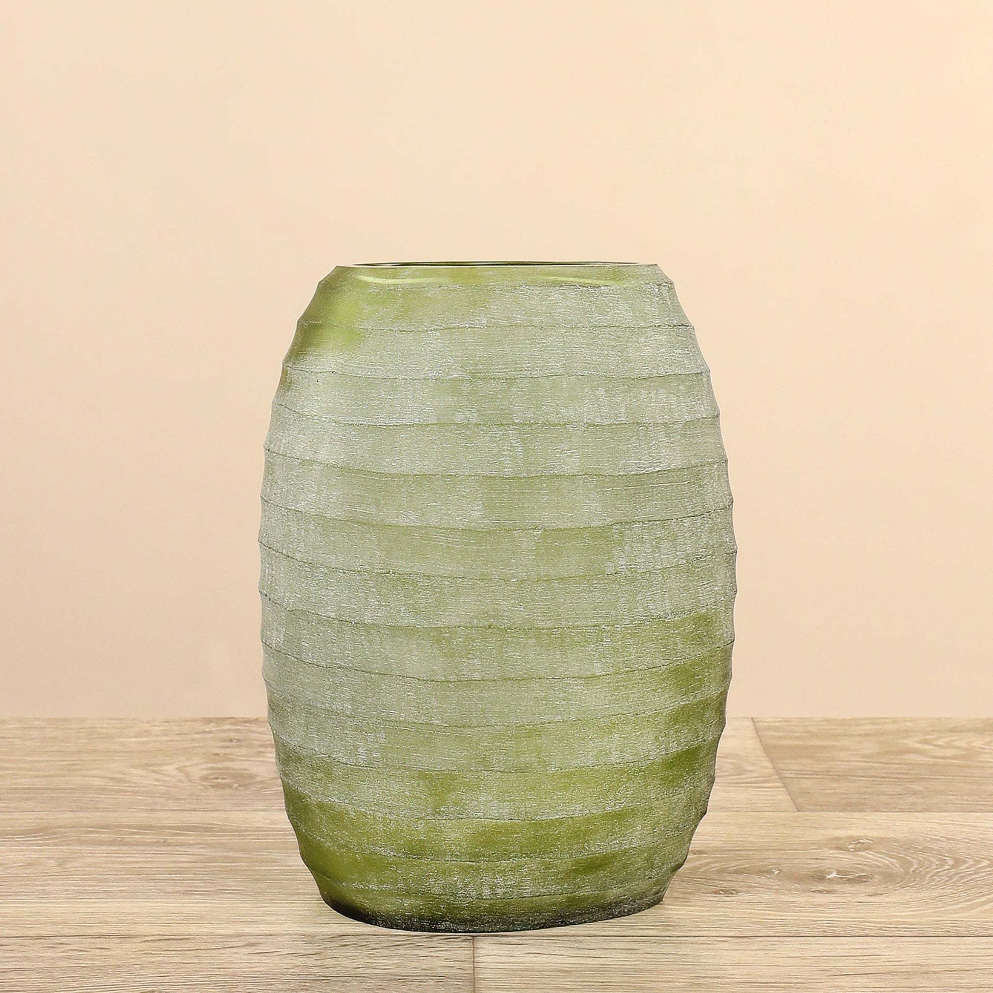 Beautiful as a decorative object this Handblown Glass Vase is equally stunning displaying artificial or real flowers. Crafted with a captivating green finish with horizontal ribbing, this elegant glass vase is a wonderful way to bring color and texture into a decorating aesthetic.