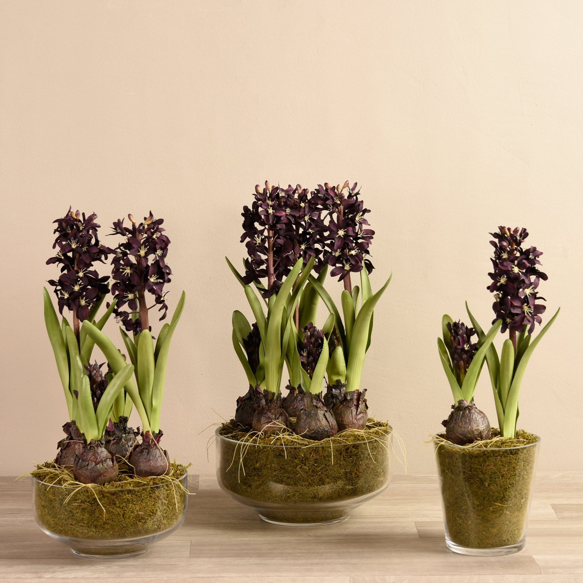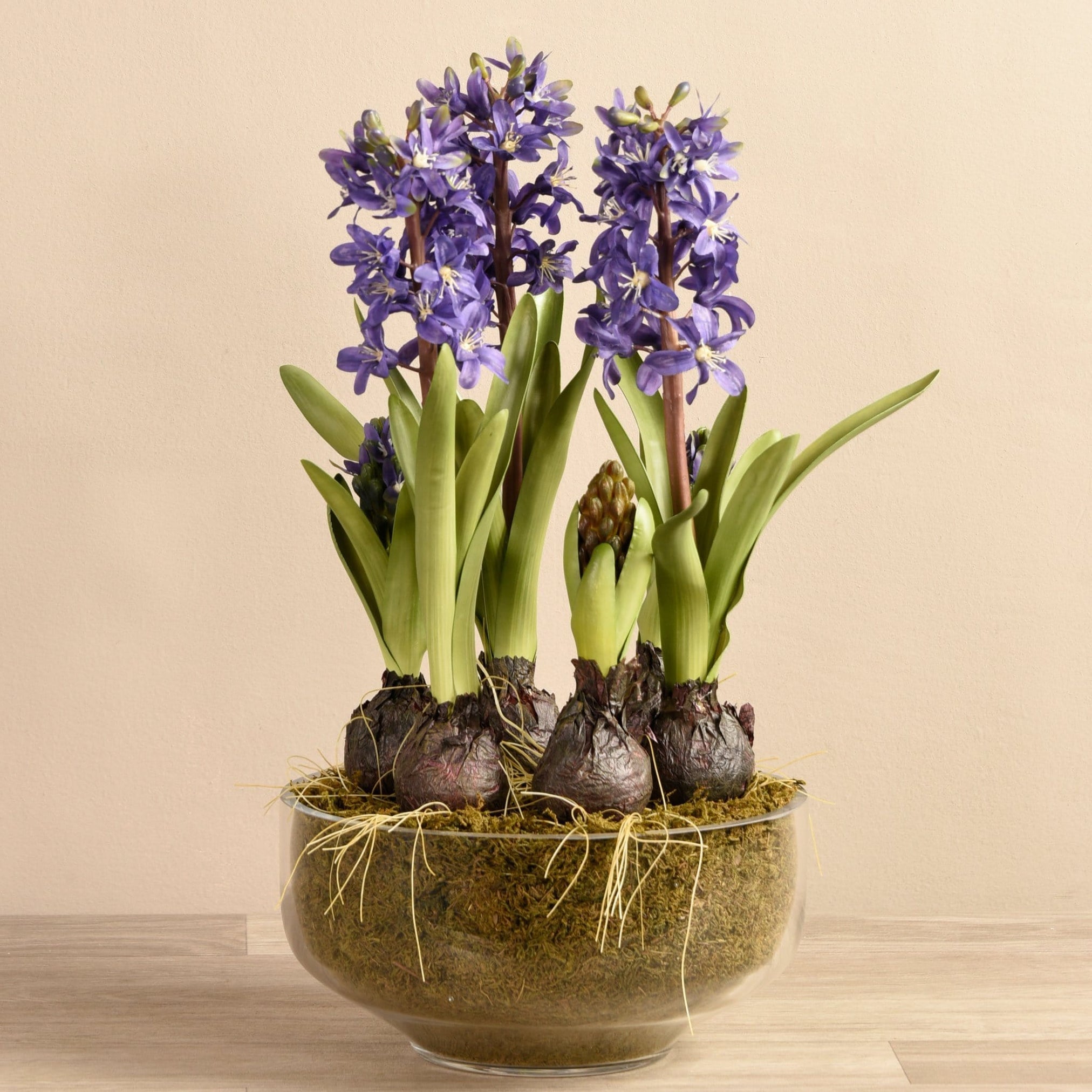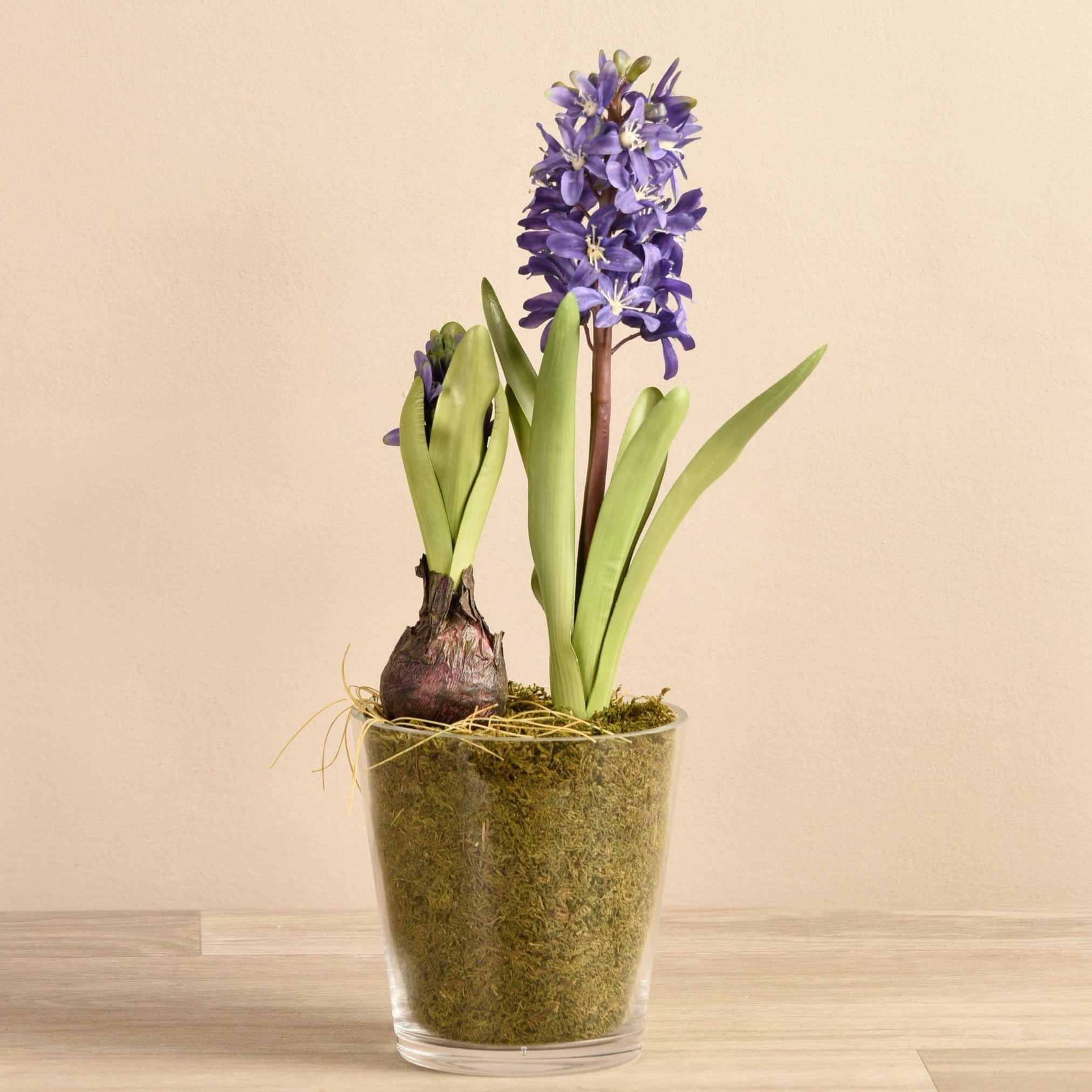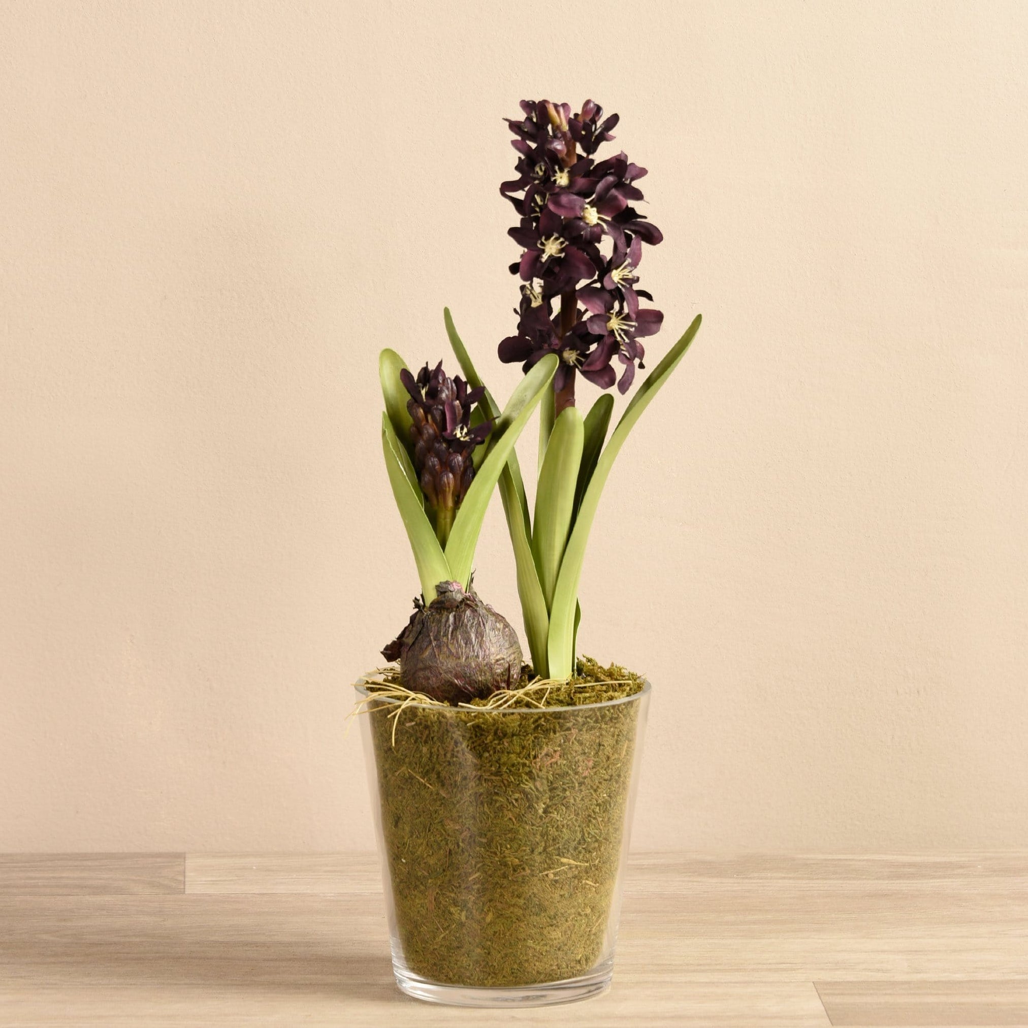 Turn your home into an exotic Mediterranean getaway with these stunning arrangements. Designed by floral experts, these artificial hyacinths are planted with a bulb attached to mimic the real flowering plant. Their clear glass pot adds an earthy touch.
