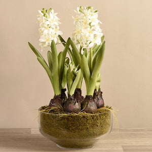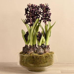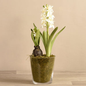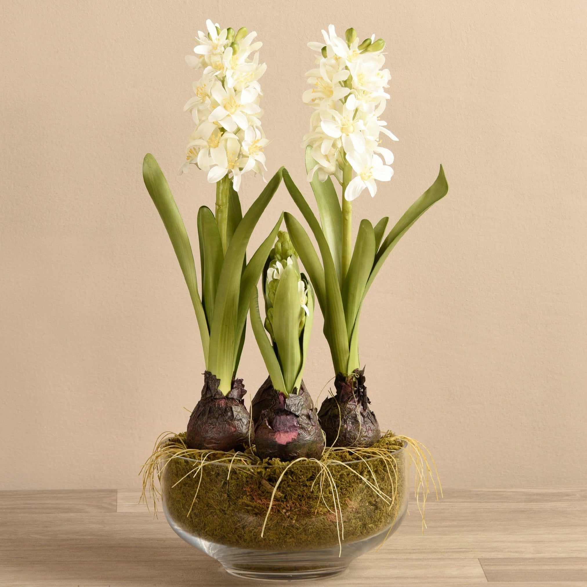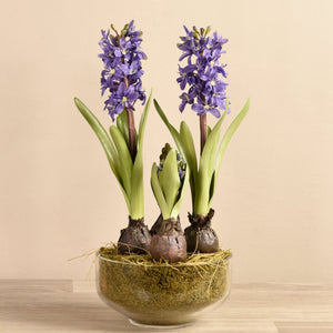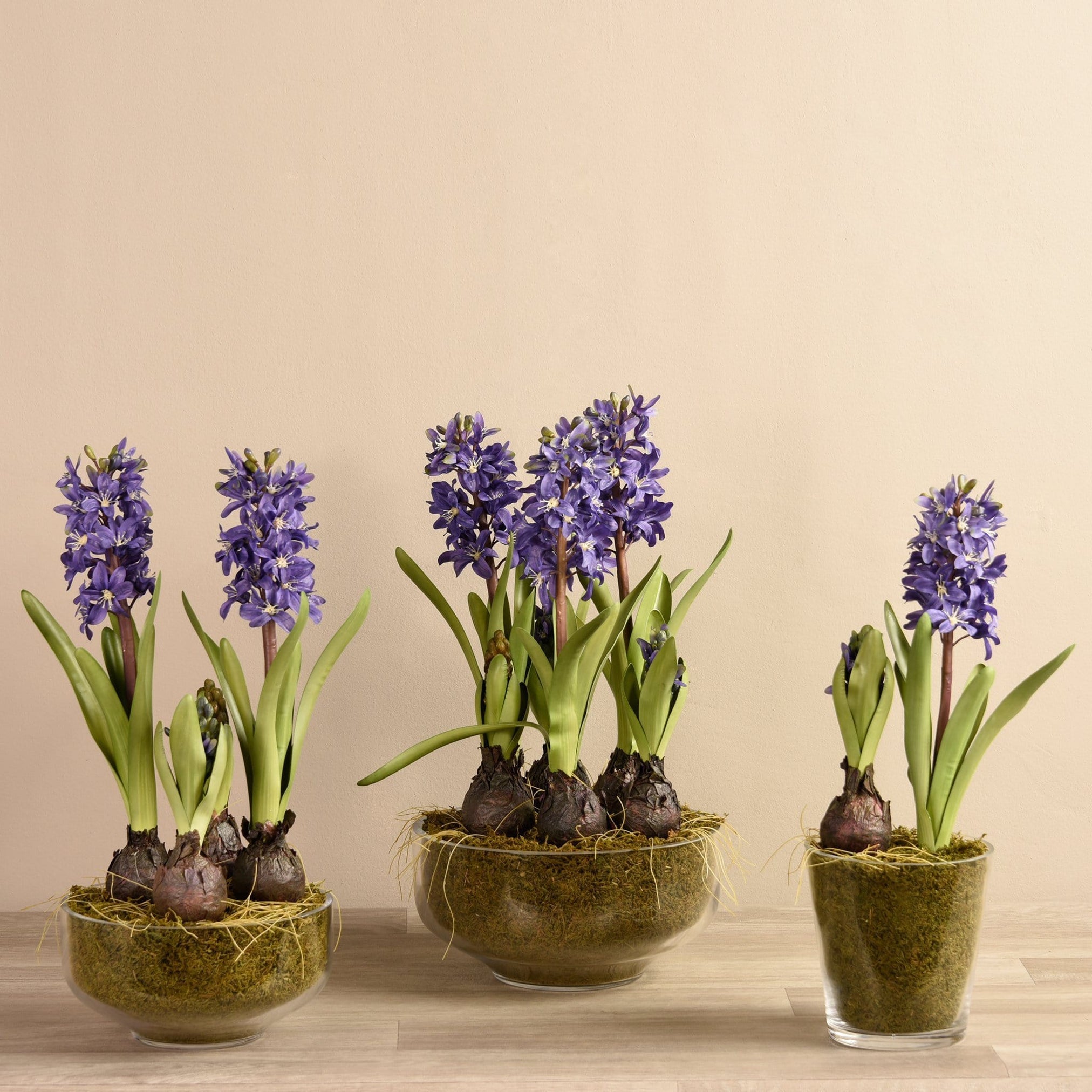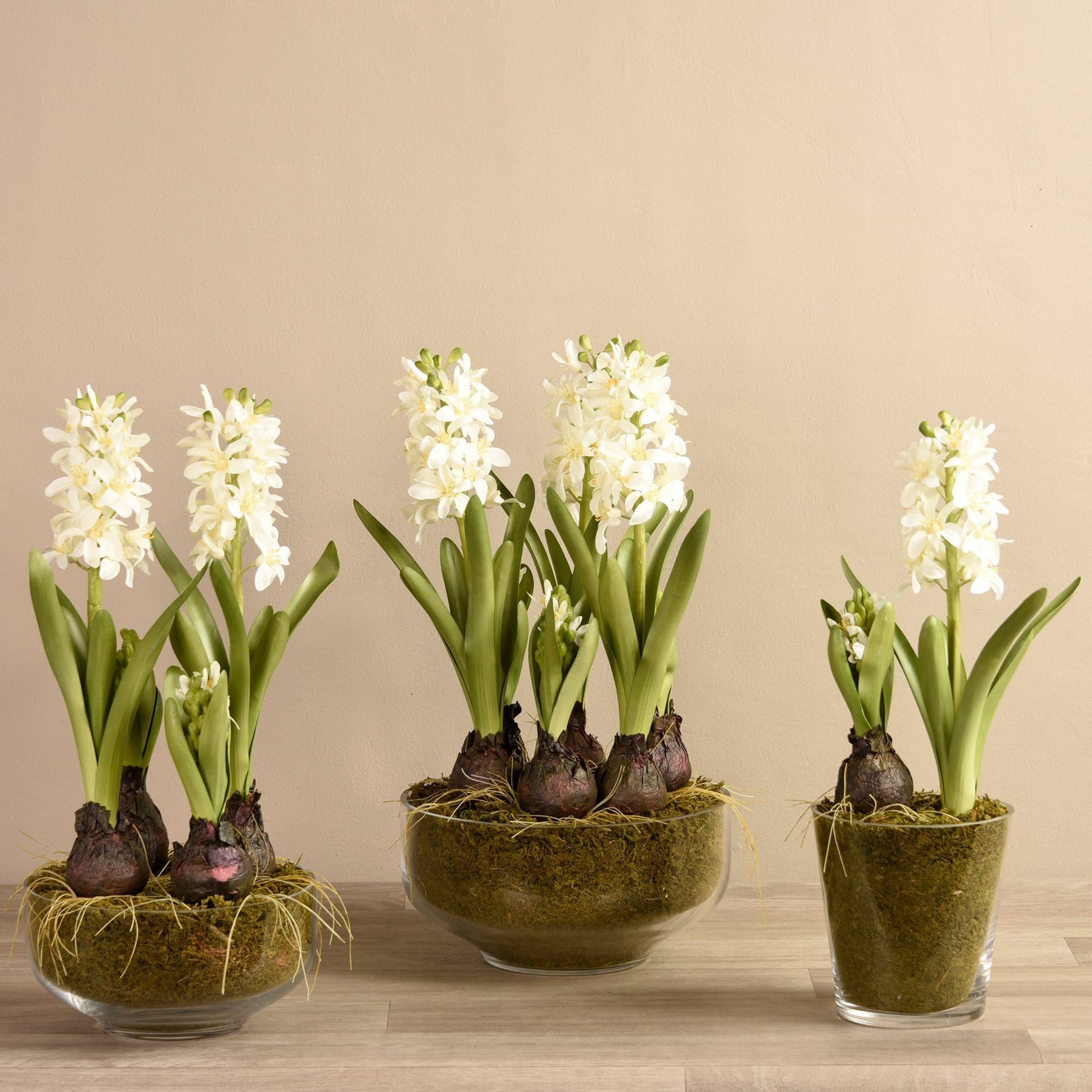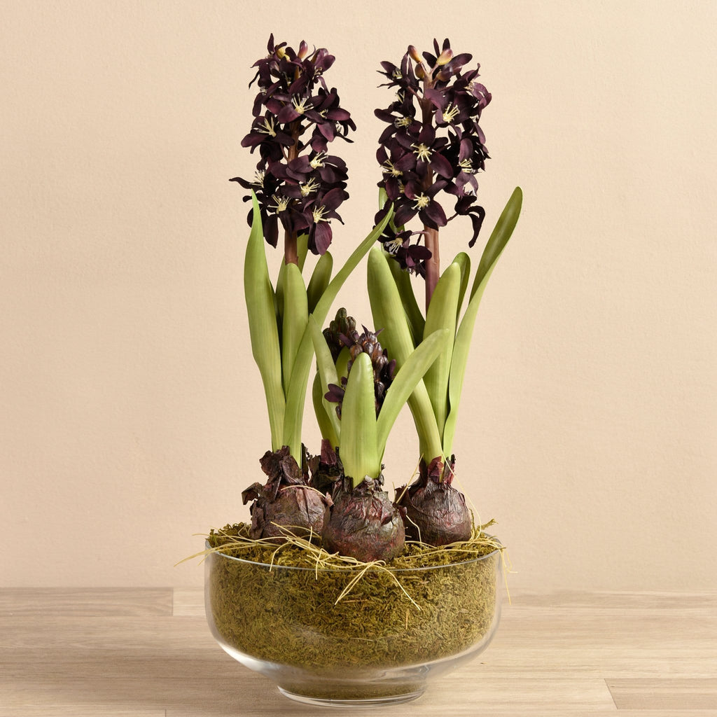 Turn your home into an exotic Mediterranean getaway with these stunning arrangements. Designed by floral experts, these artificial hyacinths are planted with a bulb attached to mimic the real flowering plant. Their clear glass pot adds an earthy touch.