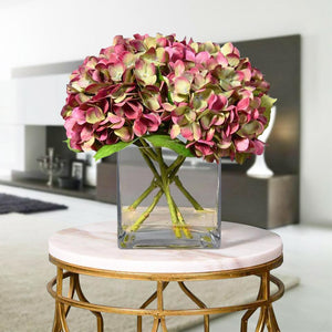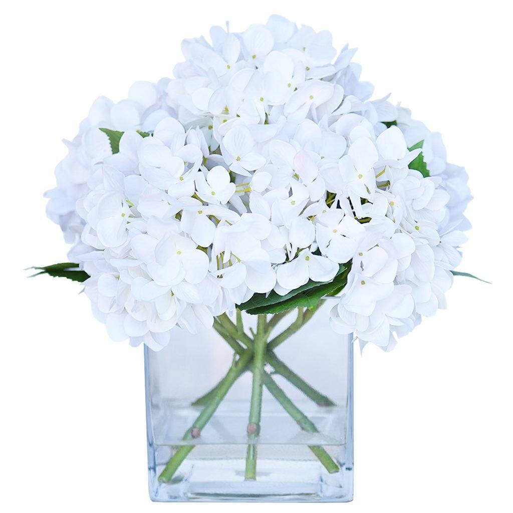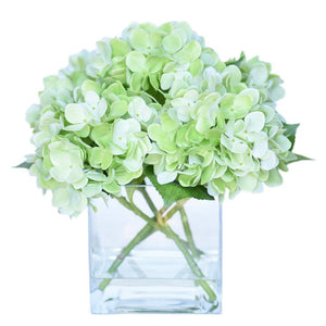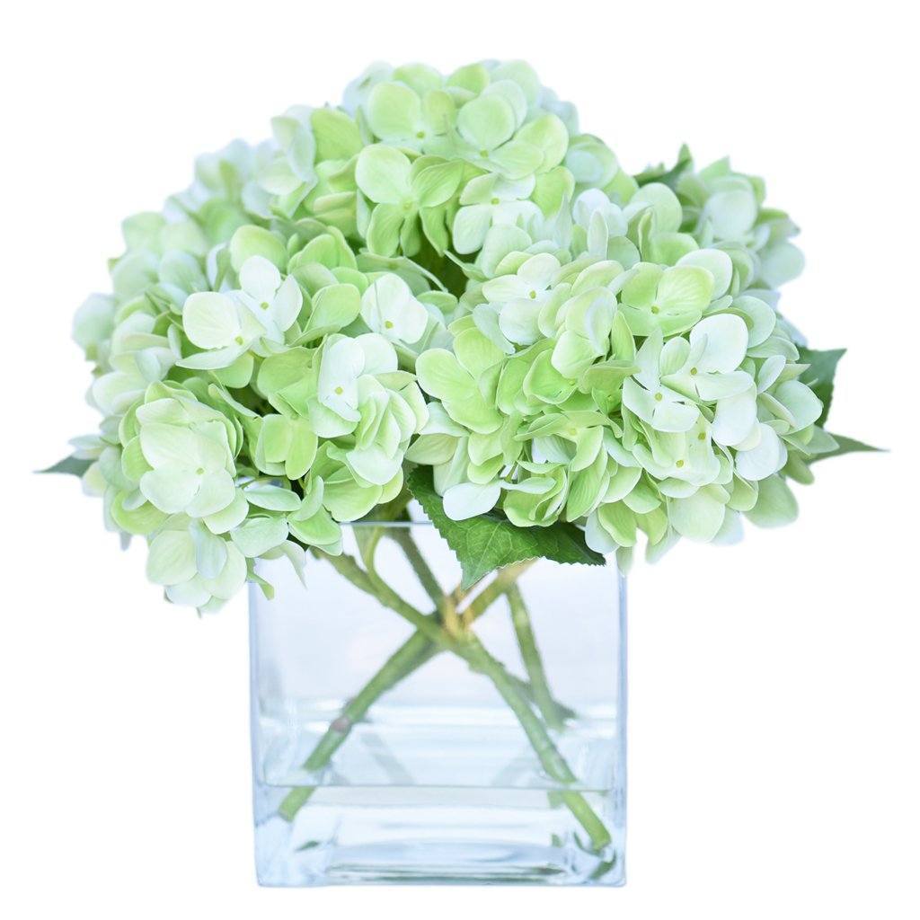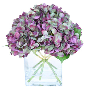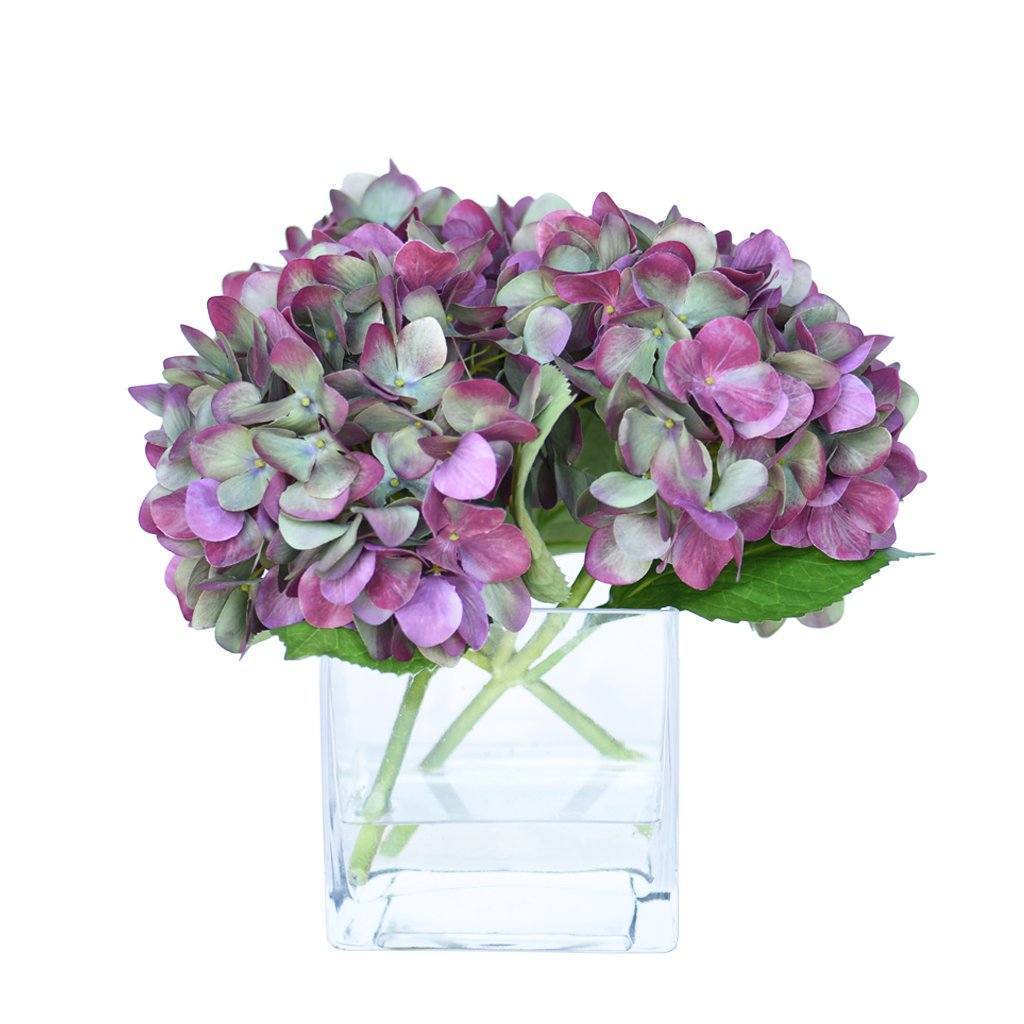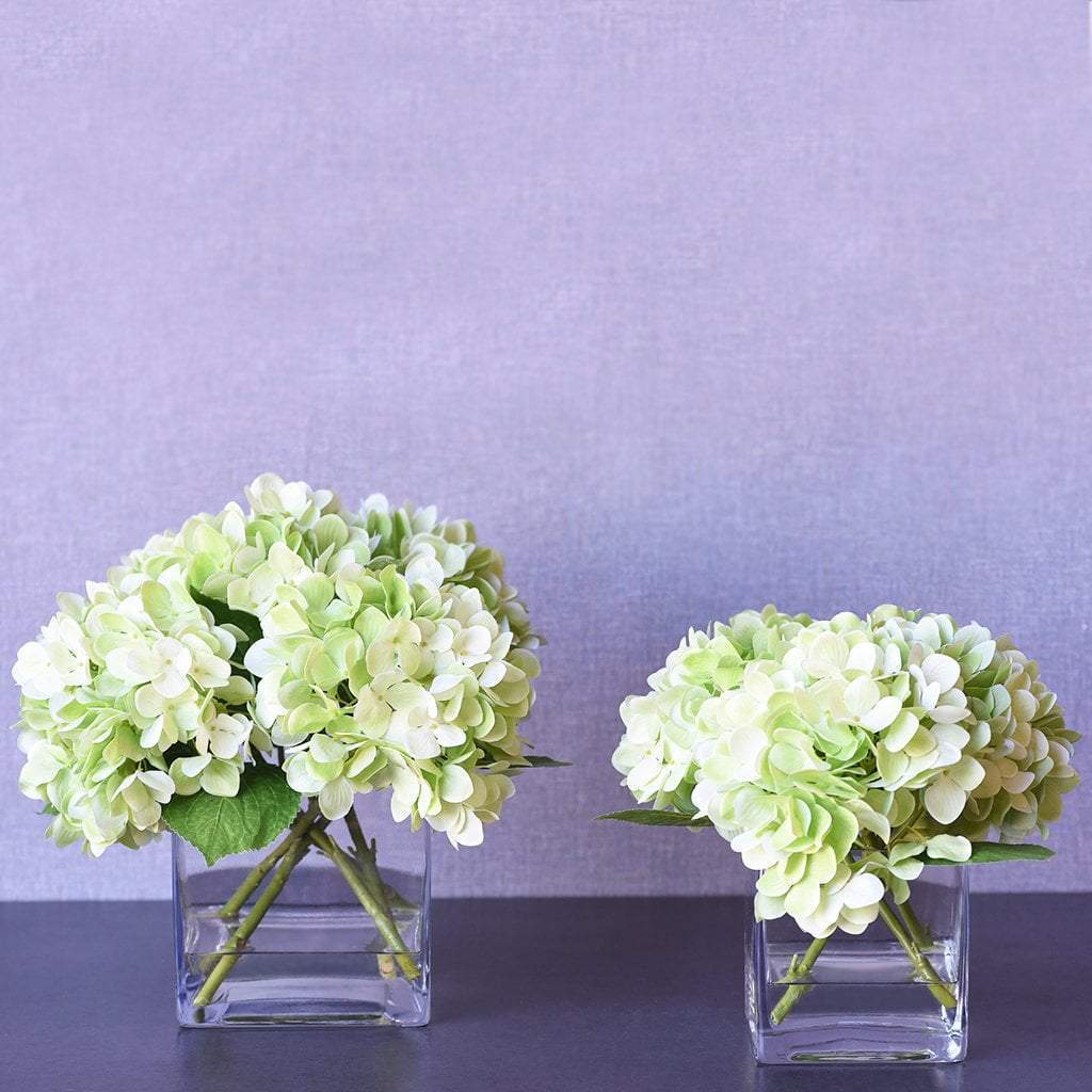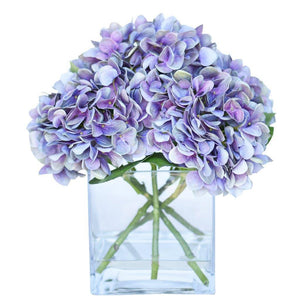 These silk florals look stunning as a centerpiece for special events or placed on a dresser for everyday beauty. Crafted by florists with lifelike faux hydrangeas, these blue, purple, green, or white flowers are artfully assembled in a square glass vase.