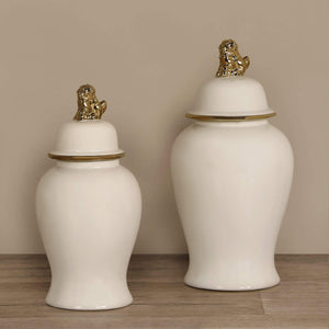 The classic ginger jar style is reimagined with a monochromatic matte white finish. Sometimes, simple pieces make the biggest statement. This beautiful jar features gold details, a stylish silhouette, and a removable lid for effortless storage.
