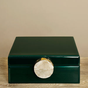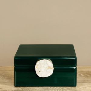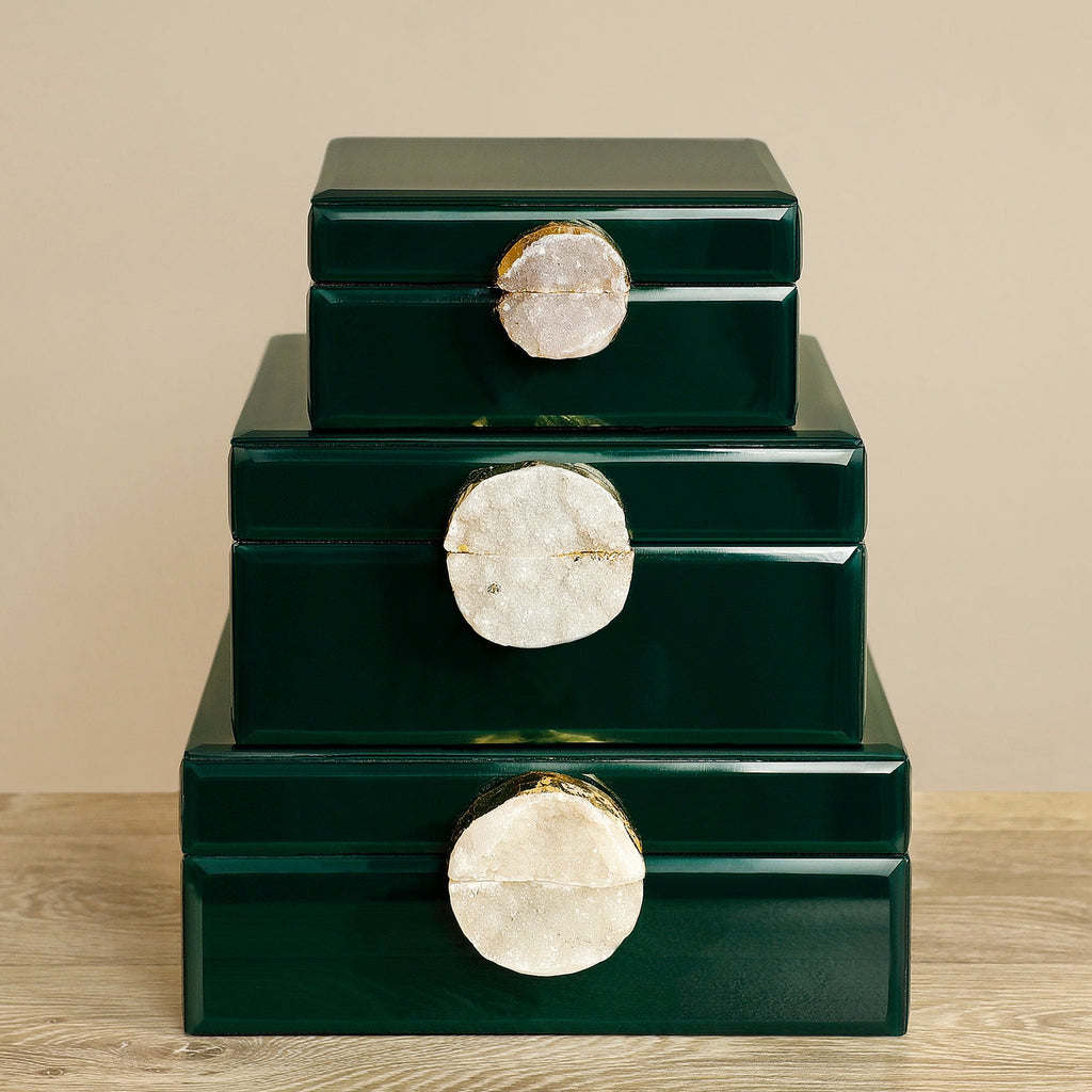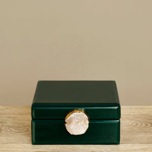 Store your cherished trinkets in a jewelry box as stunning as they are. This enchanting emerald green jewelry box combines aesthetics with functionality, featuring a unique geode closure that sets it apart. Whether you choose to display it on a shelf or grace your bathroom counter, it effortlessly provides convenient storage for your valuables.