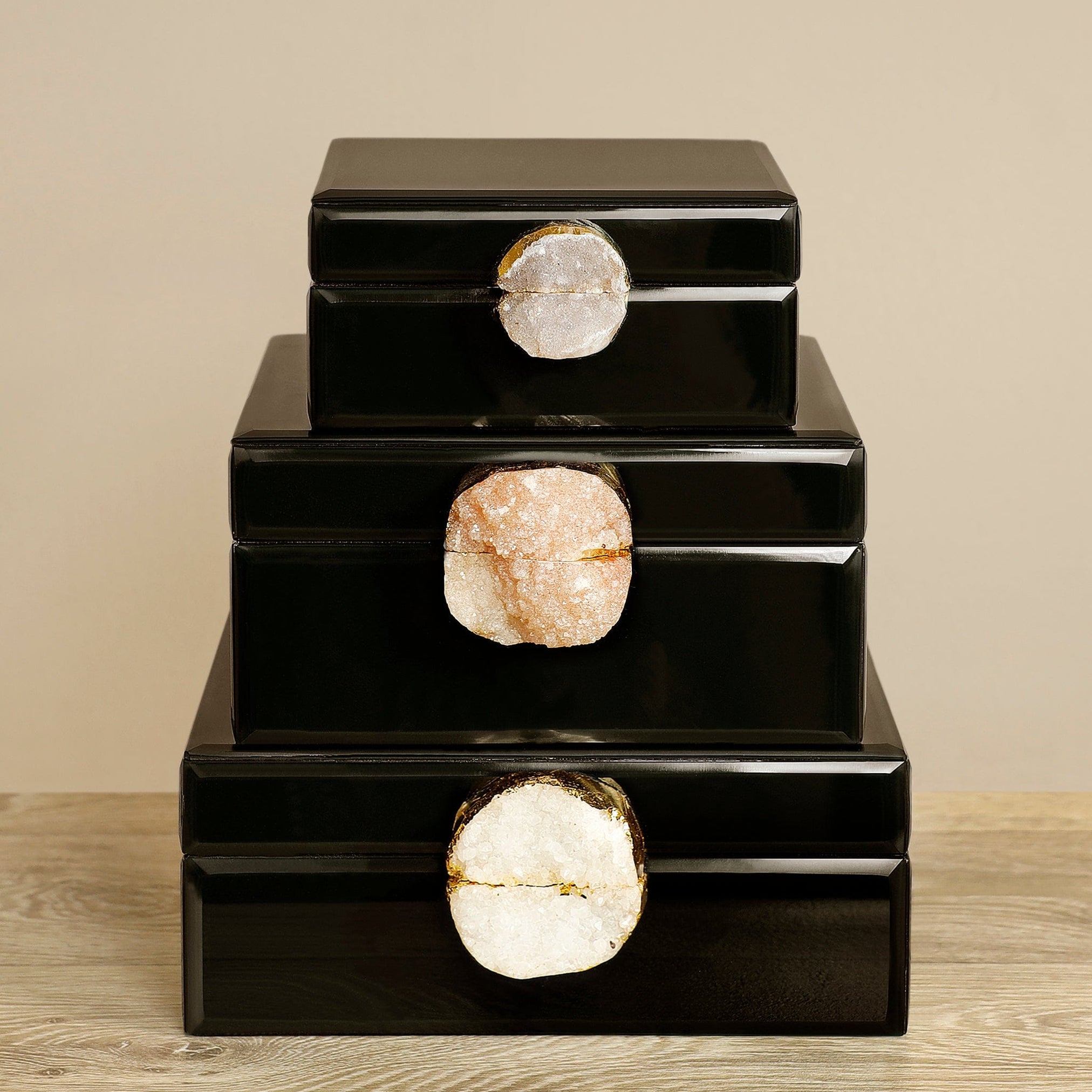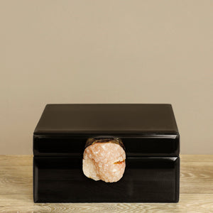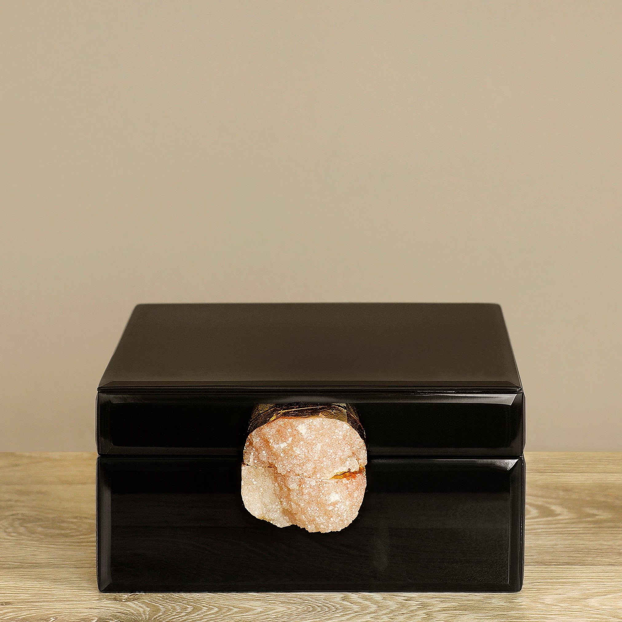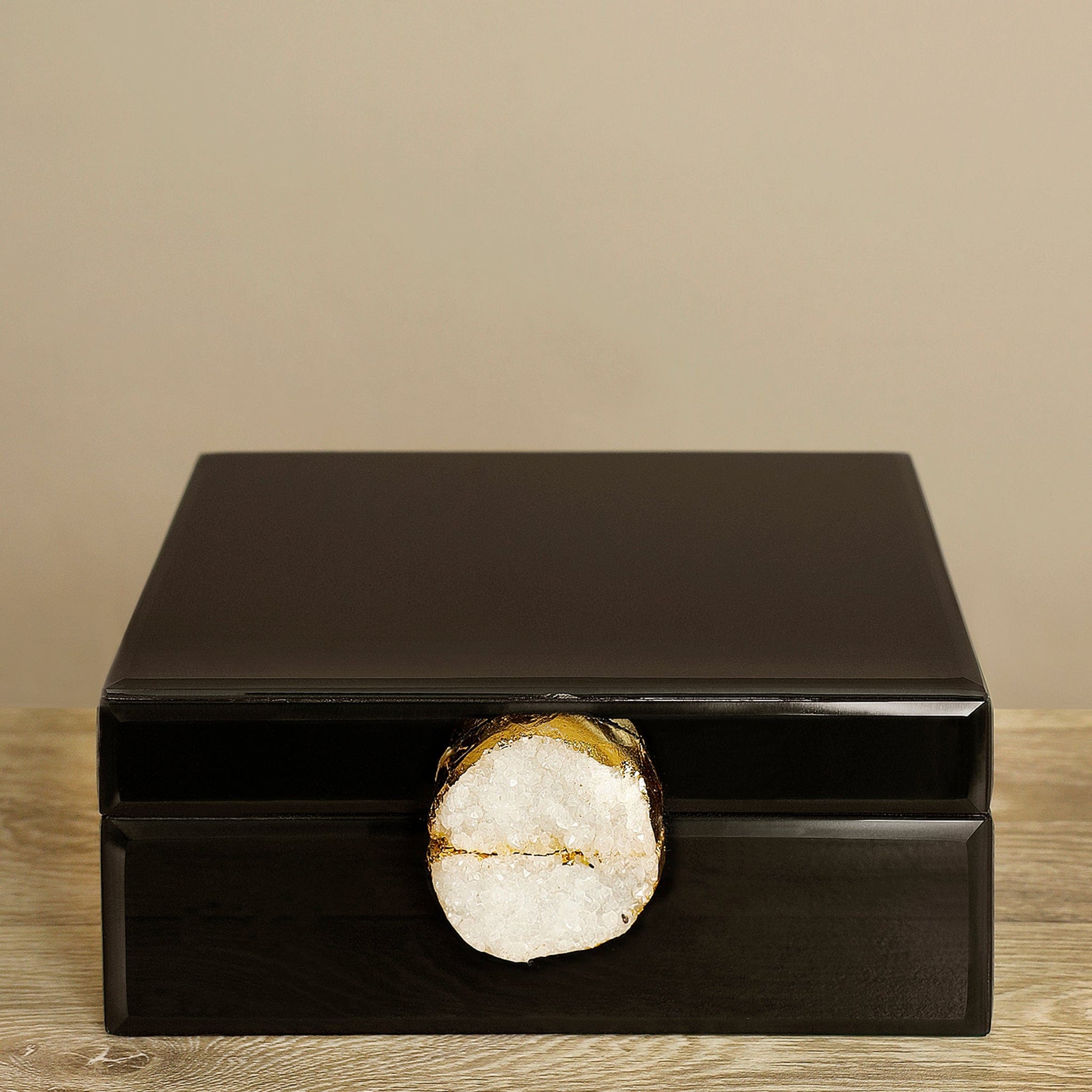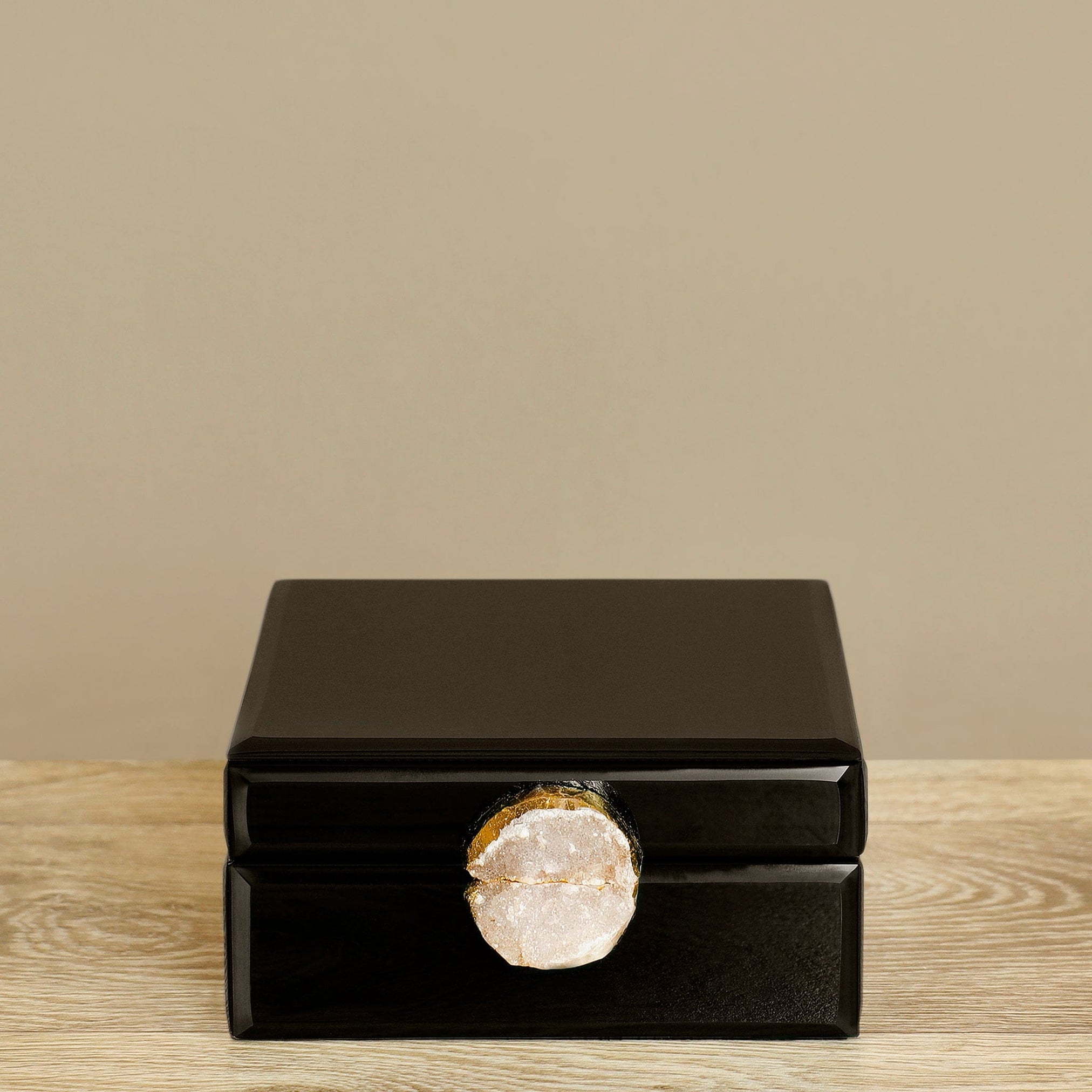 Store your cherished trinkets in a jewelry box as stunning as they are. This contemporary black jewelry box combines aesthetics with functionality, featuring a unique geode closure that sets it apart. Whether you choose to display it on a shelf or grace your bathroom counter, it effortlessly provides convenient storage for your valuables.
