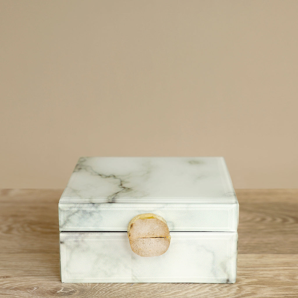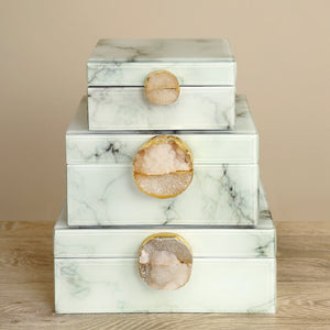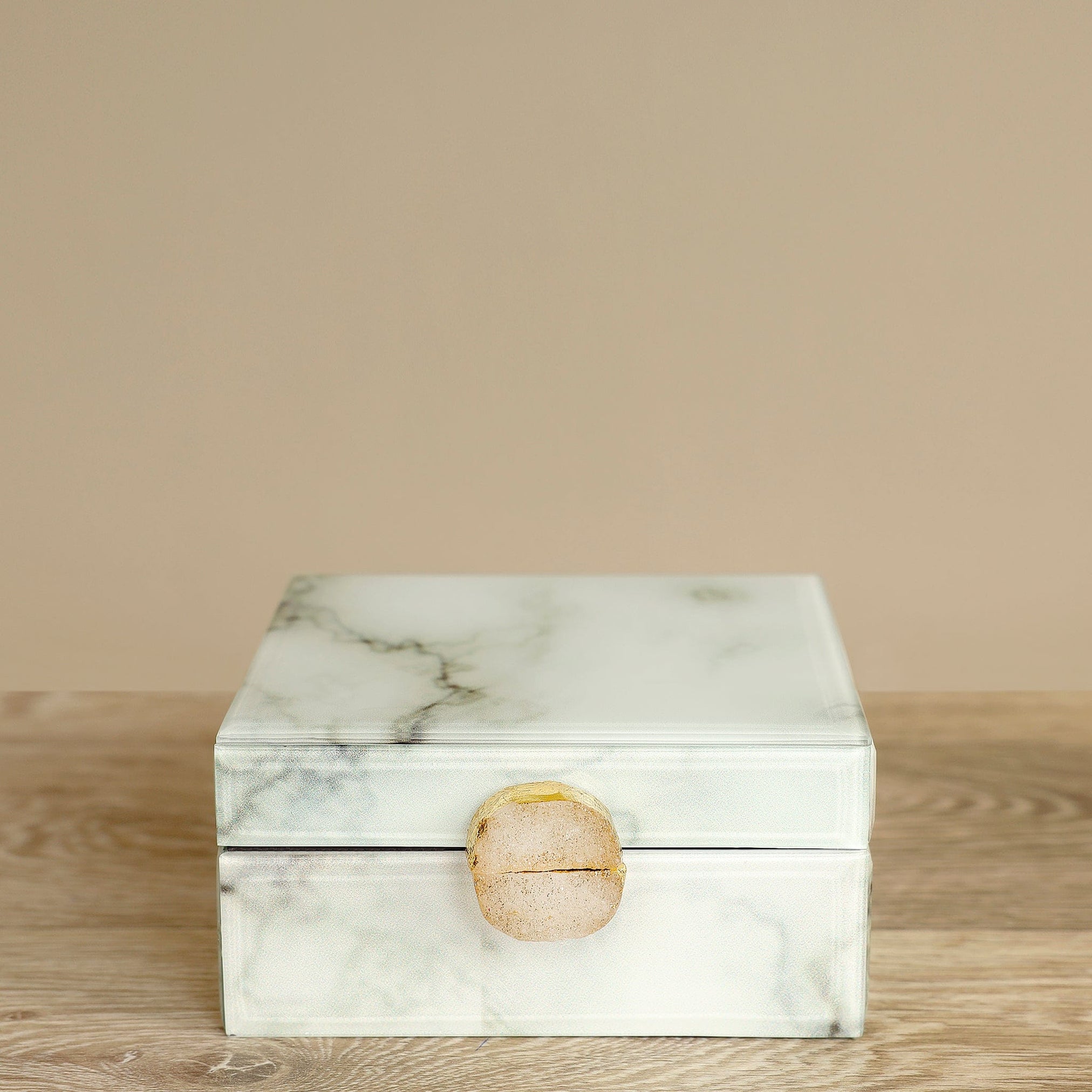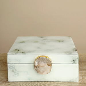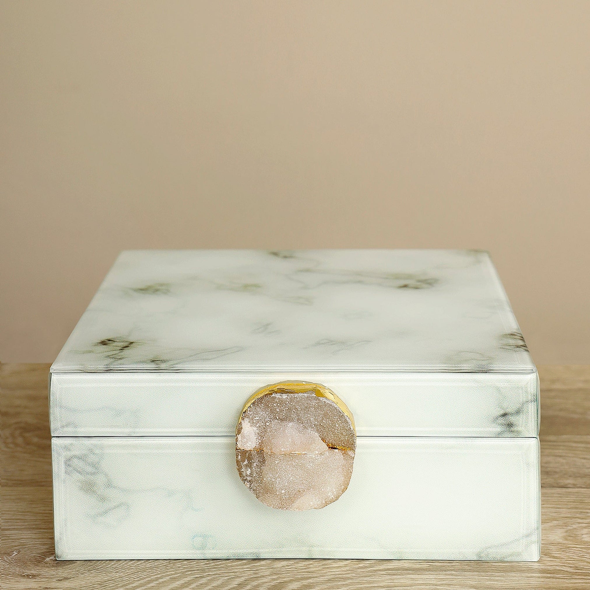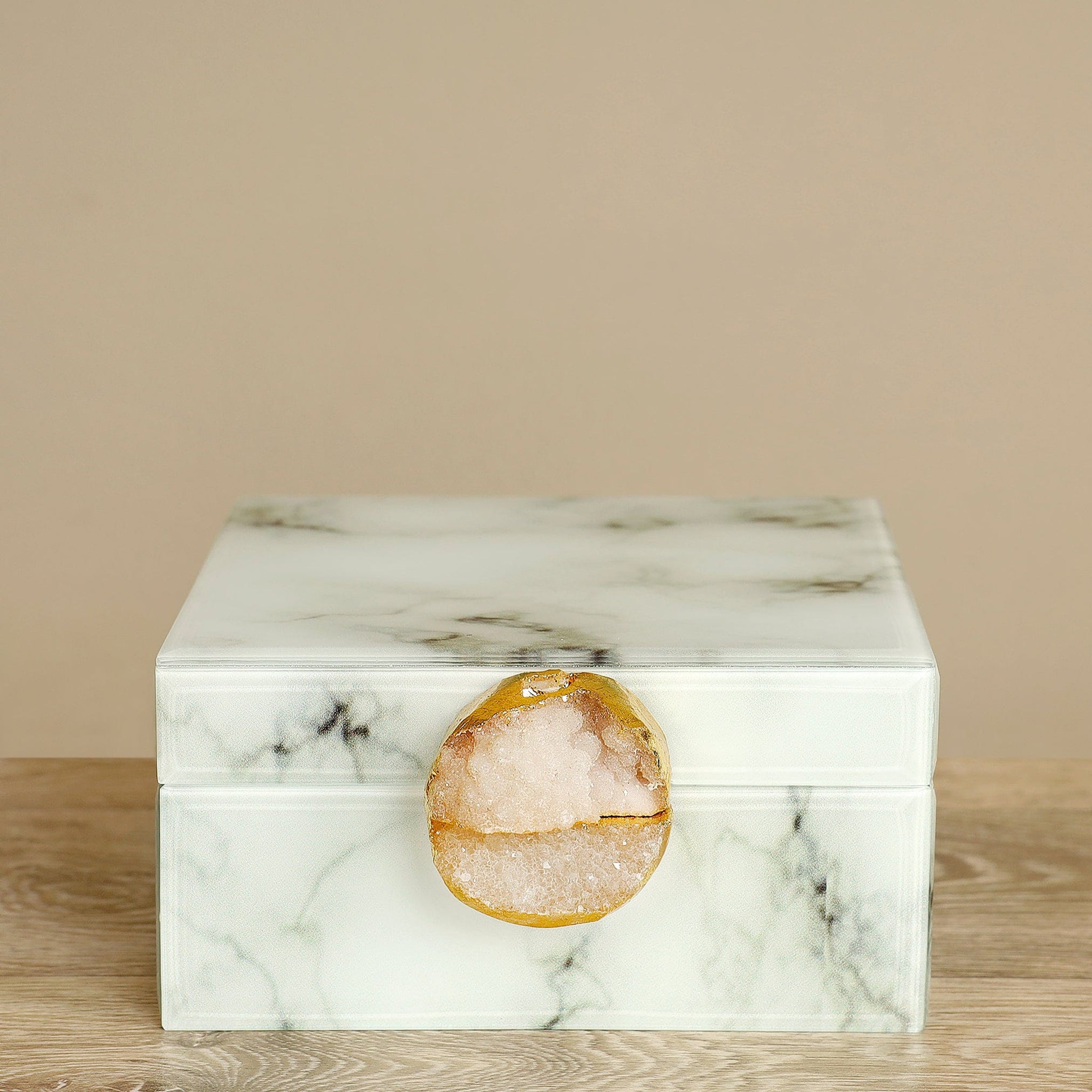 Store your cherished trinkets in a jewelry box as stunning as they are. This elegant white marble jewelry box combines aesthetics with functionality, featuring a unique geode closure that sets it apart. Whether you choose to display it on a shelf or grace your bathroom counter, it effortlessly provides convenient storage for your valuables.