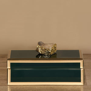 Protect your precious small valuables with style in this elegant glass jewelry box. Crafted in a delightful deep green hue this trinket box boasts clean, contemporary lines and a distinctive gold-finished stone knob, adding a touch of sophistication to its sleek design.