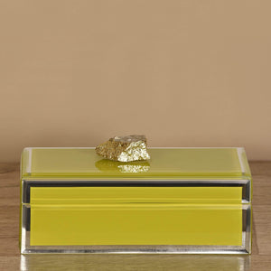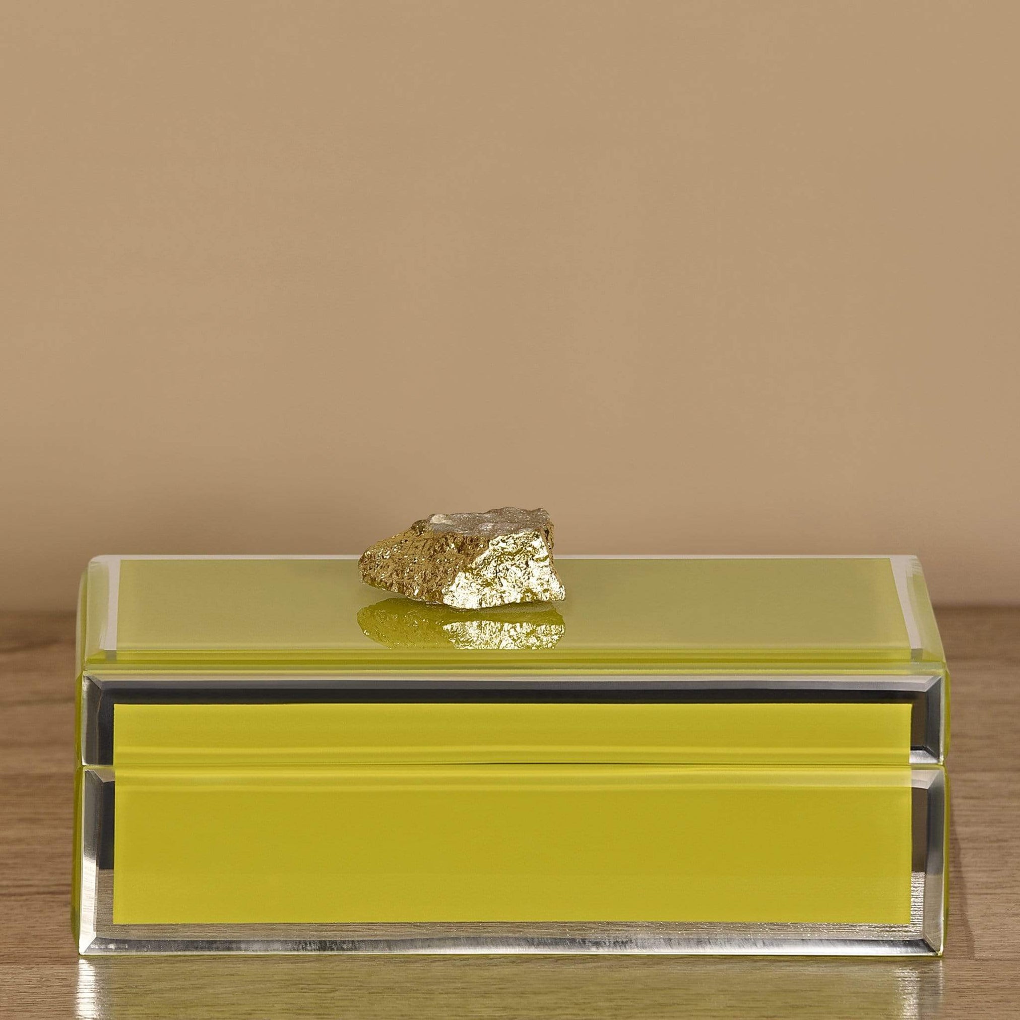 Protect your precious small valuables with style in this elegant glass jewelry box. Crafted in a delightful lime green hue this trinket box boasts clean, contemporary lines and a distinctive gold-finished stone knob, adding a touch of sophistication to its sleek design.