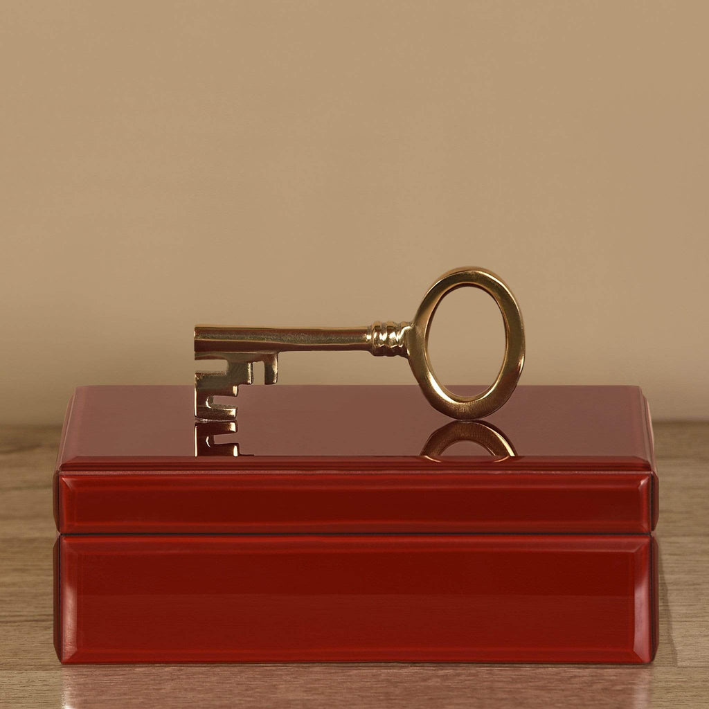 Protect your treasures with both style and security using this sophisticated jewelry box. Designed in a bold shade of red, this elegant jewelry box boasts a distinctive gold-finished key that serves as a unique handle for effortlessly opening and closing it.