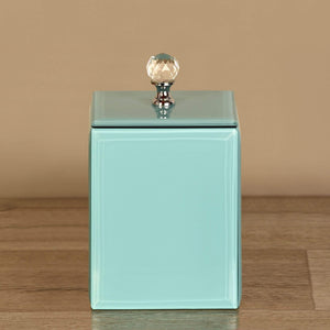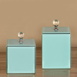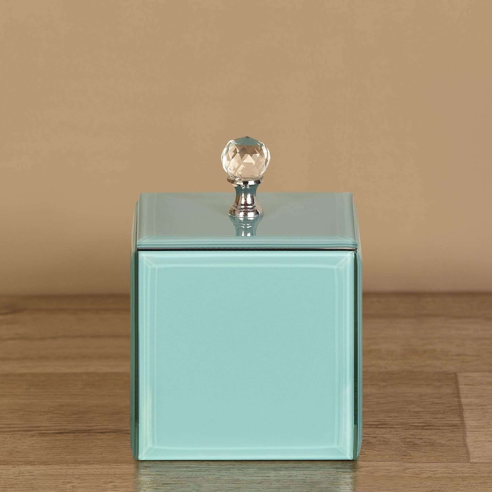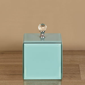 This elegant Jewelry Box features a contemporary square design with a glossy Tiffany blue finish, perfect for storing small items, jewelry, and treasured mementos. Its glamorous charm is enhanced by the dazzling glass knob on the lid, adding a final touch of sophistication to this exquisite jewelry box.