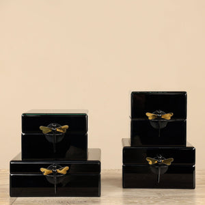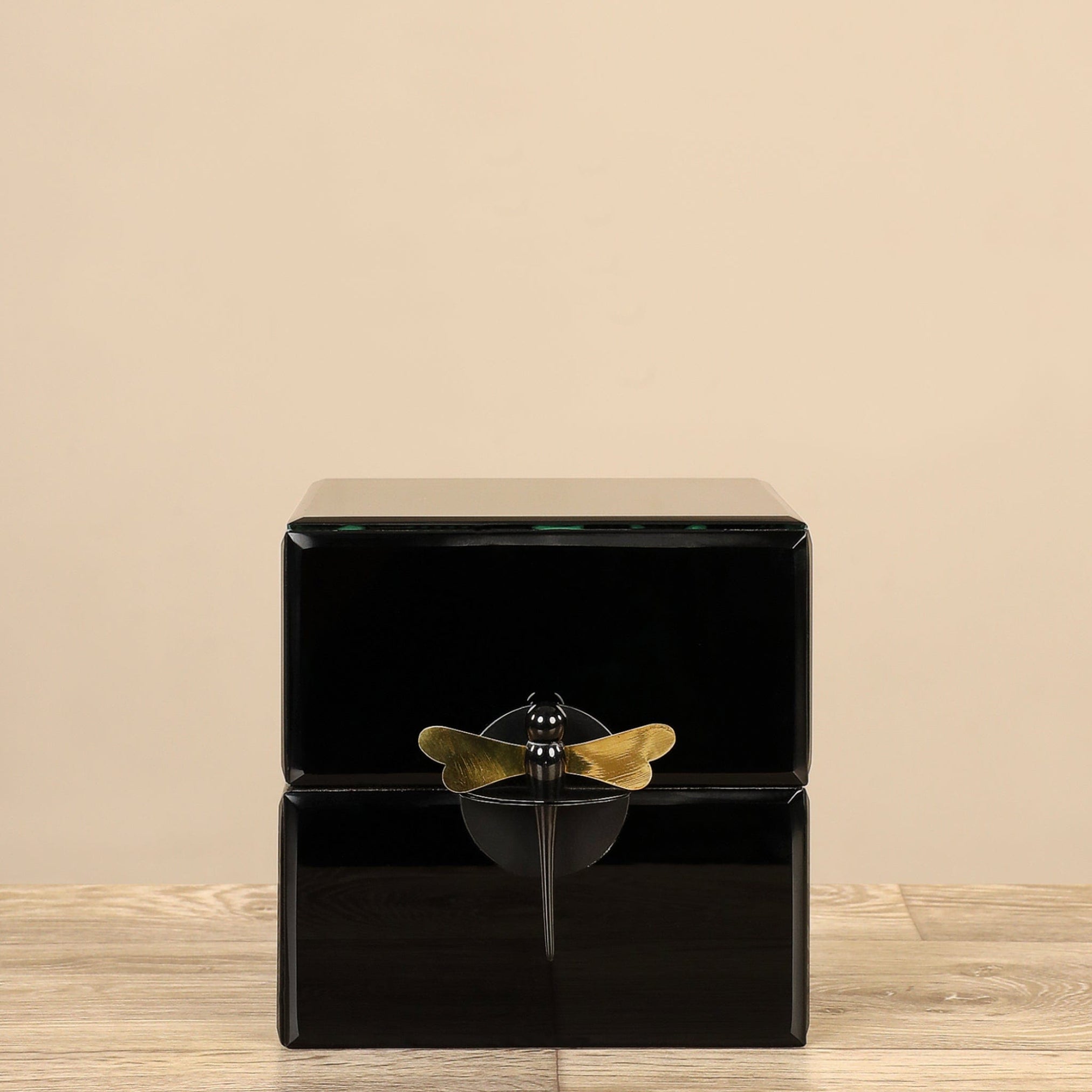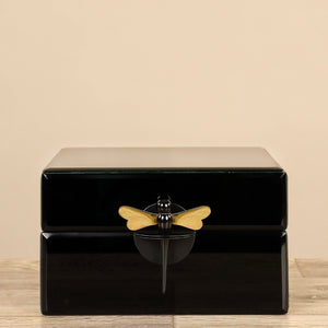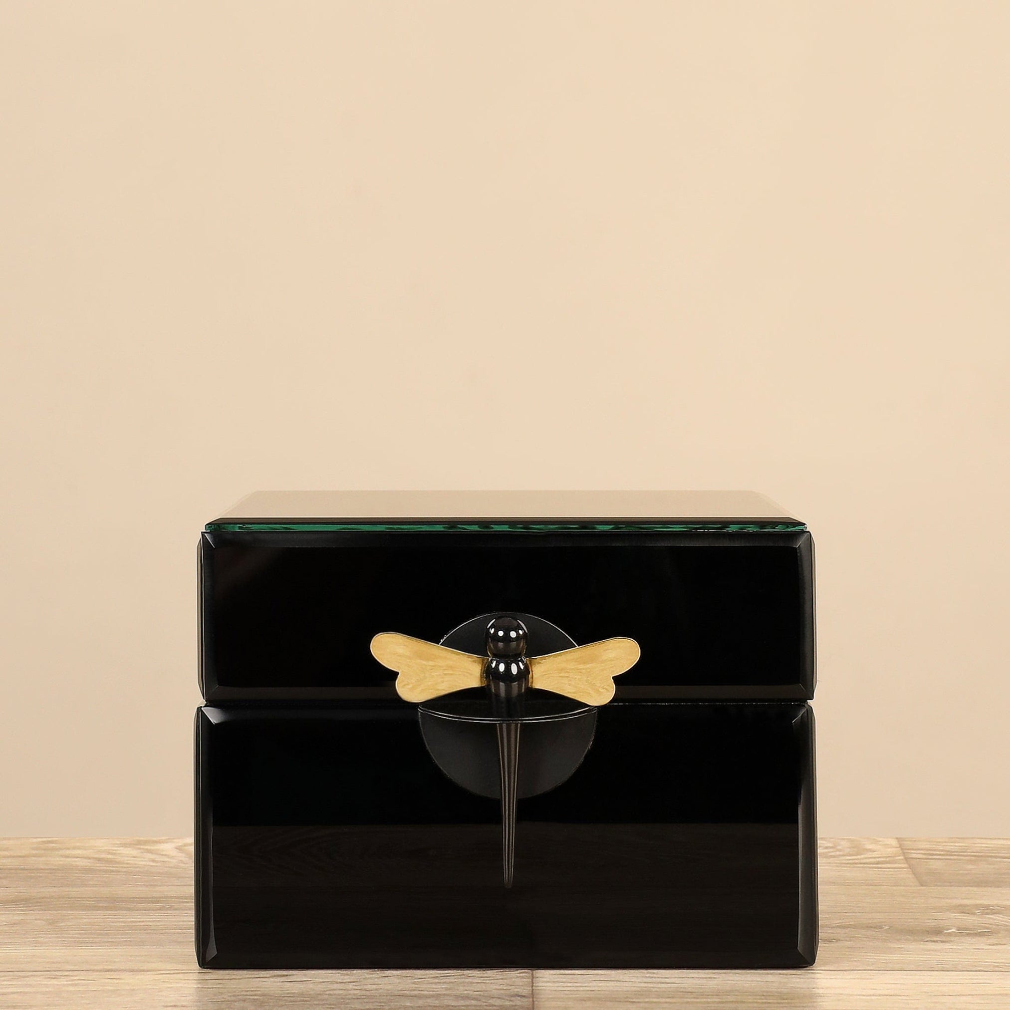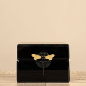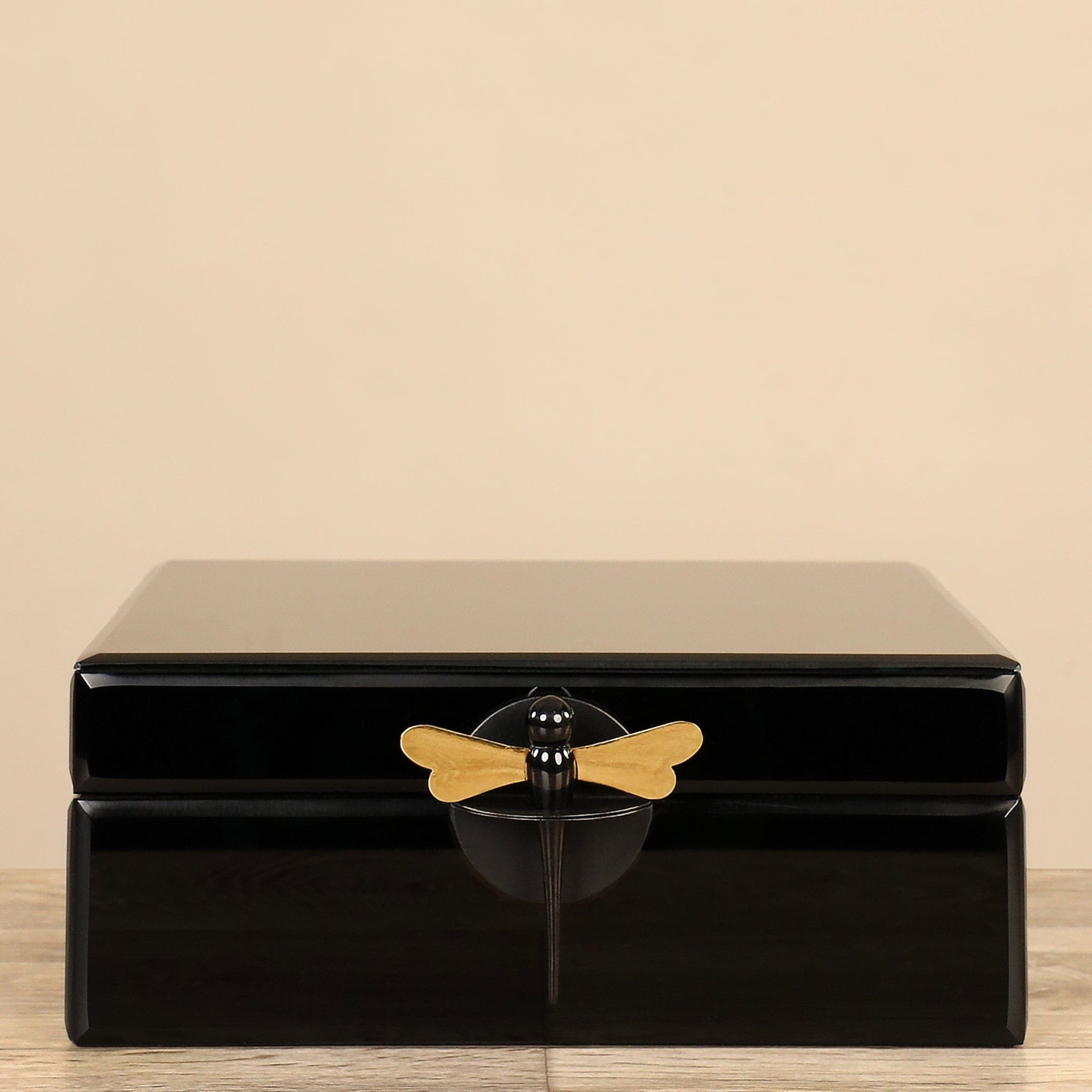 Adorned with a glossy and captivating black finish, this elegant Jewelry Box boasts a distinctive dragonfly clasp that sets it apart. With its perfect size for accommodating everything from precious jewelry to cherished mementos, this sleek box is guaranteed to add appeal to any surface.
