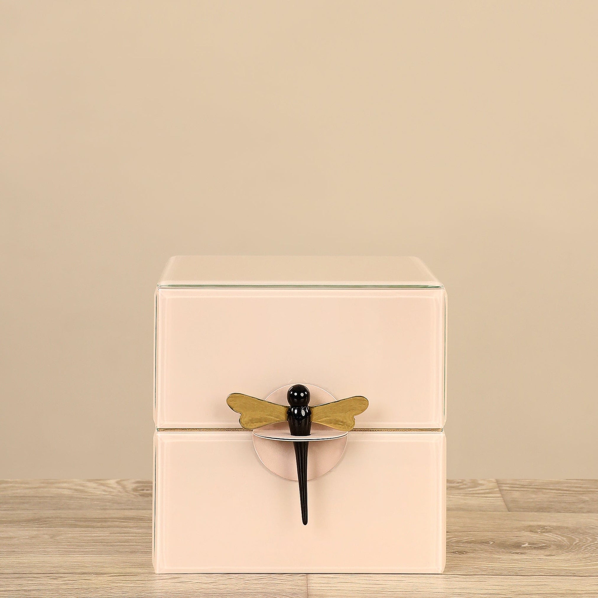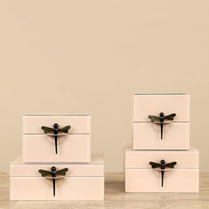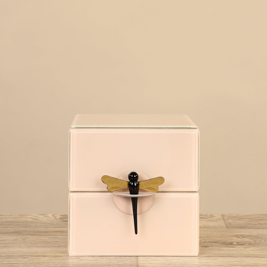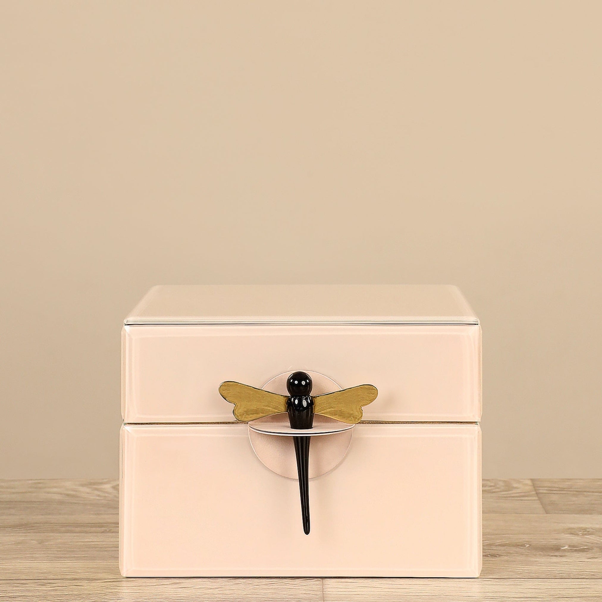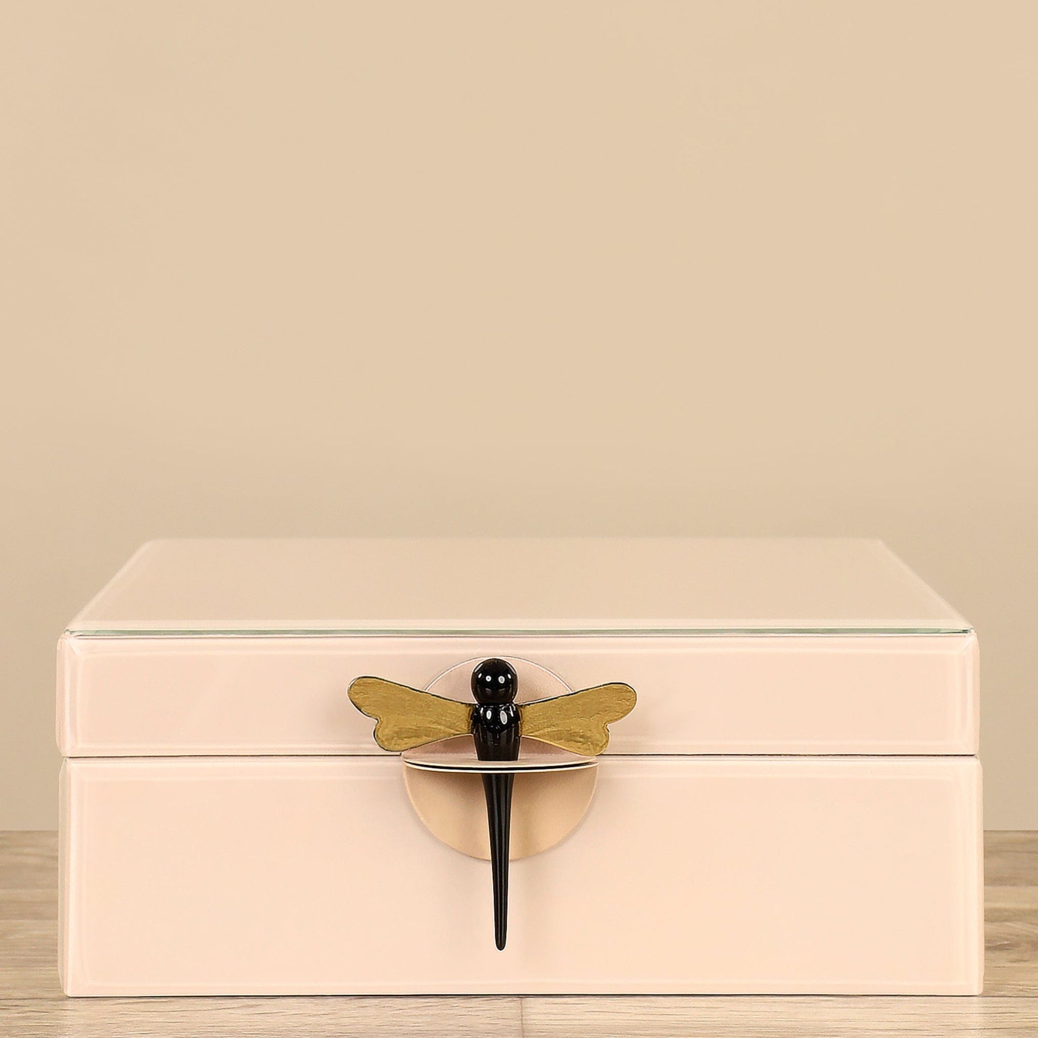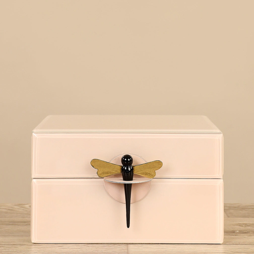 Adorned with a glossy and pretty blush pink finish, this elegant Jewelry Box boasts a distinctive dragonfly clasp that sets it apart. With its perfect size for accommodating everything from precious jewelry to cherished mementos, this sleek box is guaranteed to add appeal to any surface.