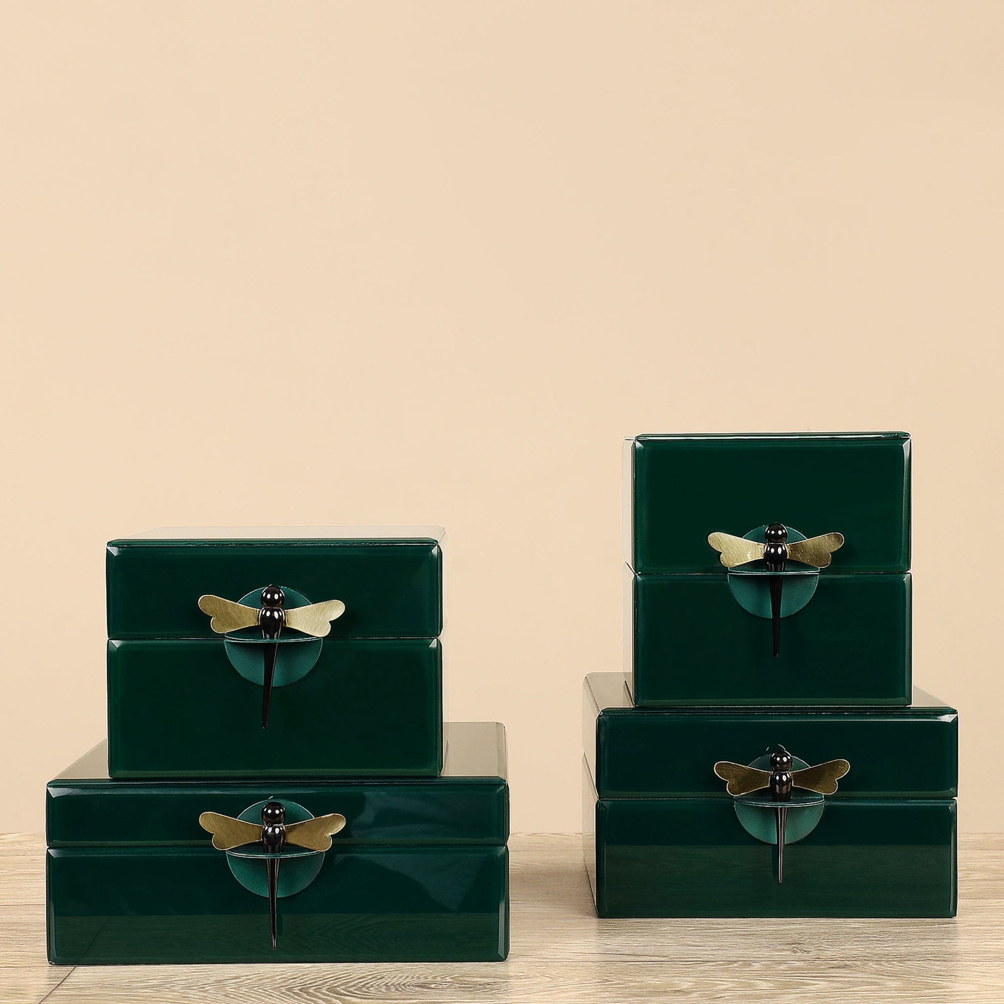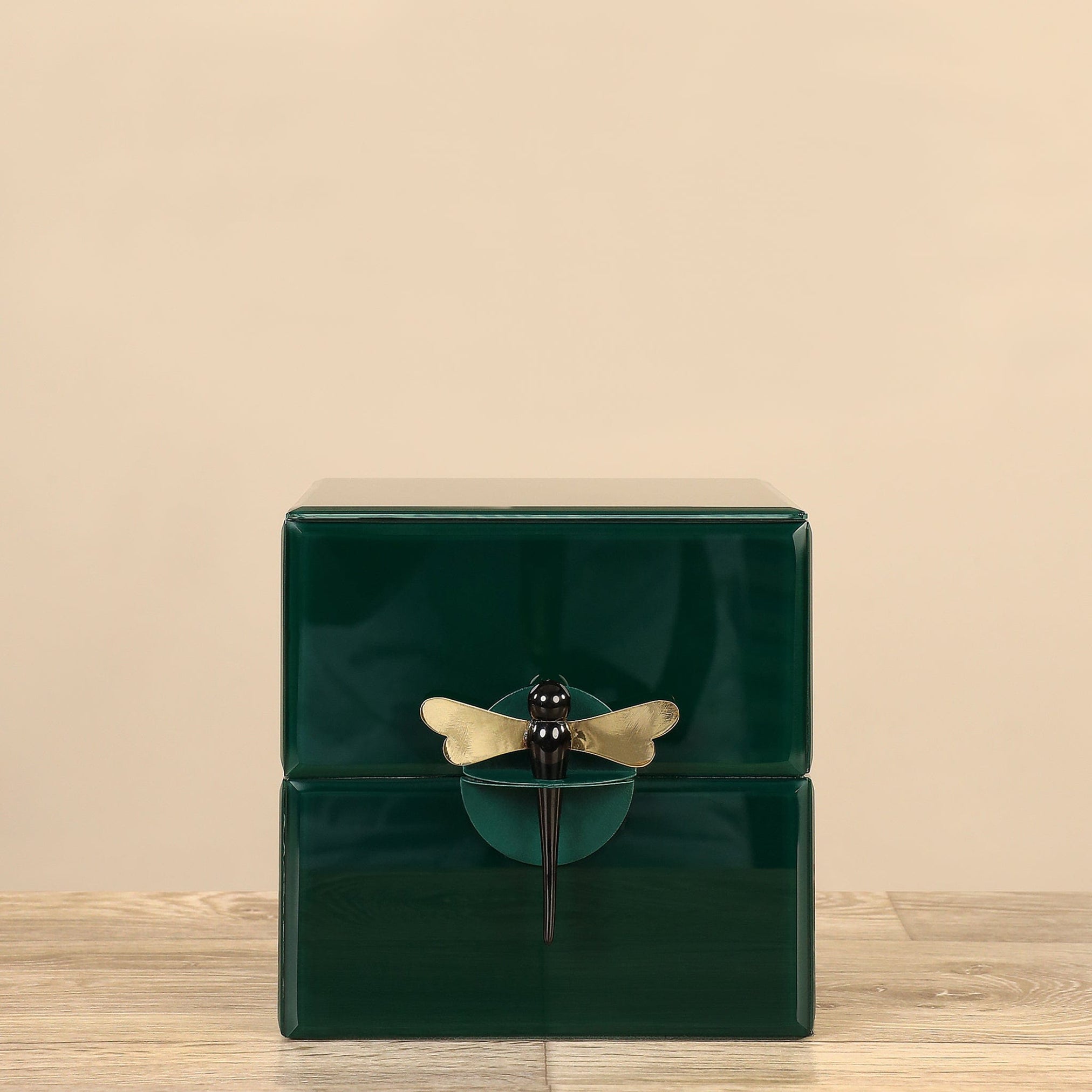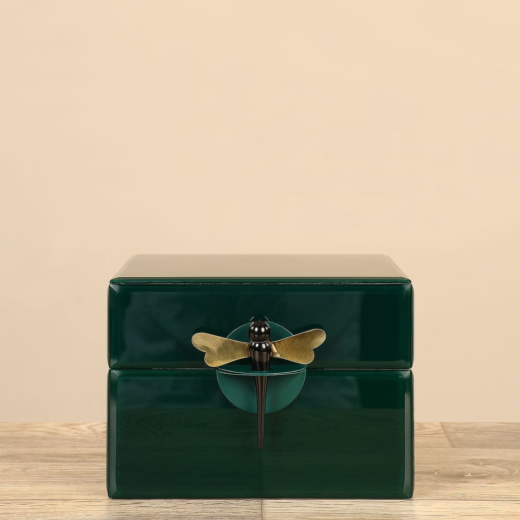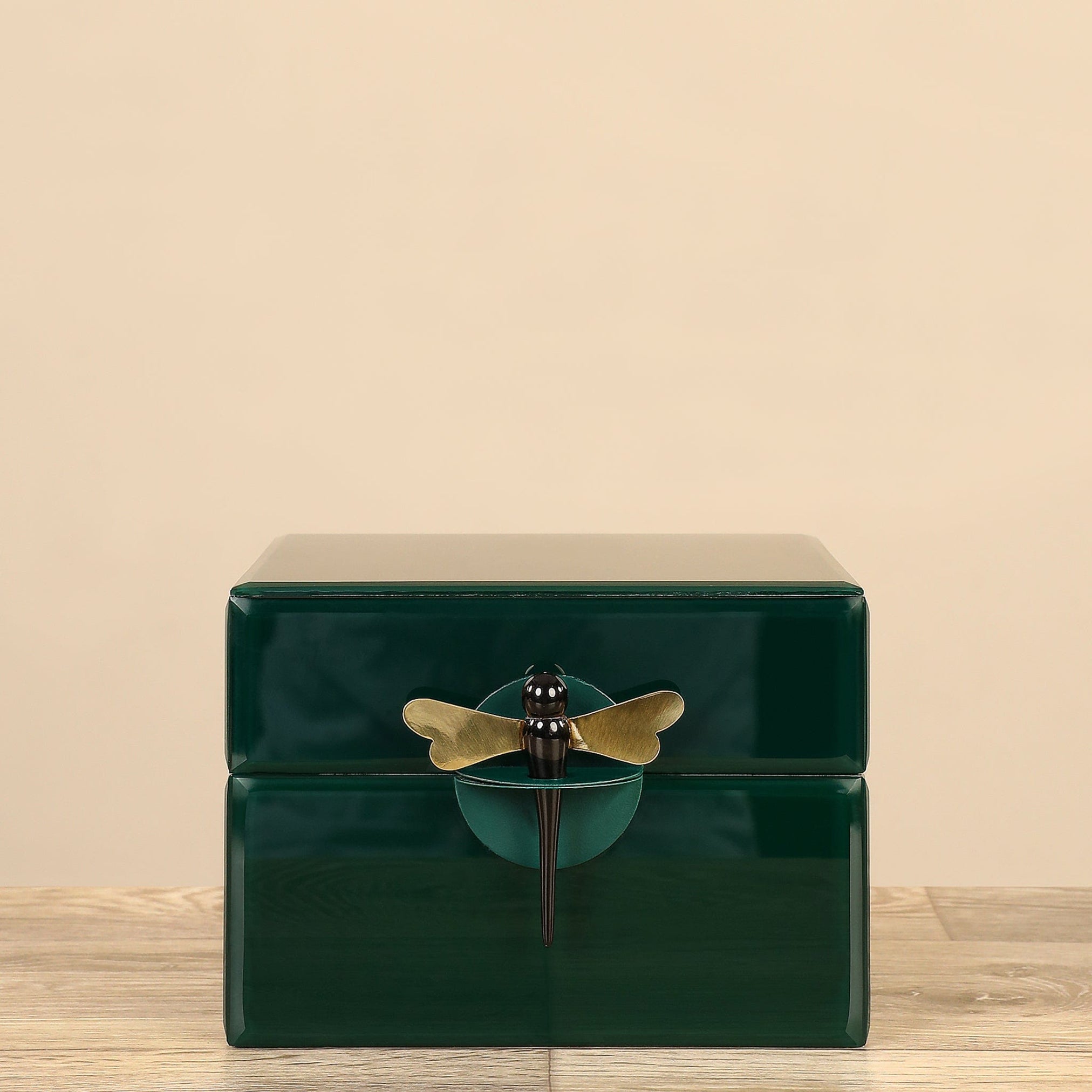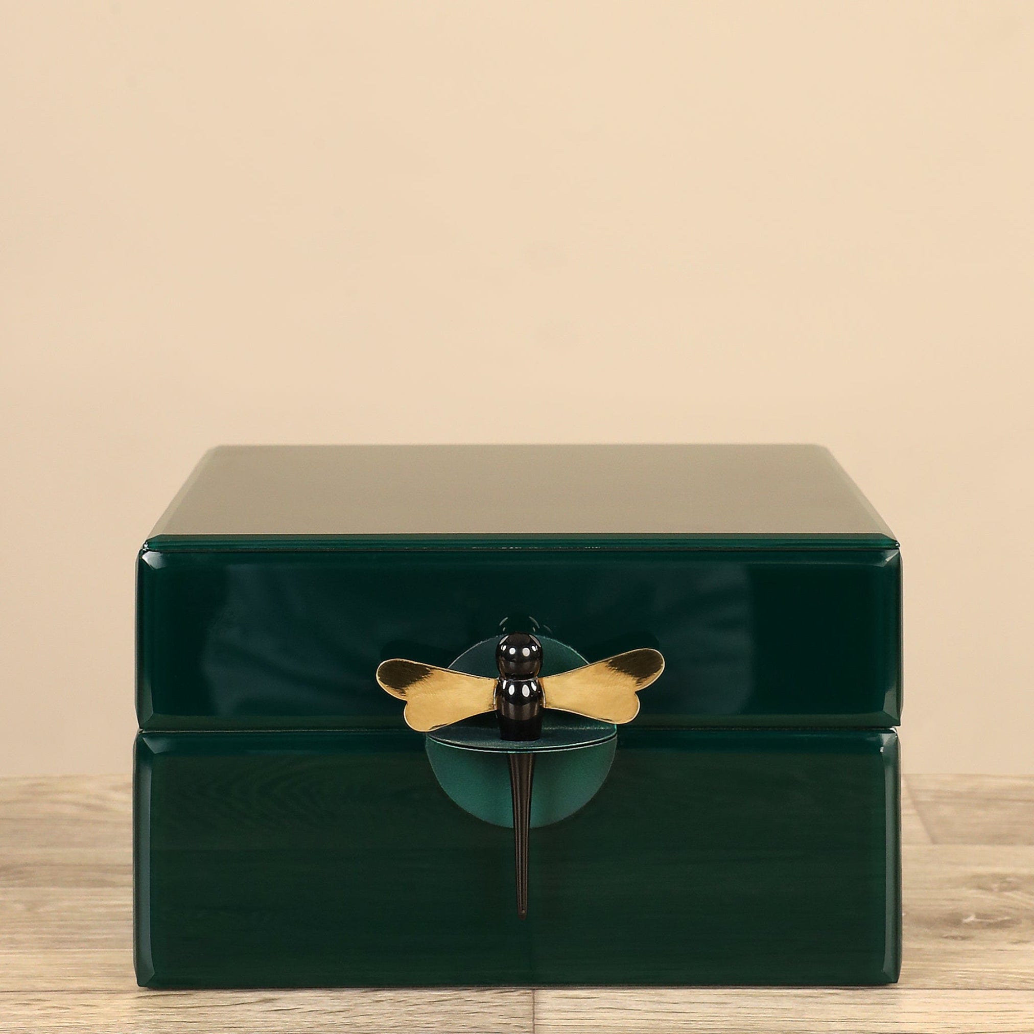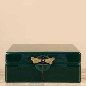 Adorned with a glossy and brilliant bottle green finish, this elegant Jewelry Box boasts a distinctive dragonfly clasp that sets it apart. With its perfect size for accommodating everything from precious jewelry to cherished mementos, this sleek box is guaranteed to add appeal to any surface.