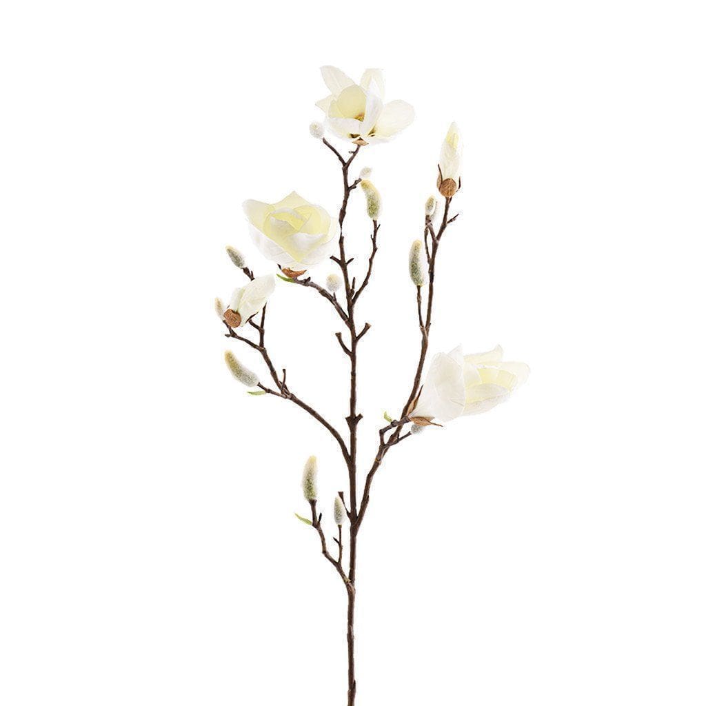 Distinguished by its glossy green leaves, the Magnolia has large petaled blooms perfect for a botanical accent in any interior. Pair this lovely artificial Magnolia Stem with other flowers and greenery or fill a vase with its extravagant blooms for a lush display. Beautifully crafted, this faux magnolia stem could also be added to a wreath or bouquet.