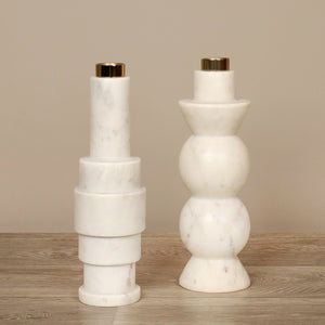 A beautiful example of contemporary style these candle holders stand out as statement-making decor pieces. Perfect for taper candles these set of candle holders are crafted in marble and detailed with metal to lend interest and allure to any setting.