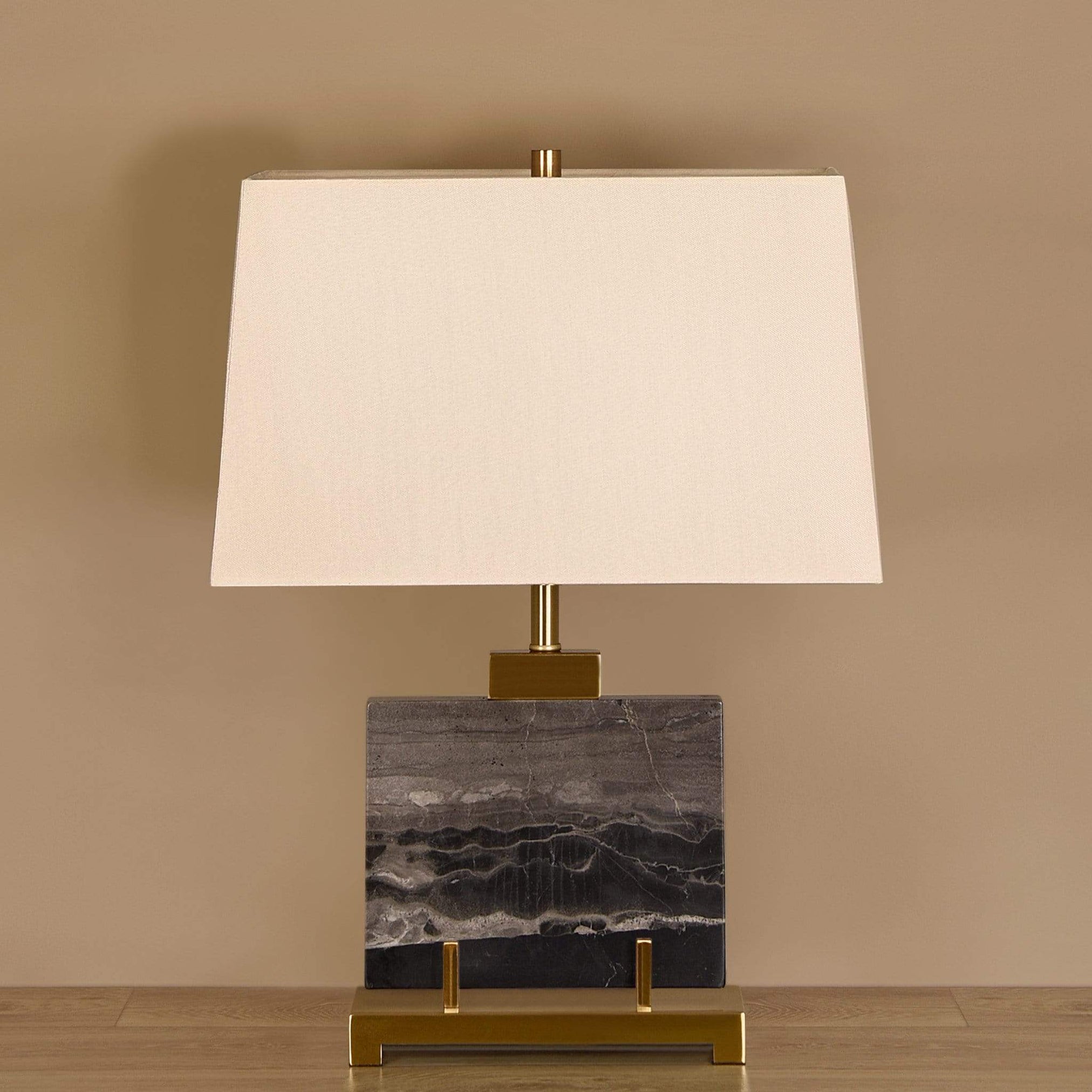 Light up a room with brilliant yet soft illumination thanks to this contemporary Marble Table Lamp. The base is beautifully veined marble seated on a gleaming metal base for contrast. The shade has a unique rectangular shape and fabric material to diffuse the light perfectly.