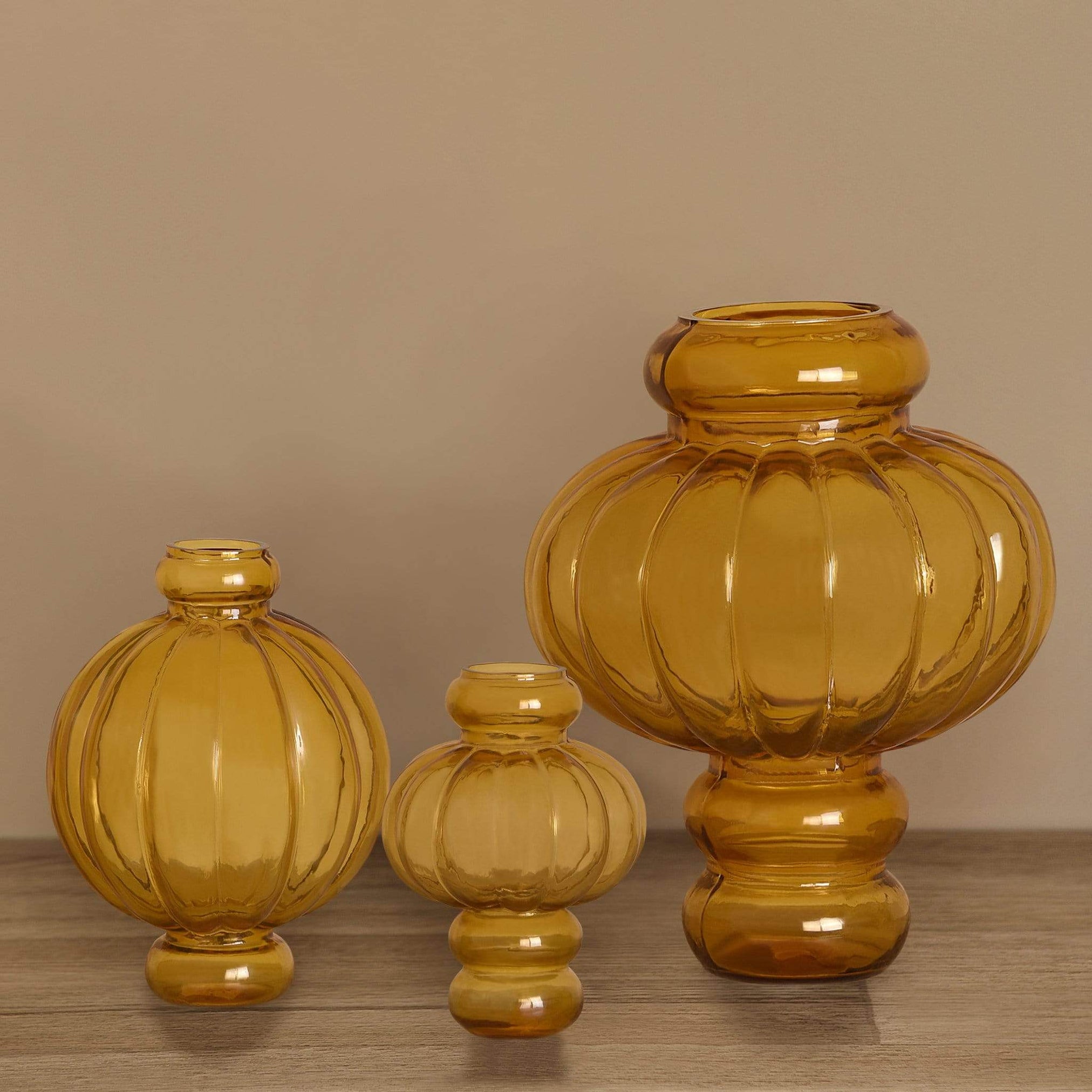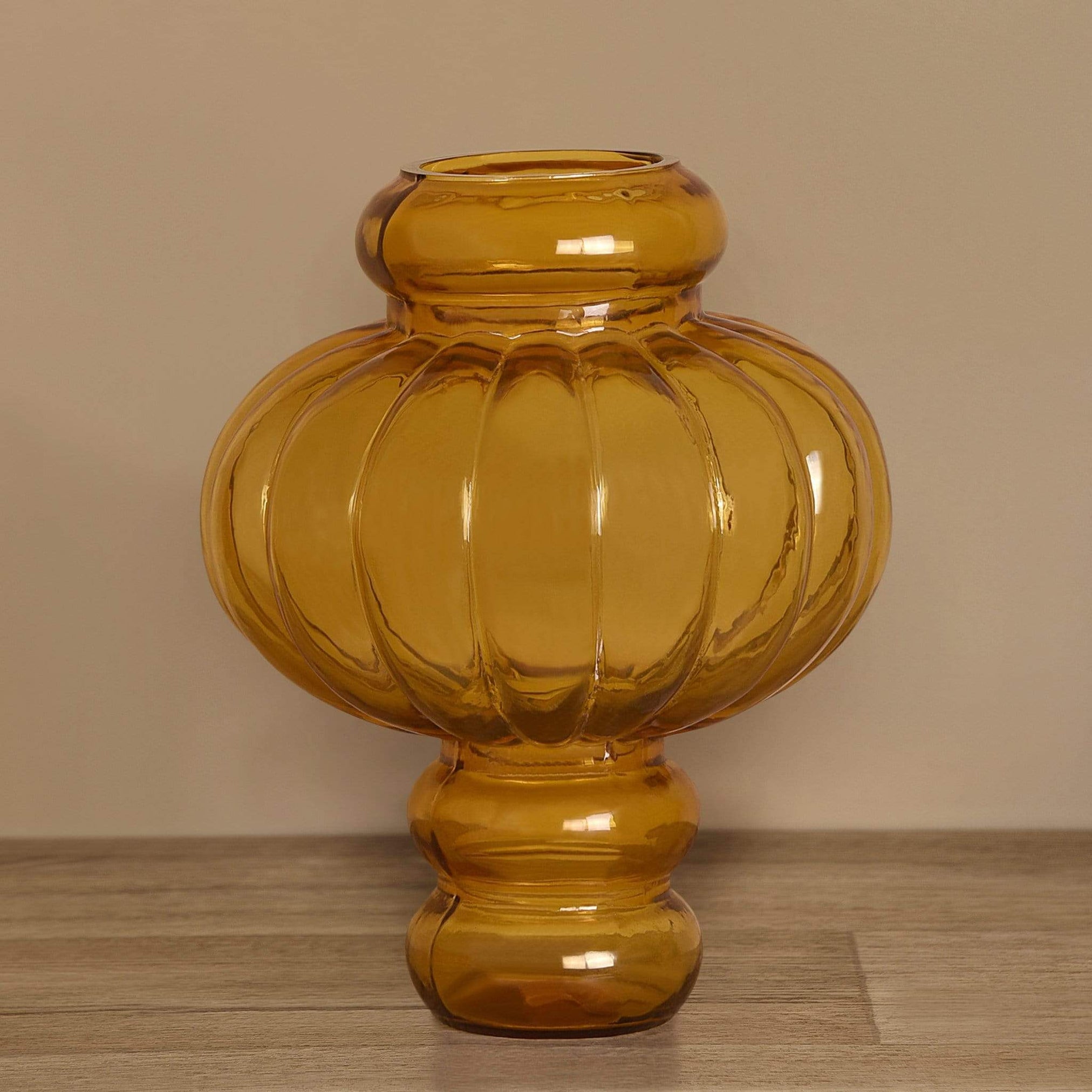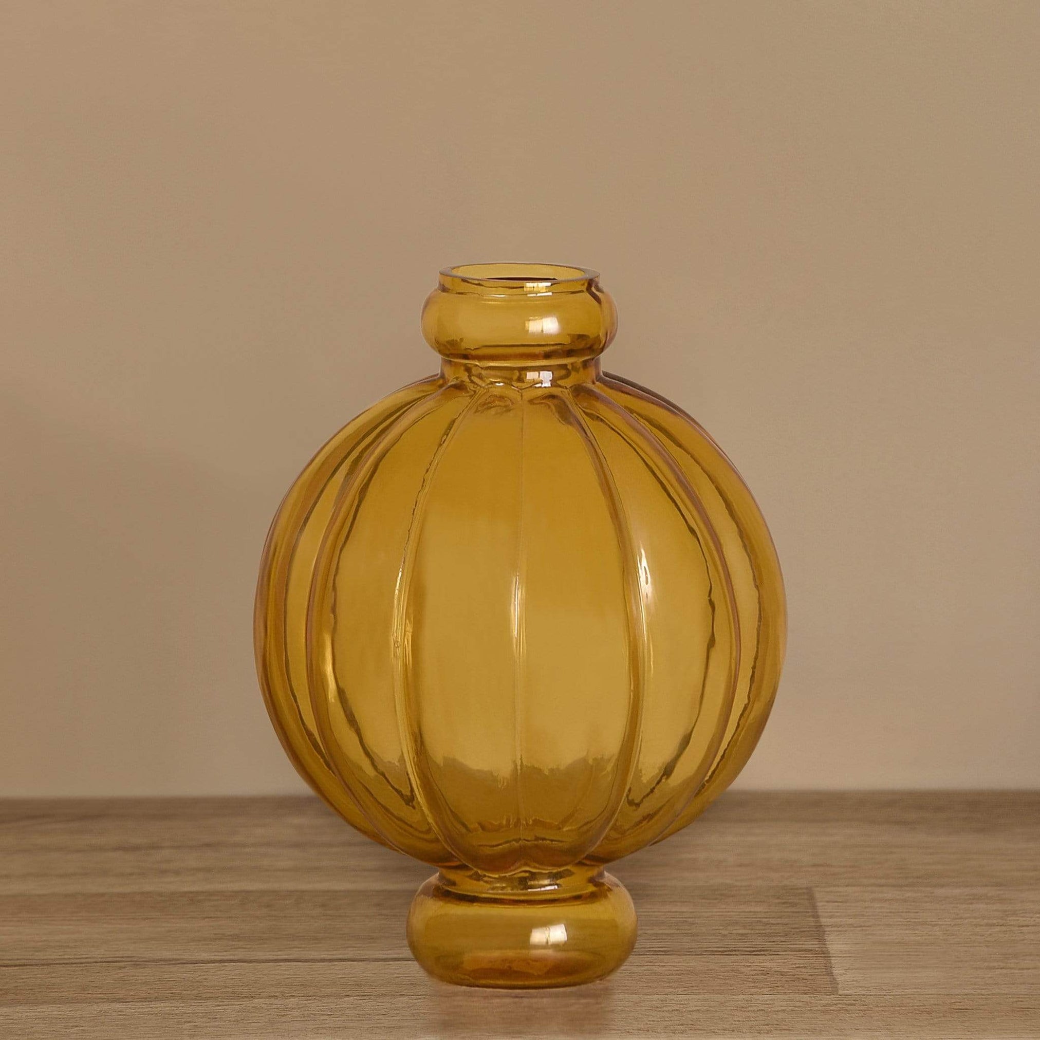 The distinctive form and beautiful ribbed design of this glass vase make it a sophisticated option for any decor style. Whether used as a standalone piece or filled with artificial flowers or blossoming branches, the Melon Vase can stand alone as a striking centerpiece on a shelf, table, or mantel, or be arranged in a group to make a bold visual statement.