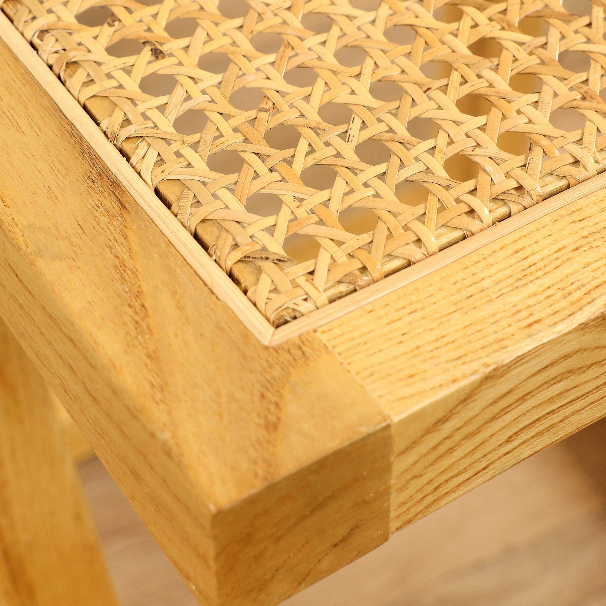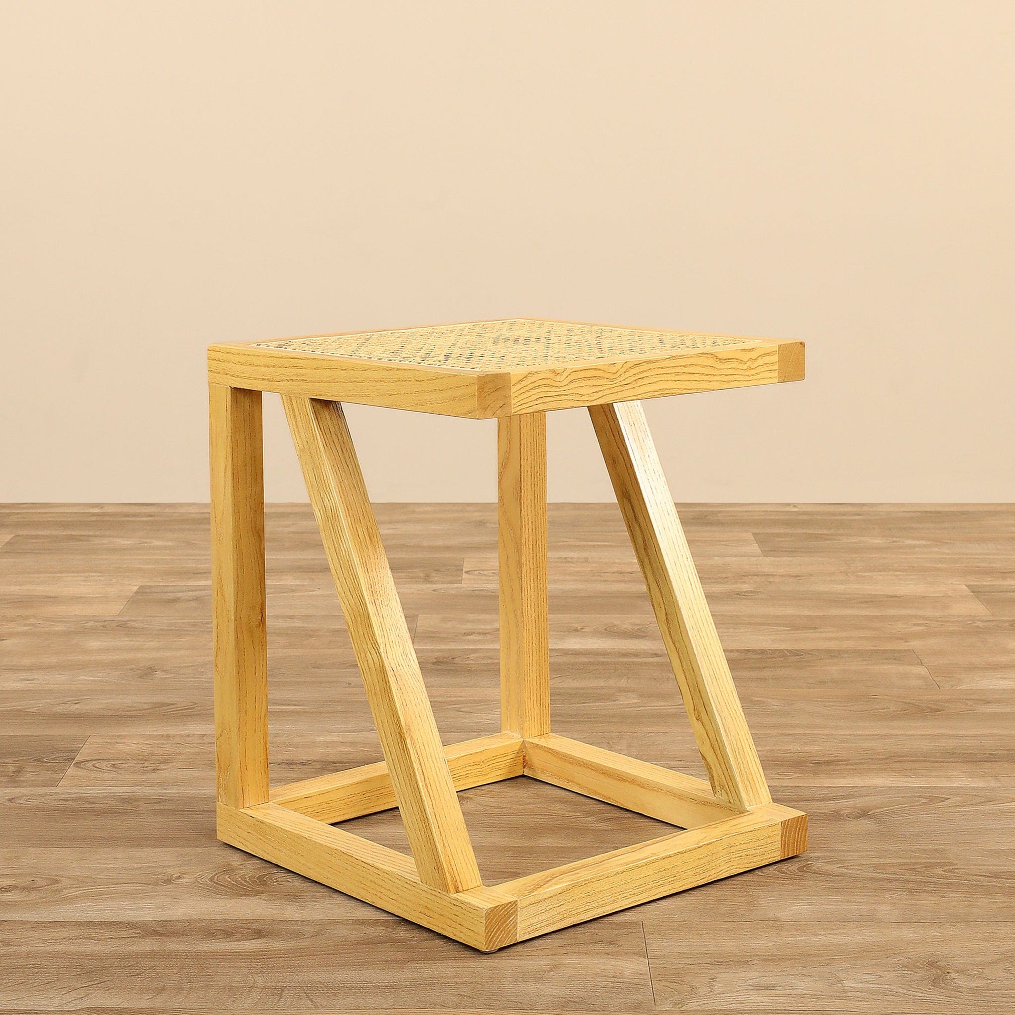 Crafted with a light and airy cane top the Mia side table has a wonderful angular base to show off its singular style. Perfectly balanced to support a table lamp or vase this side table has a light natural finish to coordinate with many decorating styles.