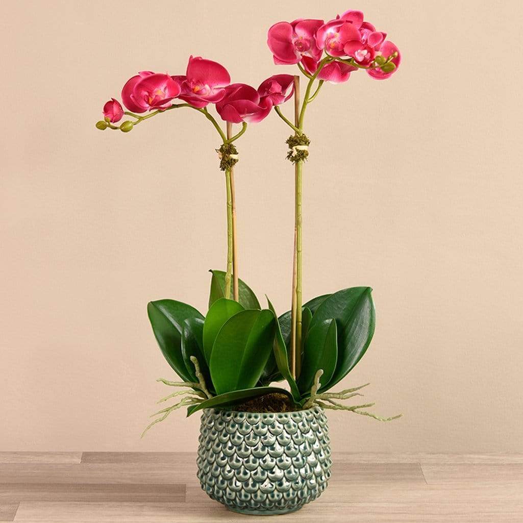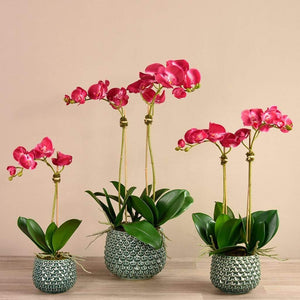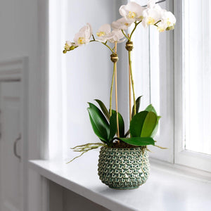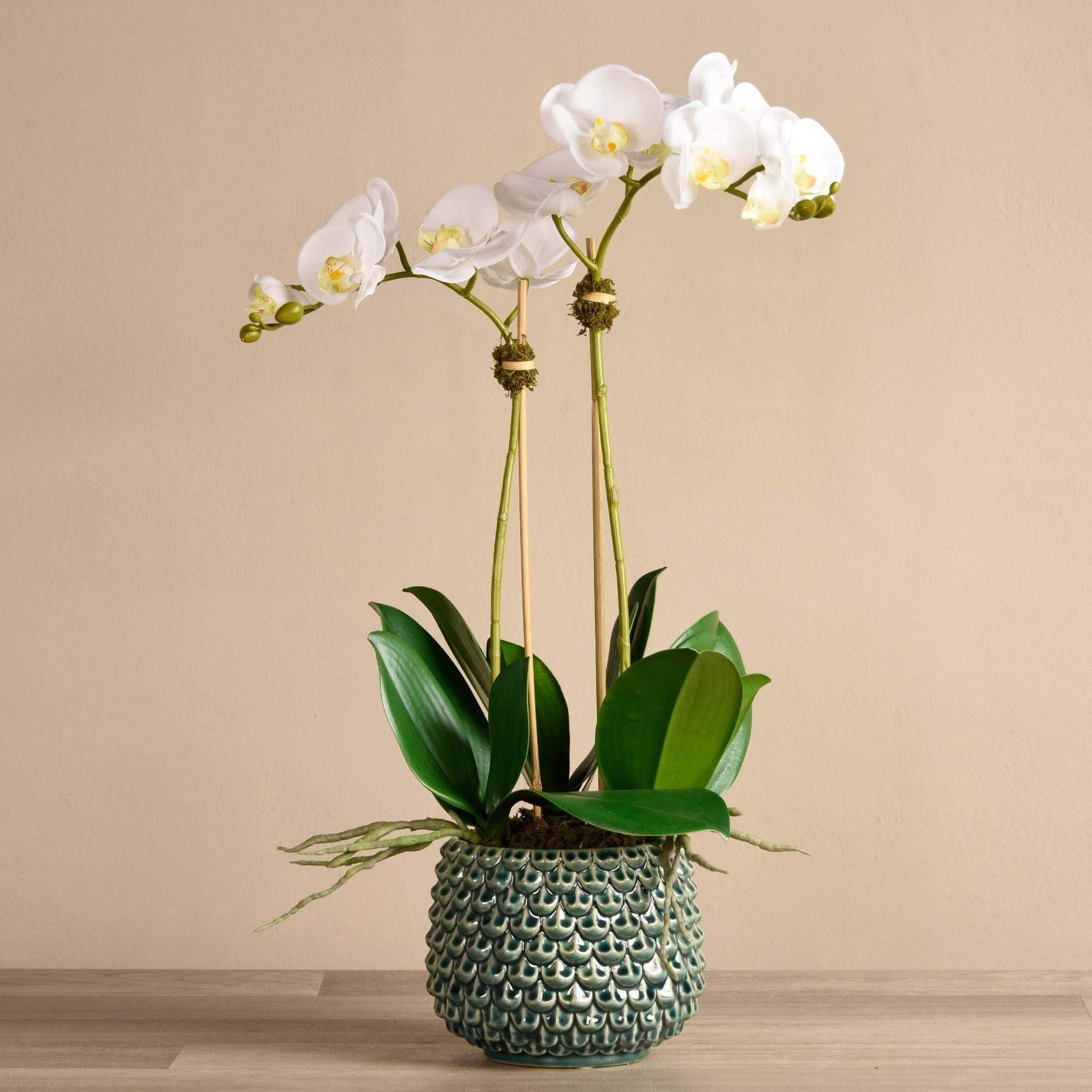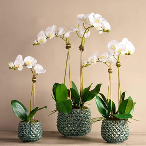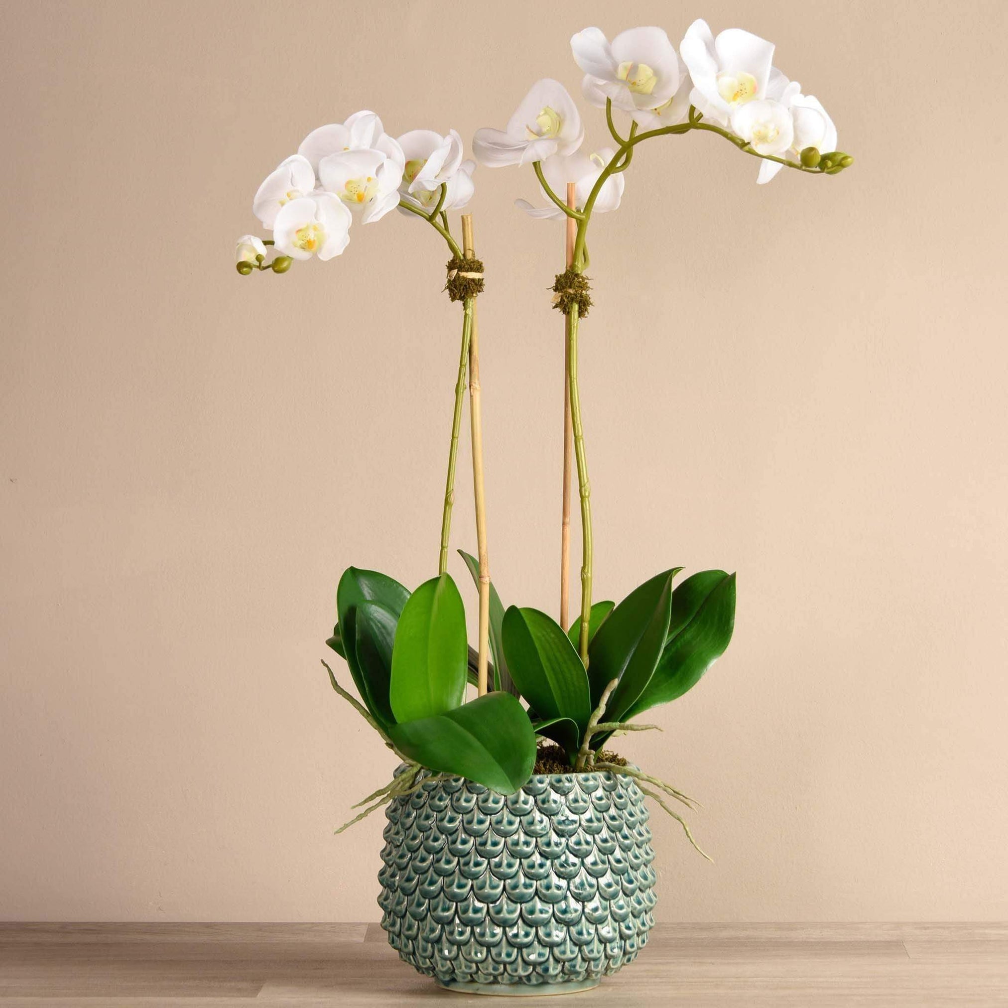Bloomrs Pearl Artificial Orchid Arrangement is the perfect way to soften a masculine or industrial interior. With thoughtfully patterned teal ceramic vases, white faux orchids, and vibrantly green leaves, this silk floral centerpiece is neutral in tone and feminine by design. Place these on the kitchen counter, the breakfast table, or the living room floor for a brighter day every day. Made from the highest quality, real-touch orchids and always made to order by real florists.