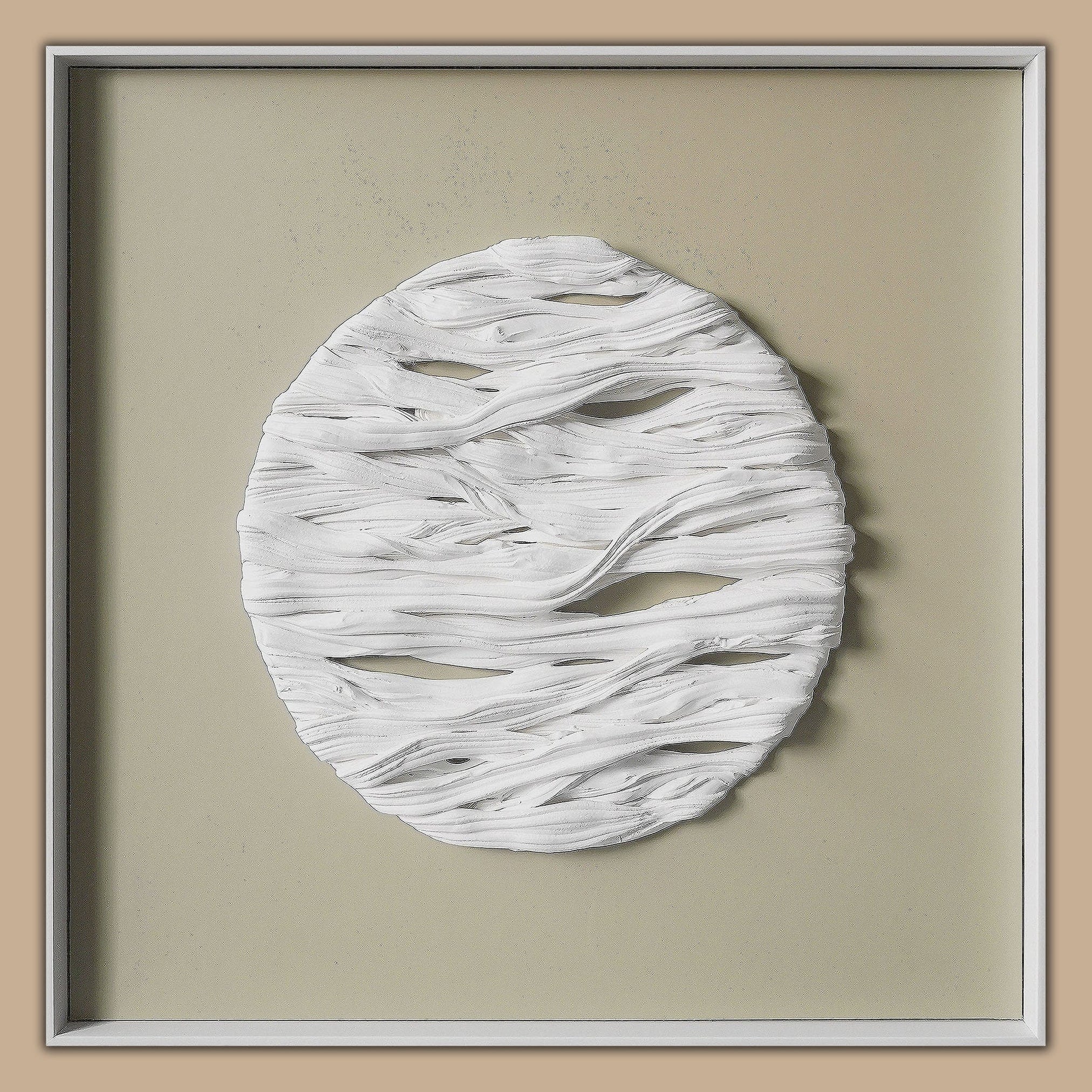 Enhance your aesthetic with this silver framed work of art. The composition is alive with soft clay shaping, acrylic sheeting, and a brushed leather bottom to create a dynamic visual resulting in a contemporary artwork that captivates with its depth and composition.