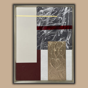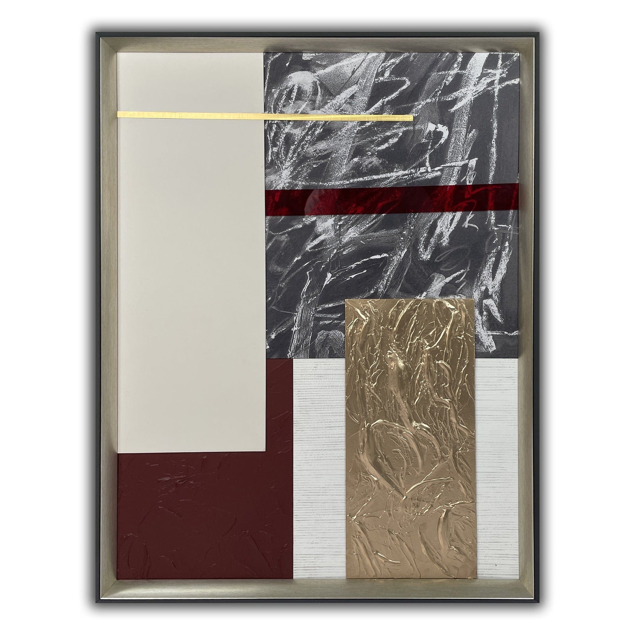 Transform a bare wall with this abstract painting. Its contemporary design utilizes stainless steel plate grinding, leather, acrylic printing, T-strip, and gold foil to complement various decor styles effortlessly. Framed in champagne for impact, this sophisticated artwork offers a simple yet distinctive way to rejuvenate a space.