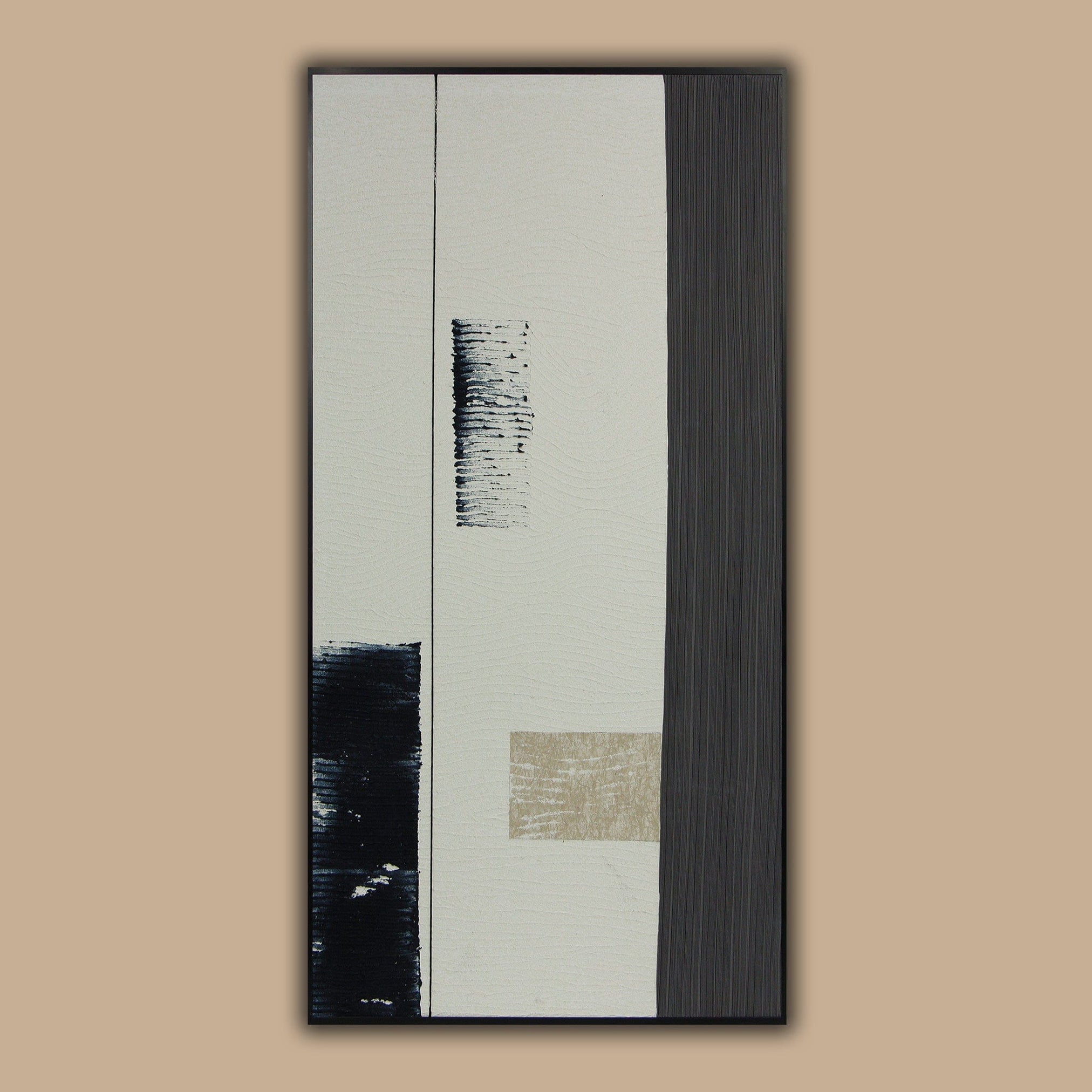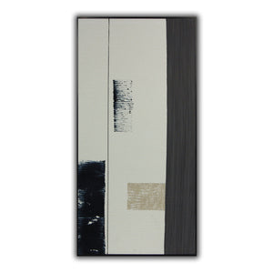 Painted with oil, this abstract artwork is encased in a sleek black frame, providing a sophisticated contrast to the graphic tones within the composition. This beautifully crafted handmade oil painting prominently showcases the contemporary flair and skillful use of placement, making it an ideal addition to various decorating styles.