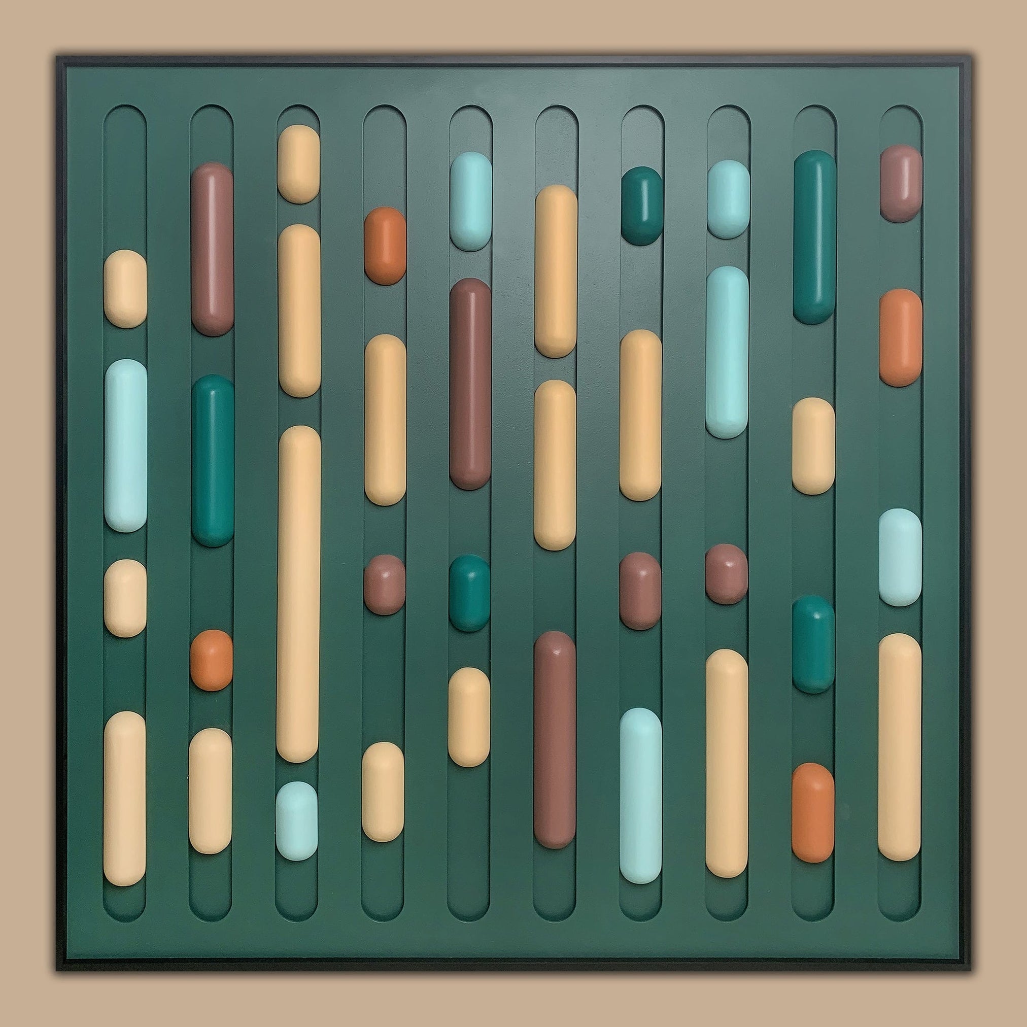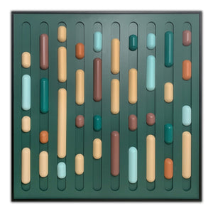 Painted with oil, this abstract artwork is encased in a sleek black frame, providing a sophisticated contrast to the composite materials within the composition. This beautifully crafted handmade oil painting prominently showcases the contemporary flair and skillful use of form and shape, making it an ideal addition to various decorating styles.
