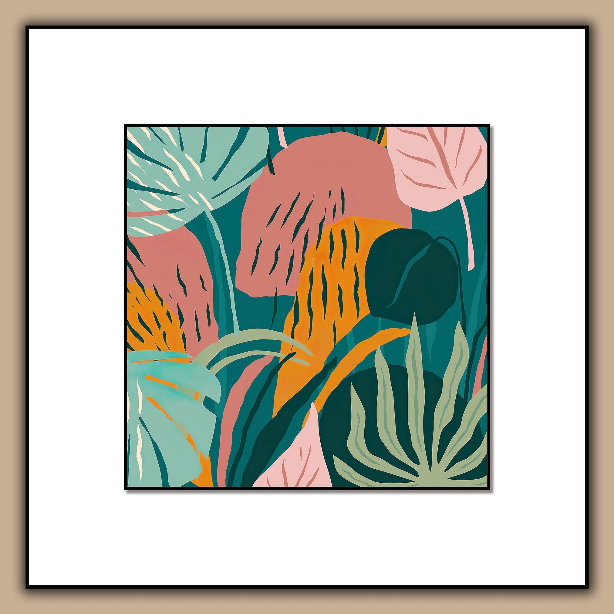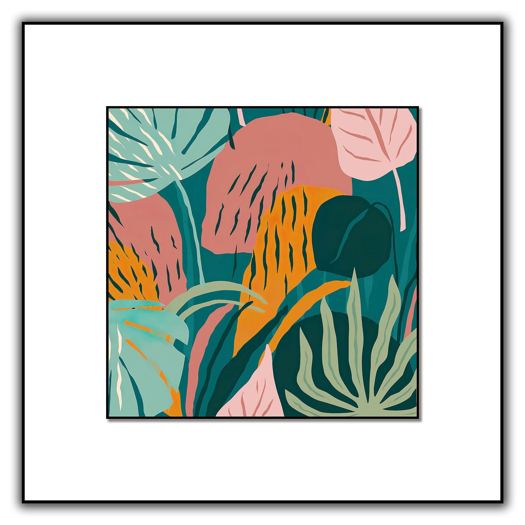 This modern take on a tropical print makes it stand out in a crowd. This 60's inspired piece is bold and colorful with a modern spin. The pink, green, and bold orange colors give this artwork depth and contrast. This works well in any room.