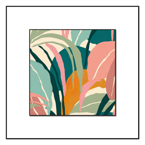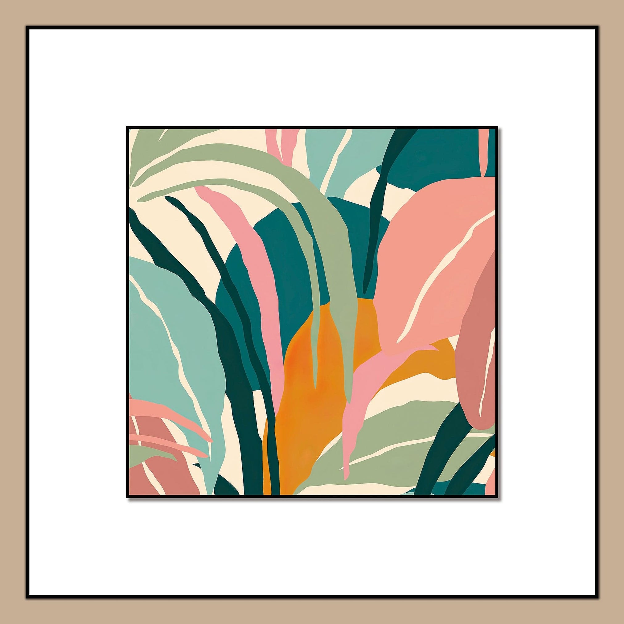 Bold and colorful this painting features a contemporary twist on a tropical theme. Filled with muted colors and leaves in varied sizes set against a neutral background this work of art is a versatile choice that will complement a variety of decorating styles.