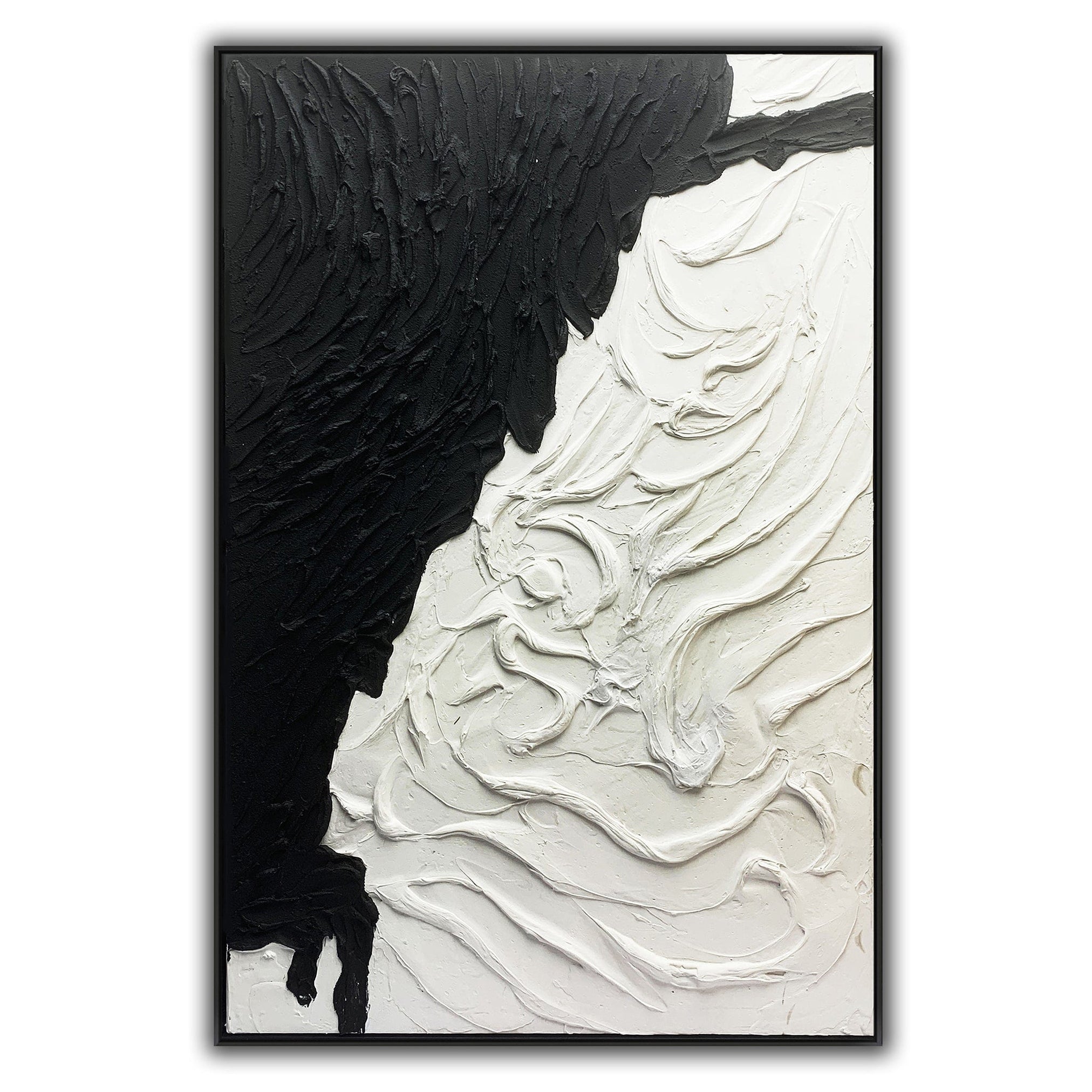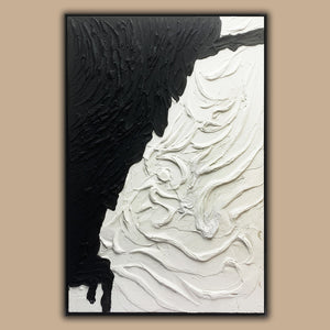 The tactile allure of this contemporary masterpiece lies in the texture that takes center stage. Composed in a captivating black and white palette, the artwork, framed in sleek black, transcends boundaries. The interplay of shadows and highlights, coupled with the tactile elements, creates a visually arresting experience perfect for a statement on any wall.