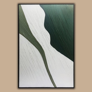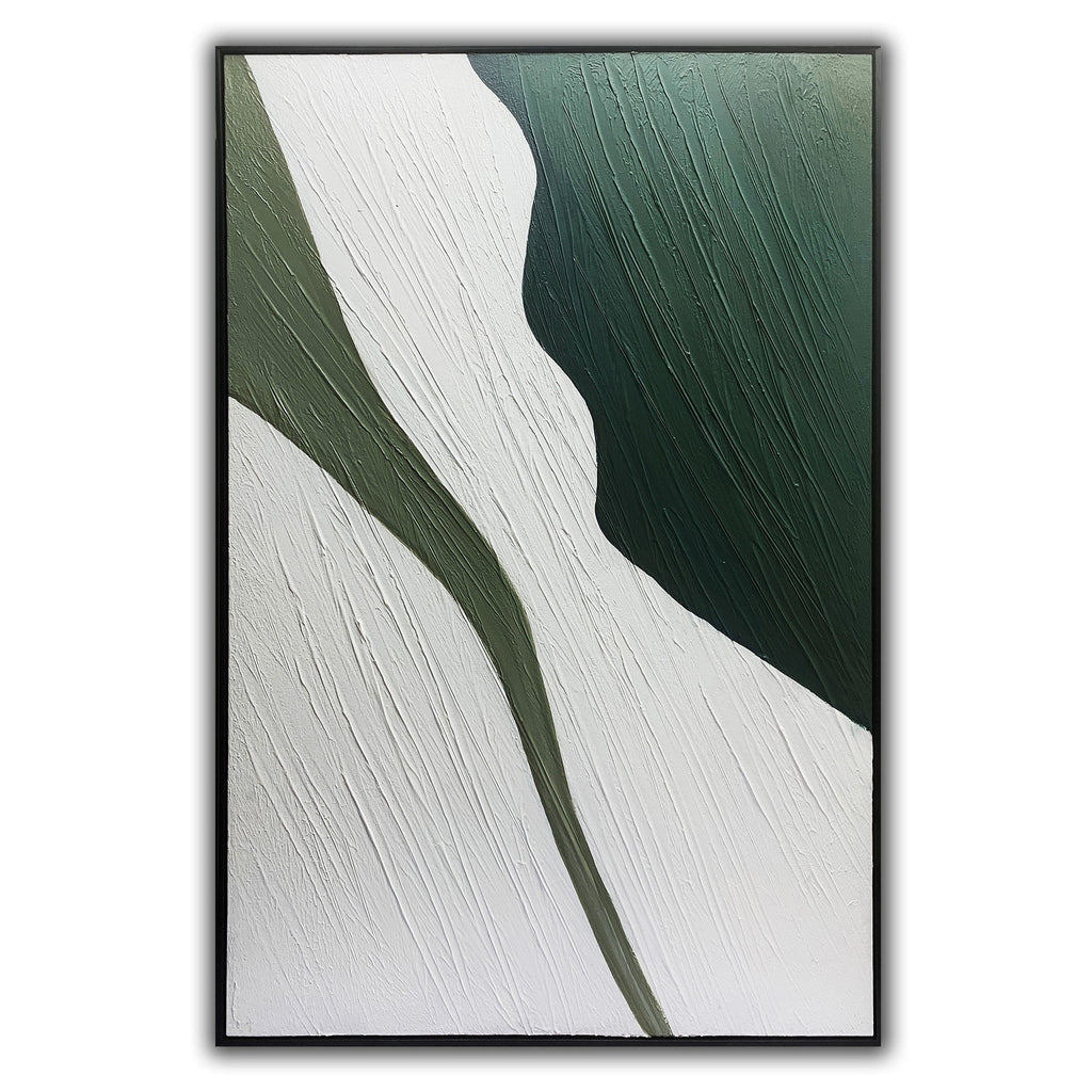 The tactile allure of this contemporary masterpiece lies in the texture that takes center stage. Composed in a captivating emerald green and white palette, the artwork, framed in sleek black, transcends boundaries. The interplay of shadows and highlights, coupled with the tactile elements, creates a visually arresting experience perfect for a statement on any wall.