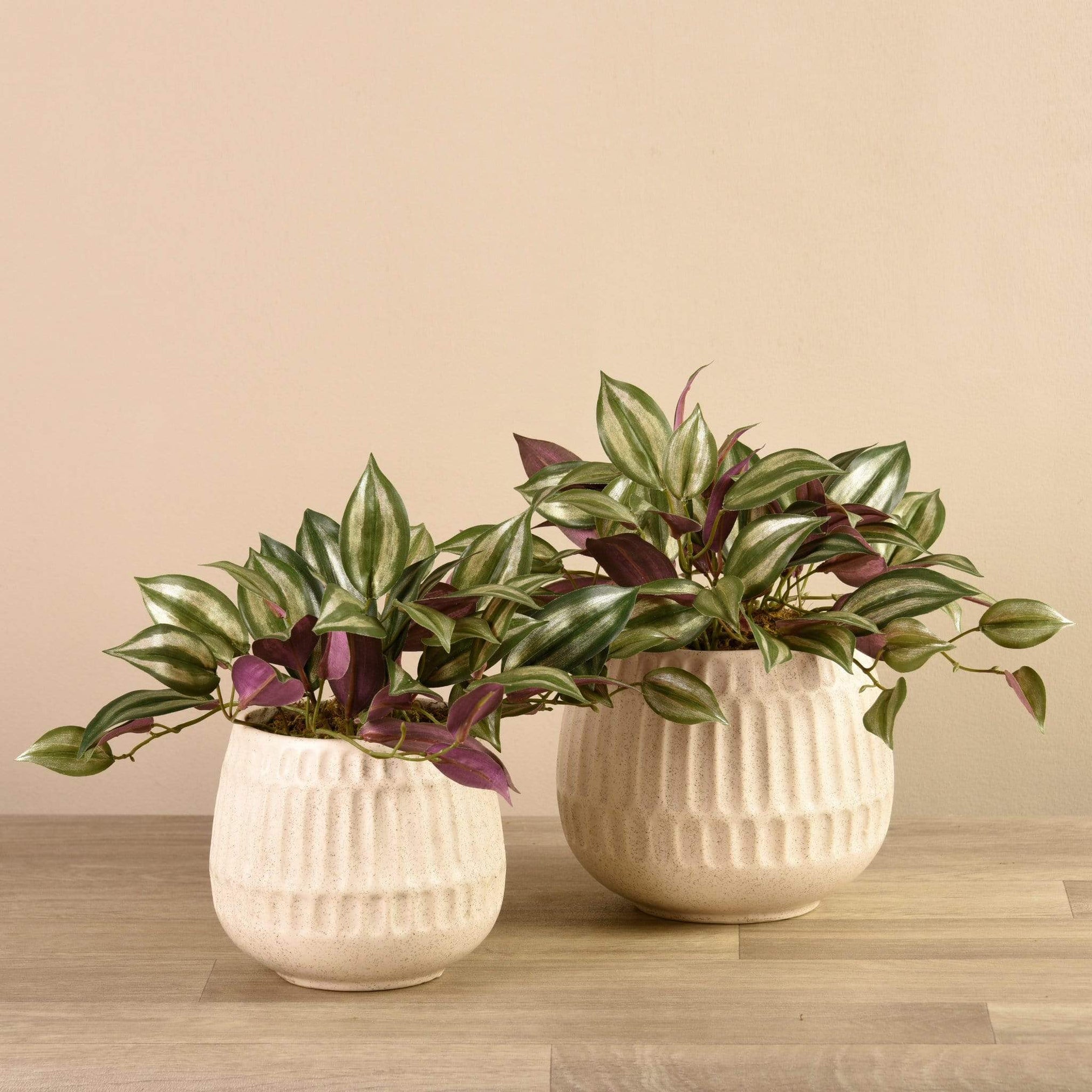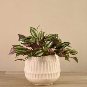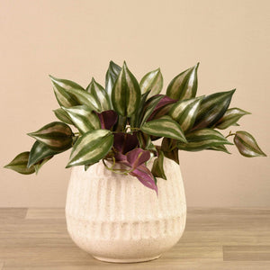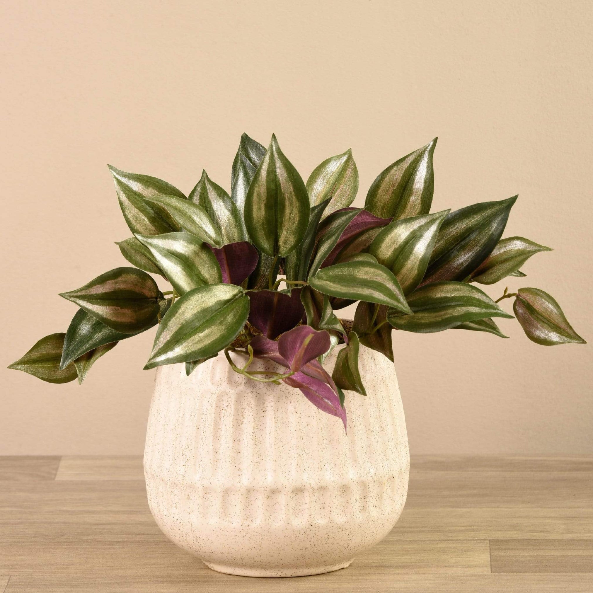 Add a hint of sweetness to your coffee table or bookshelf with this artificial vanilla leaf plant. Its muted striped green and maroon leaves look incredibly lifelike, contrasting beautifully against the simple white stone pot.