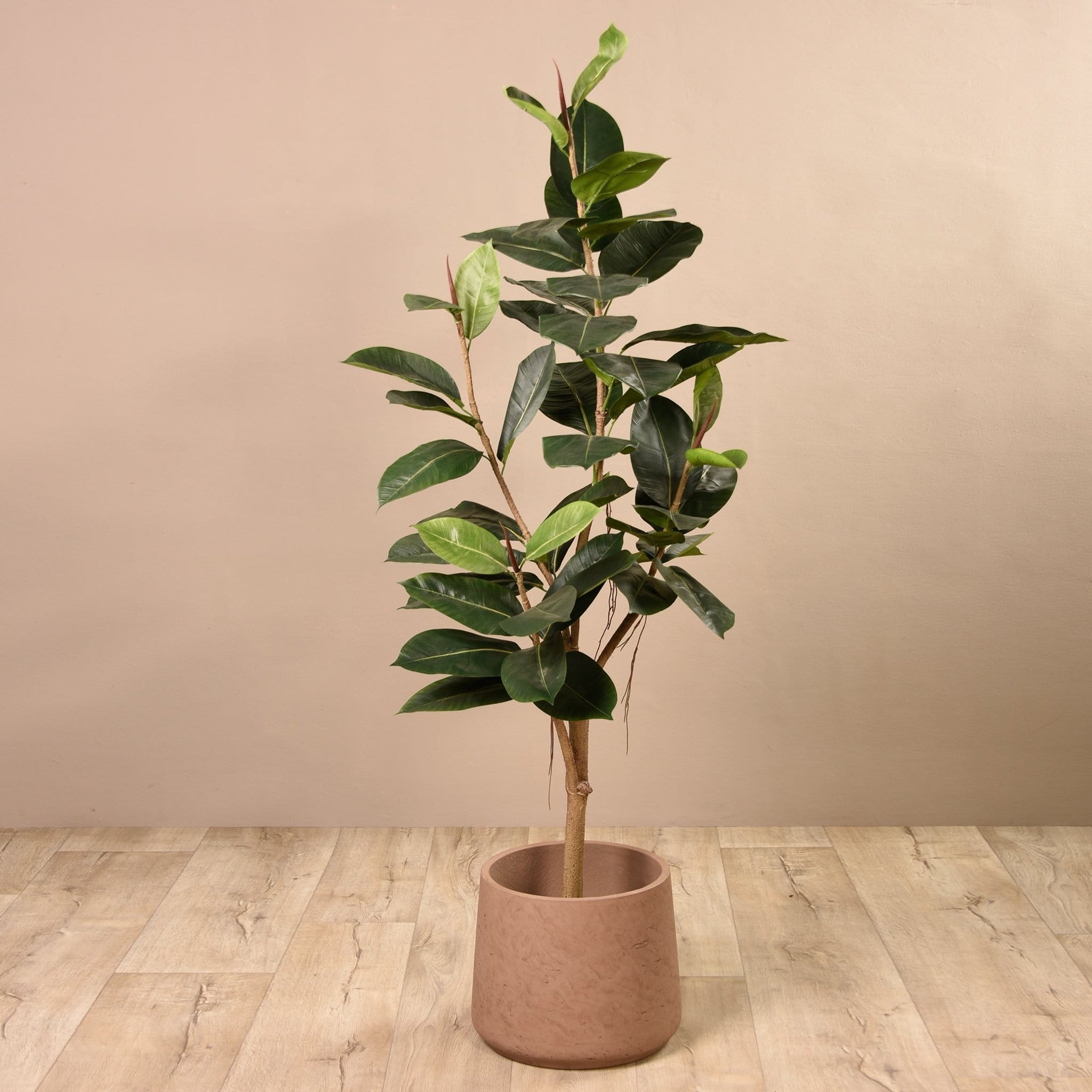 A symbol of abundance, happiness, and wealth, this artificial rubber plant just might bring good fortune to your home. This faux tree looks and feels astonishingly real without requiring any of the maintenance of an indoor plant. Place it in an empty corner of your home to bring life to the space. Simply bend out its branches and place it in a pot of your choice to complete the look.